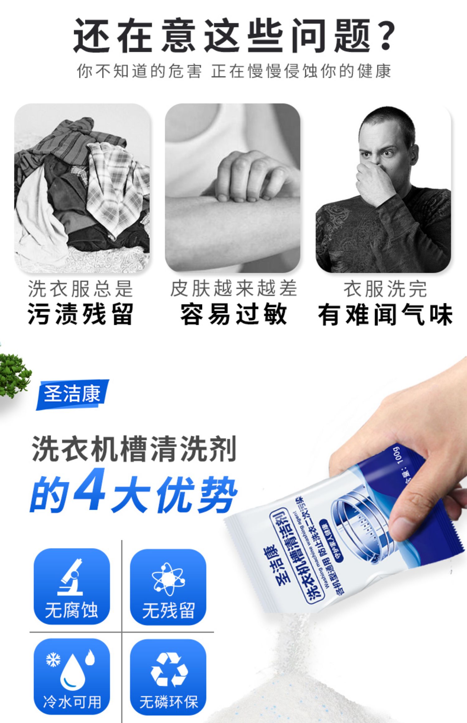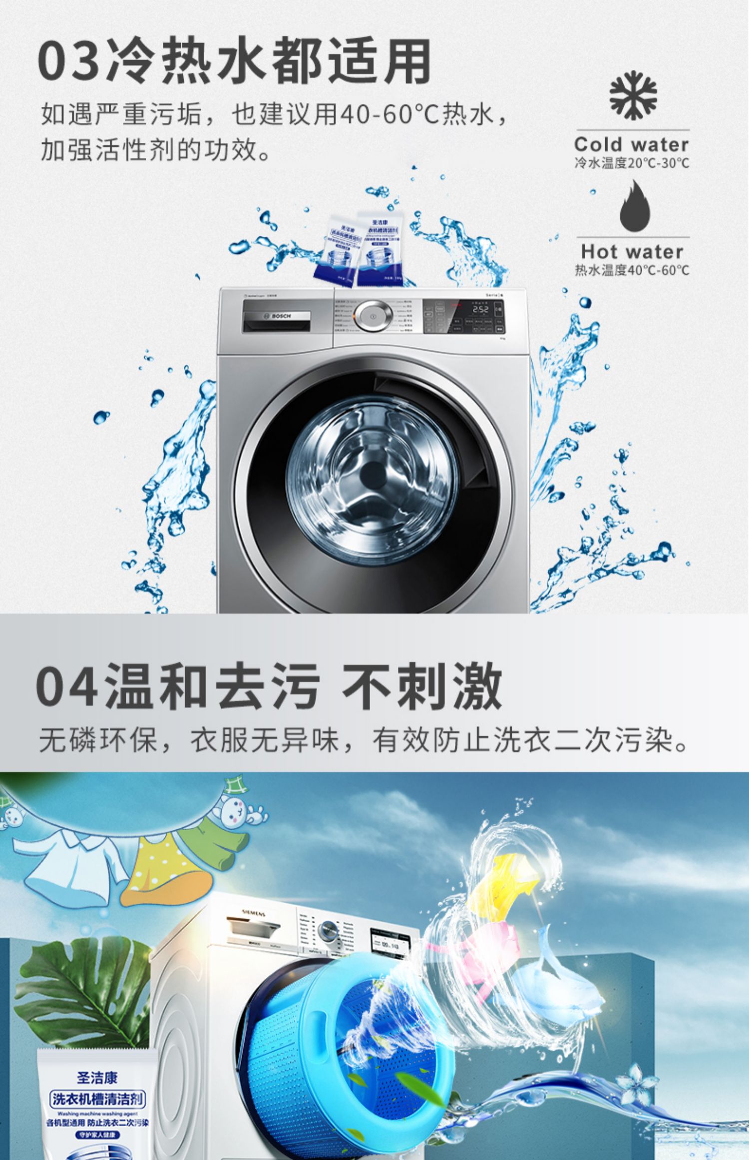【4袋400g超值】圣洁康洗衣机槽清洗剂,强力深层清洁洗衣机槽、内筒、夹层的顽固污垢,迅速瓦解,杀菌消毒,消除异味,防止衣物的二次污染,适用所有机型,是家家必备的清洁神器!