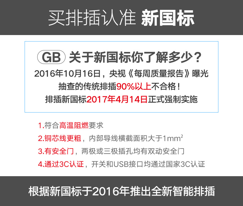 新国标插座,安全新时代!独立USB,充电模块,可拆出,可单独使用。迷你充电模块,方便快捷,出去旅游再也不怕没电了,儿童安全门防护隔绝触电,多规格线长可选!满足不同需求!重要的是安全!三年质保!