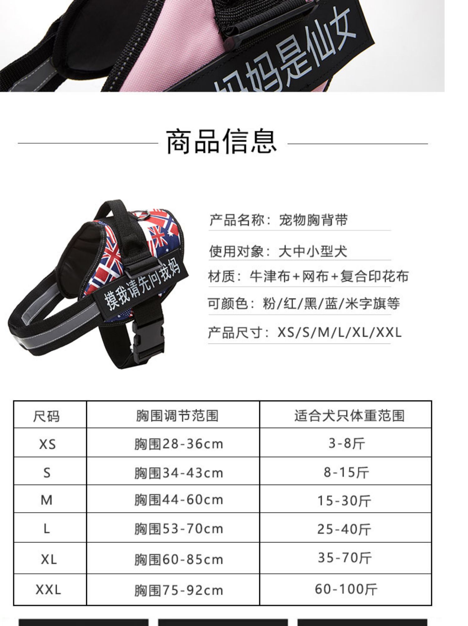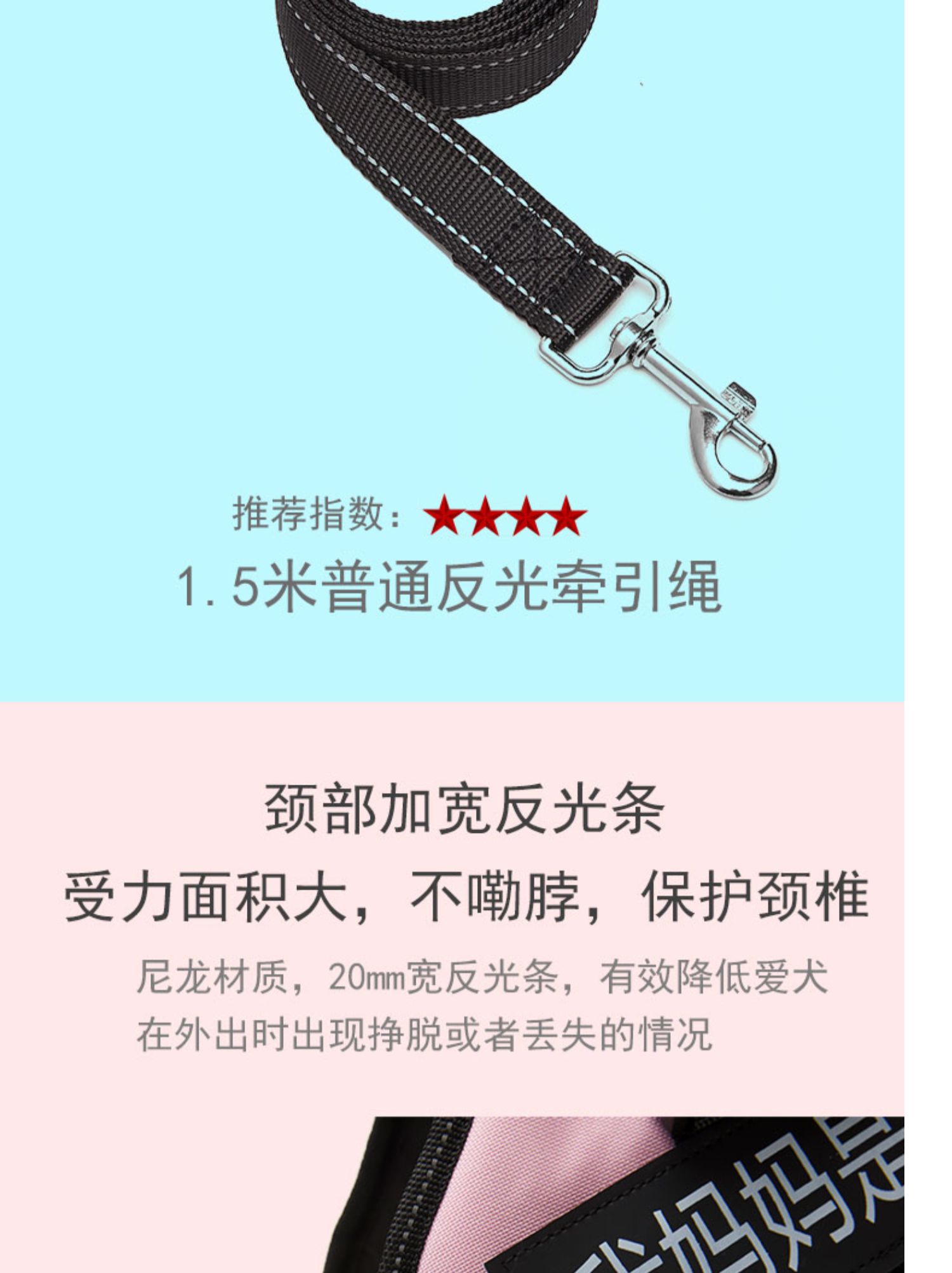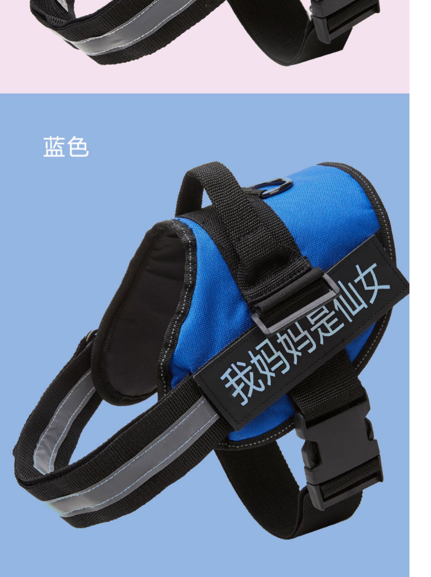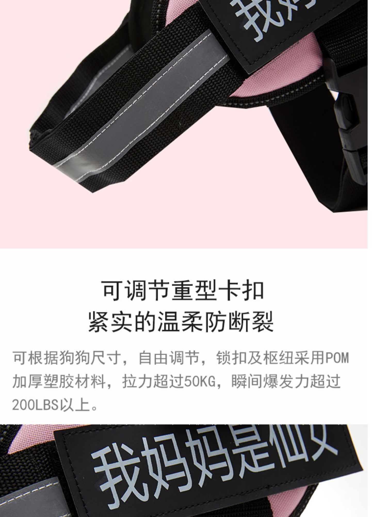 赠美容刷+铃铛+字帖+1.5米牵引绳!!全犬种可用防爆冲护胸,宠物胸背采用高密度牛津布+尼龙织带制作,使用便捷耐用,背部防爆冲D环设计,织带反光材质,使夜间行走安全性得到提升。