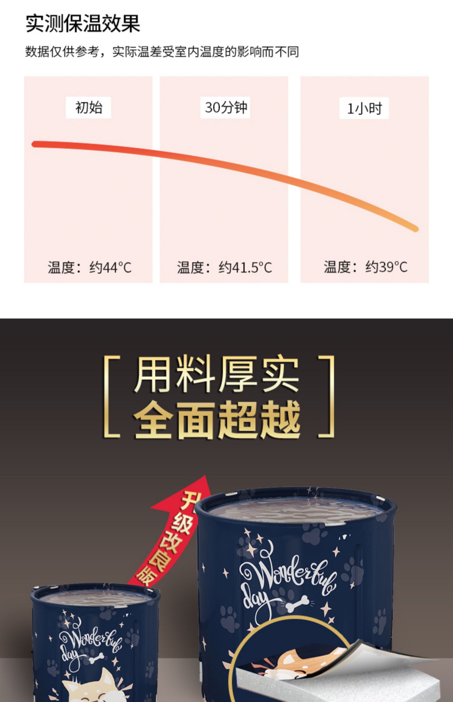 加厚折叠浴桶,组装更轻松,材质柔韧性好,加厚夹棉持久保温便捷泡澡舒适,放松身心舒适沐浴,丢掉压力,享受生活乐趣,适合全家年轻老小。