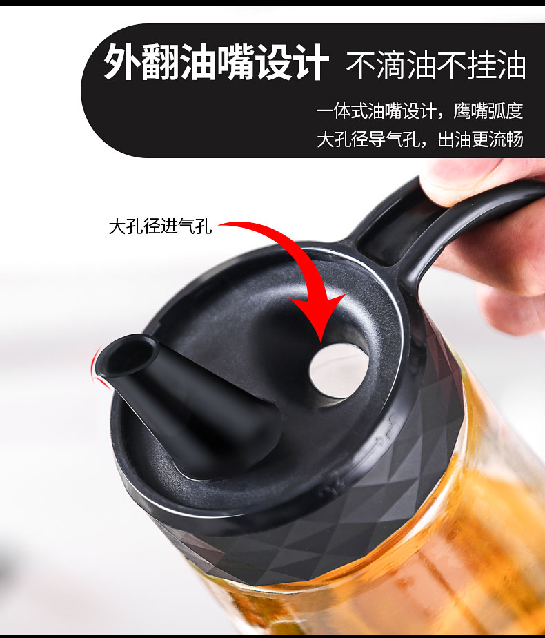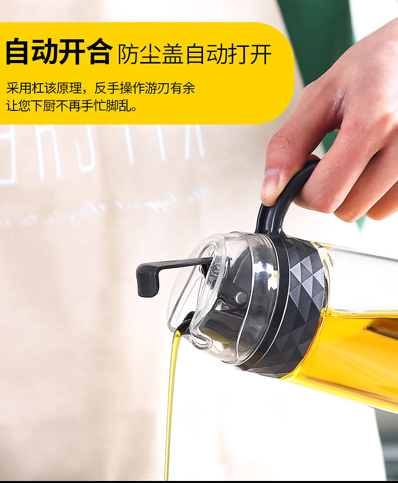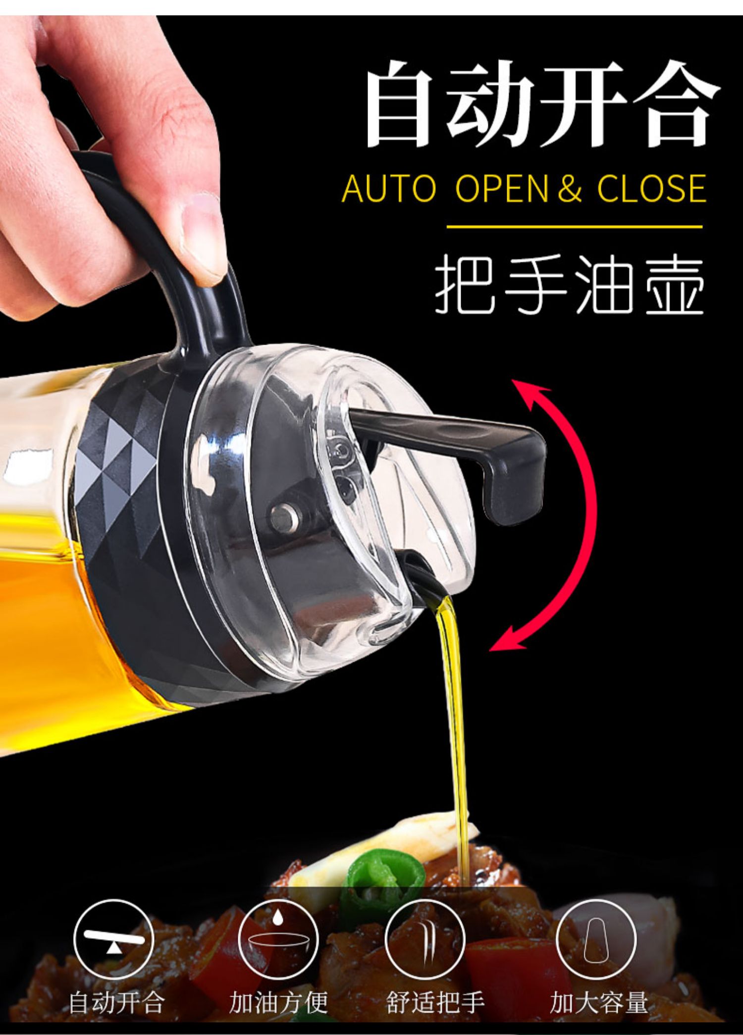 大容量玻璃油壶酱油醋壶,耐腐蚀,易清洗,倾斜自动开合盖,不挂油不漏油,放平自动闭合,人性化设计,方便实用。