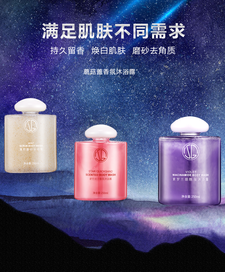 嫩白肌肤,提亮肤色,留香为辅,高颜值星空流沙金持久留香男女香水沐浴露,深层清洁,温和护肤,邂逅留香的你,2种满足肌肤的不同需求,更有烟酰胺亮白肌肤成分