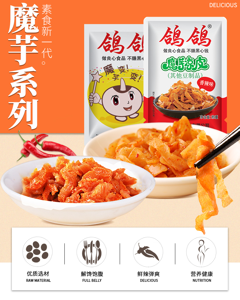 鸽鸽魔芋脆丝,美味素食劲道爽口,优质食材,用心甄选,独立真空小包装,更方便,更卫生,更安全