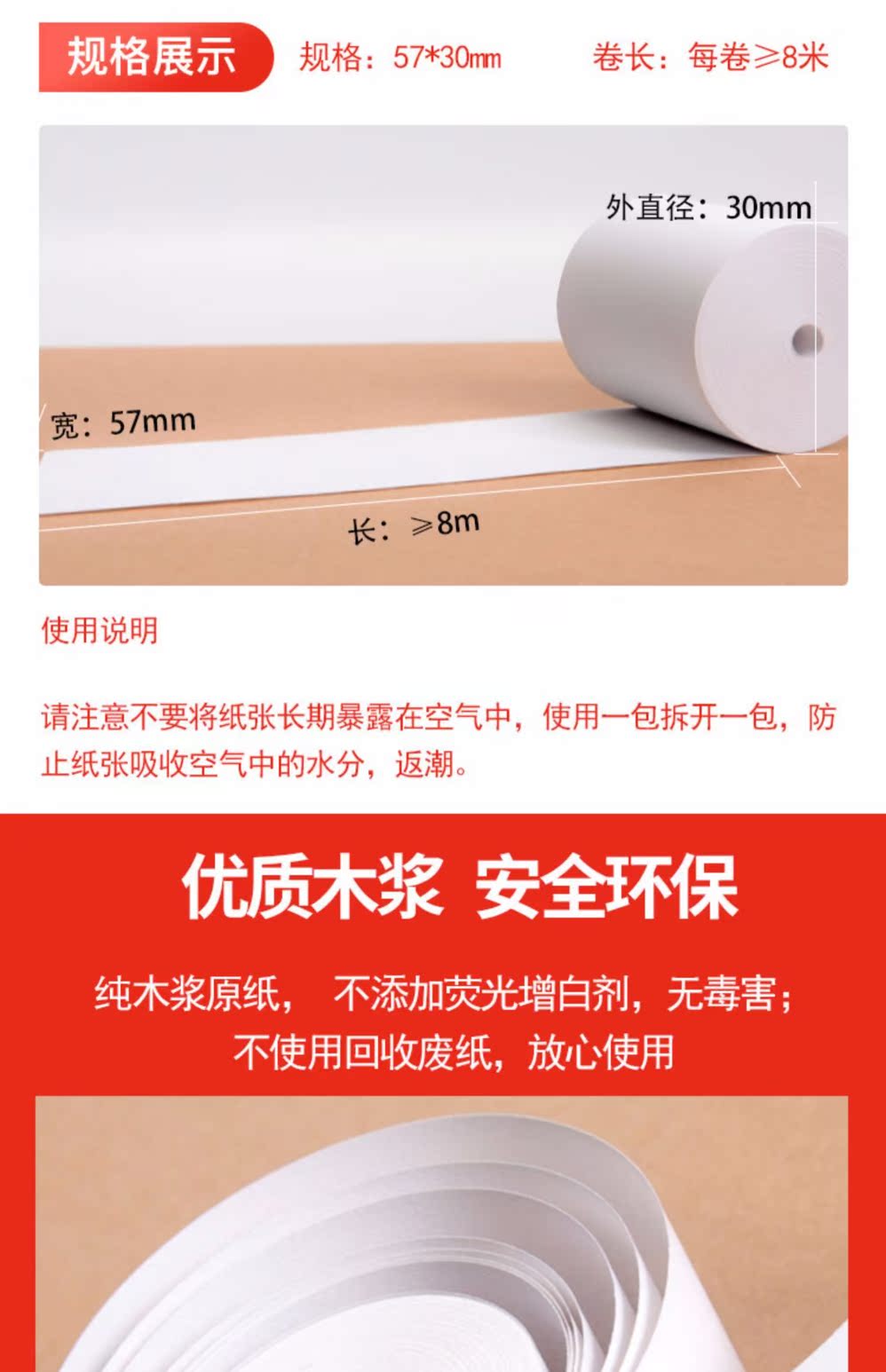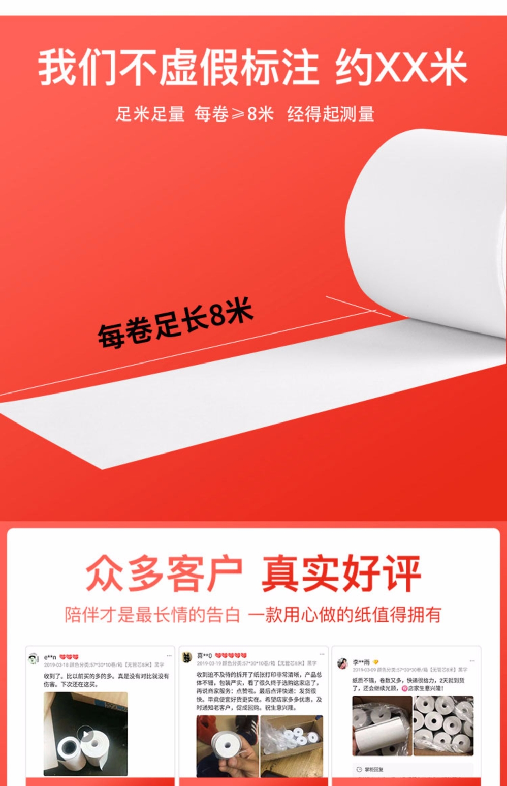 【券后10卷仅售5.1元】】选用优质纯木浆,纸面亮白光滑,端面平整不卡纸,热敏涂层均匀,不易粘涂打印头,显色后保存时间长,无管芯,纸更长,用心做好产品