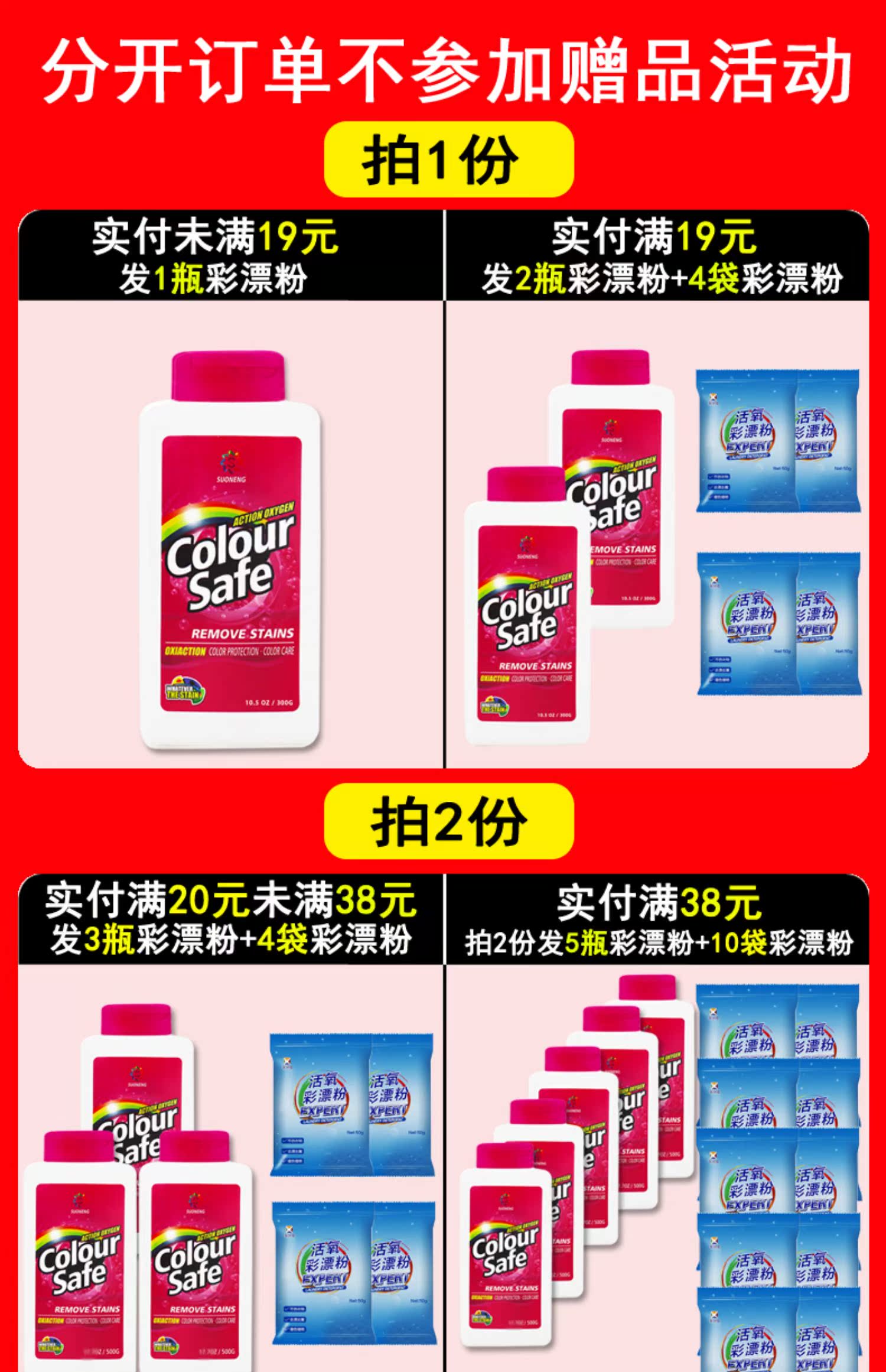 去污神器彩漂剂,除霉去污柔顺衣物,多效一体;活氧酵素不伤手还能除菌抑菌;白色、彩色衣物都能用,一漂炫彩白净~