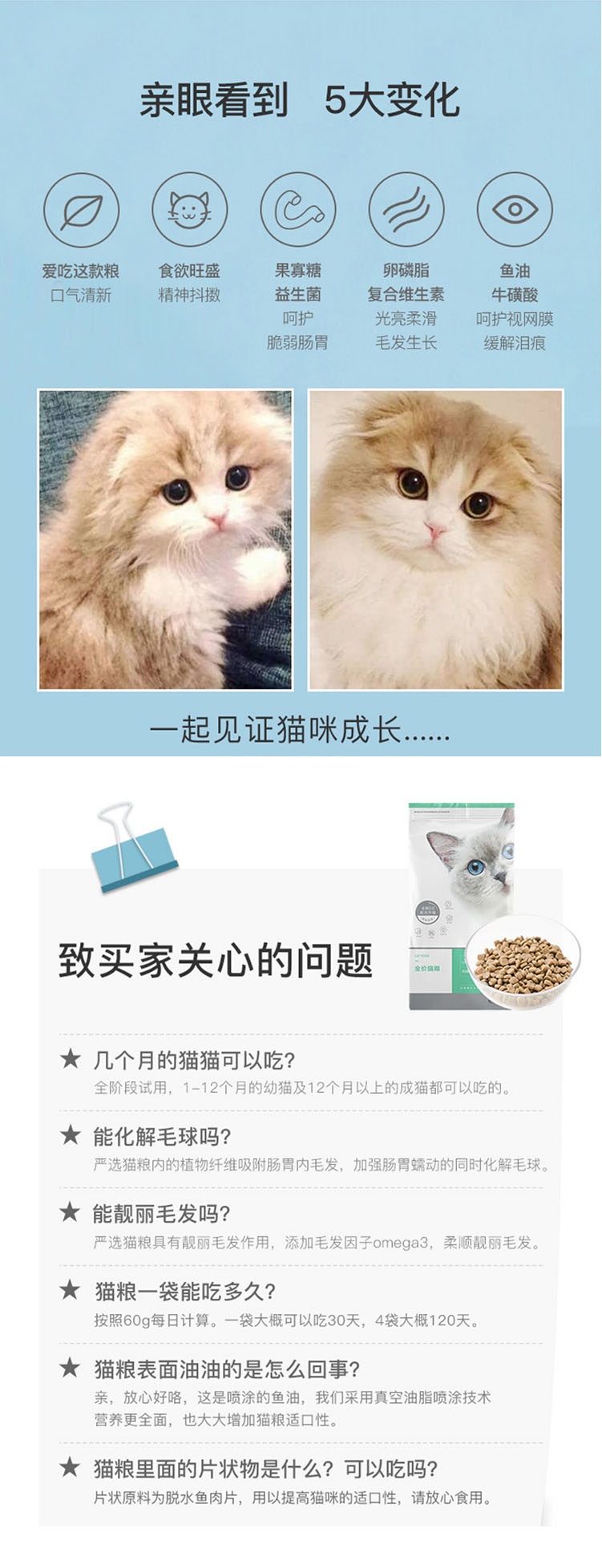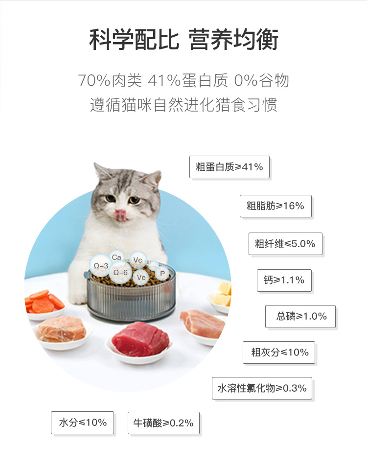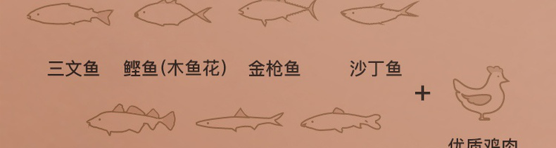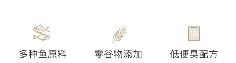多种鱼原料,优质肉类蛋白,0谷物添加,减少碳水摄入,低敏易消化,缓解便臭养肠胃