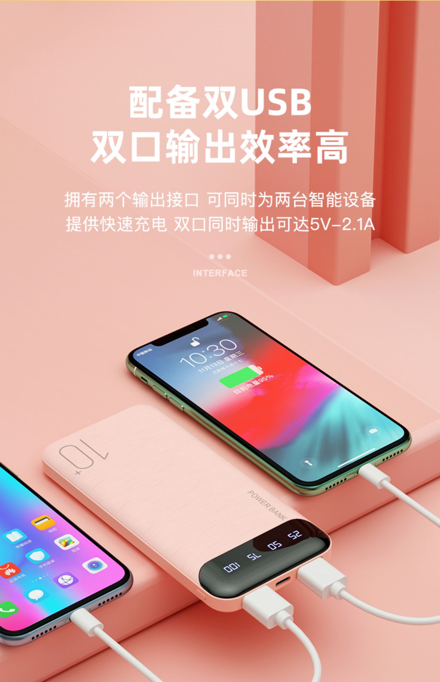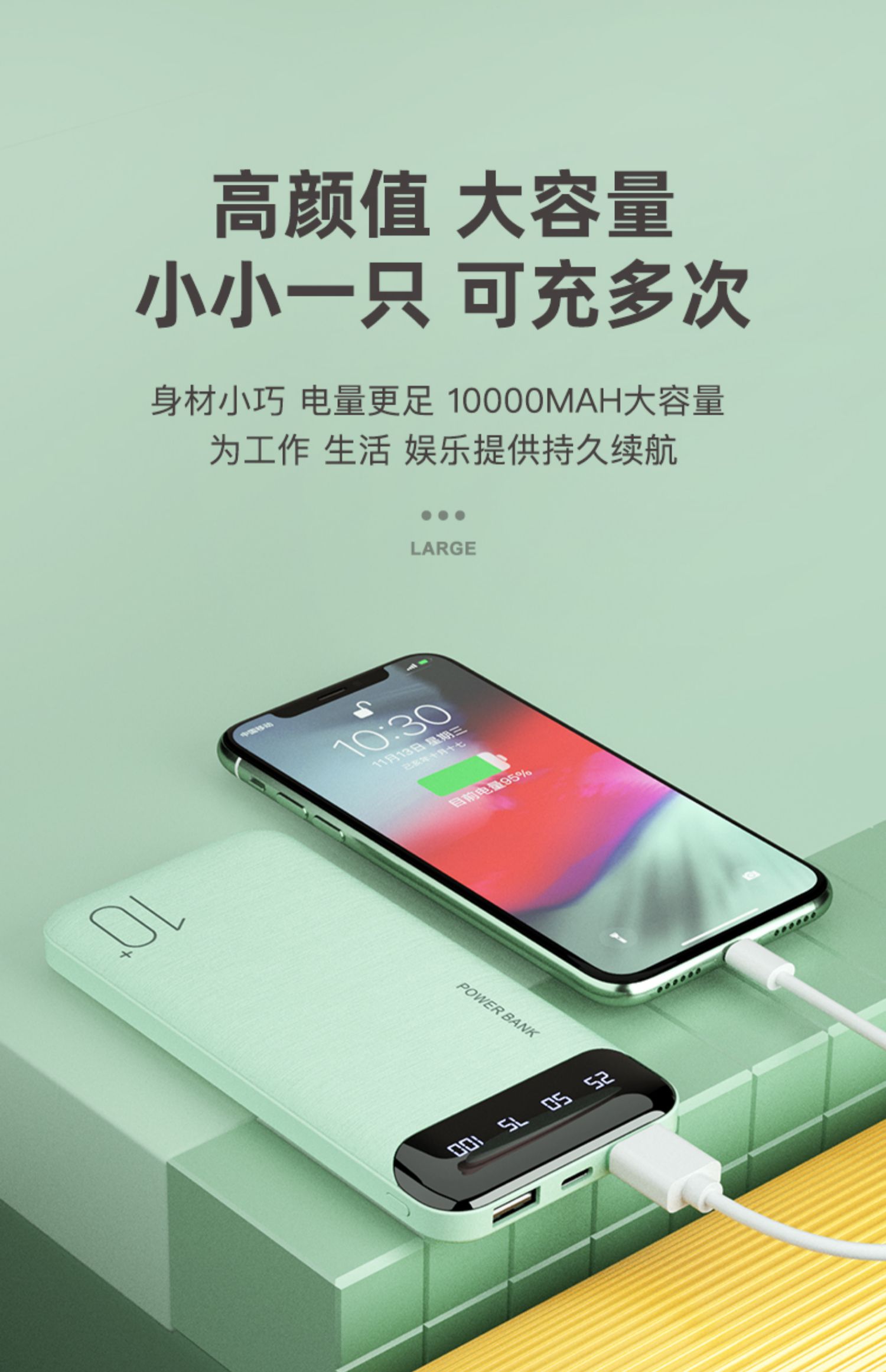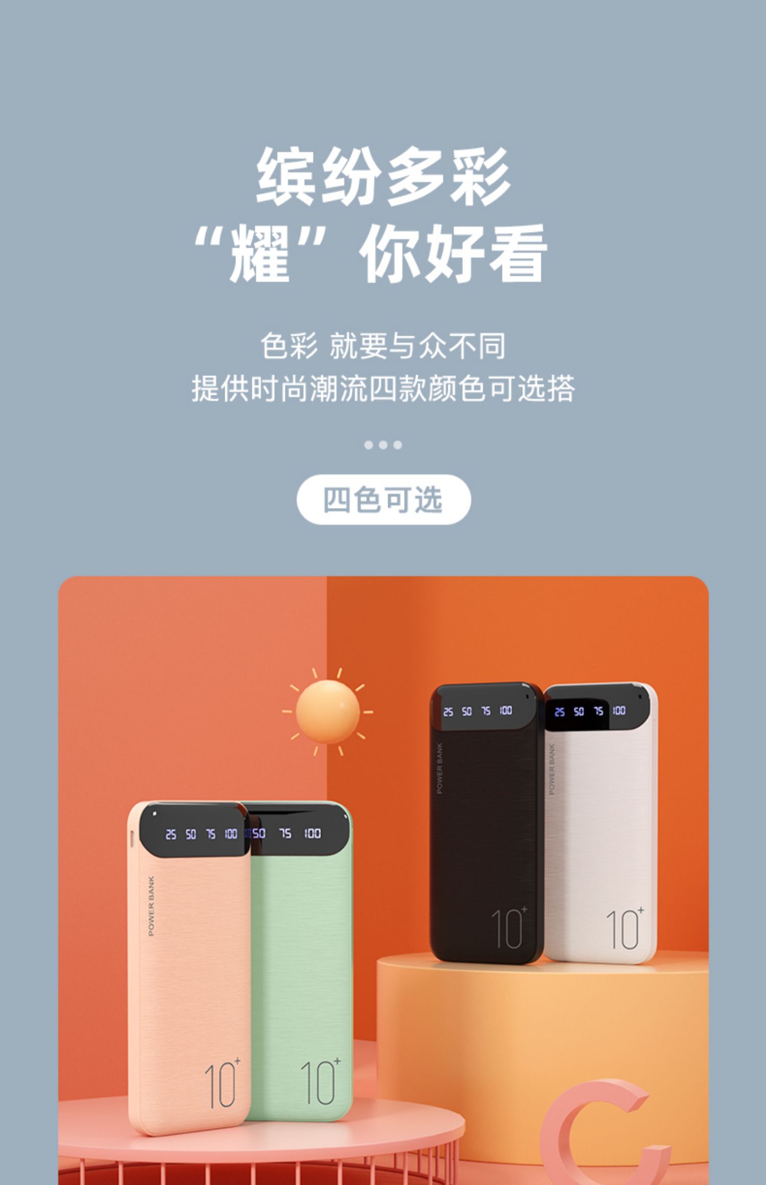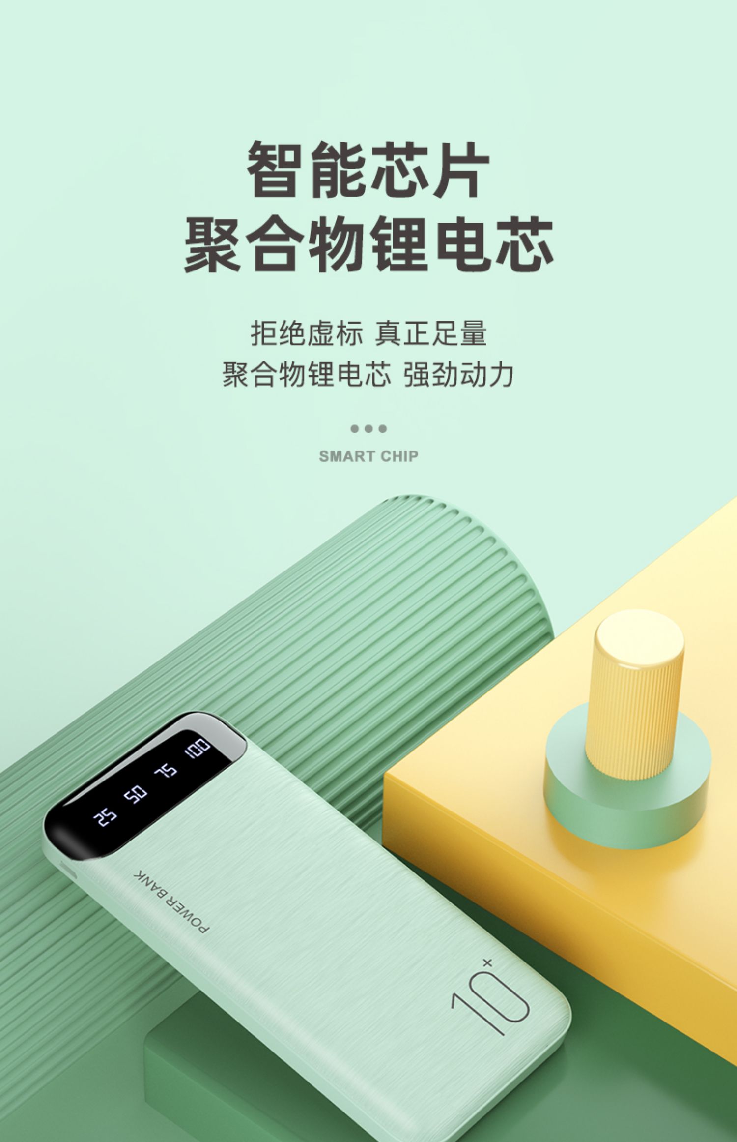 电量不吹虚的,我们实打实10000毫安!聚合物电芯品质过硬,双USB输出,小巧便携。磨砂拉丝质地,手感舒适,轻奢质地超高级!
