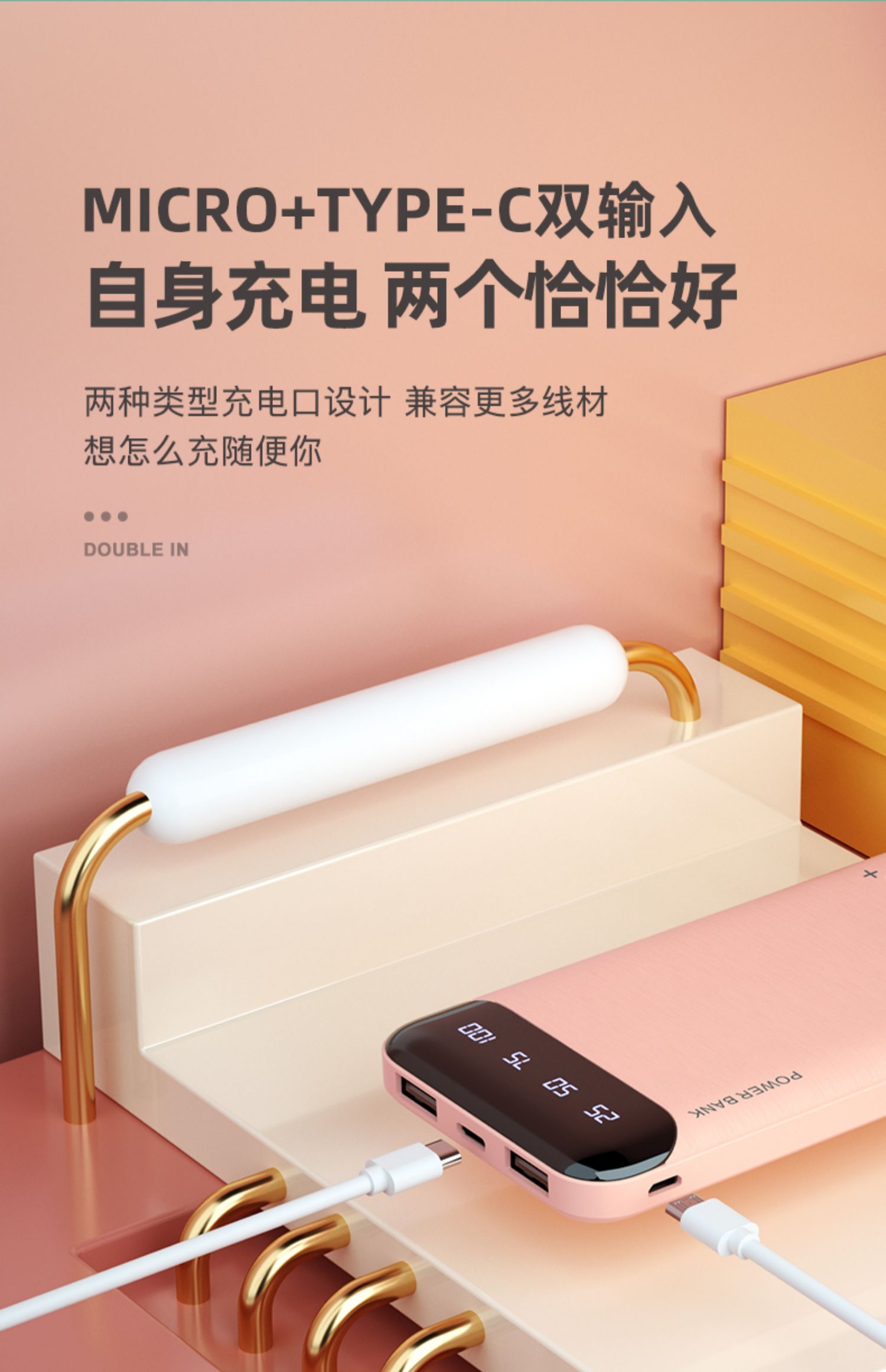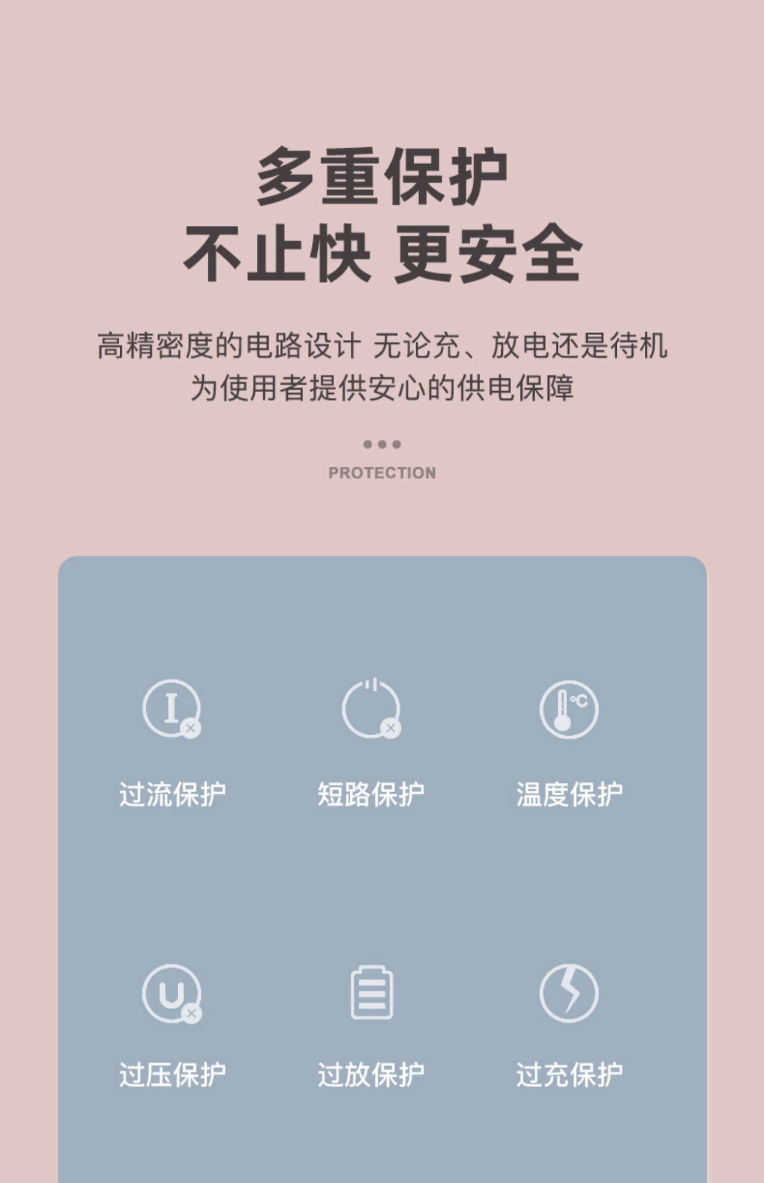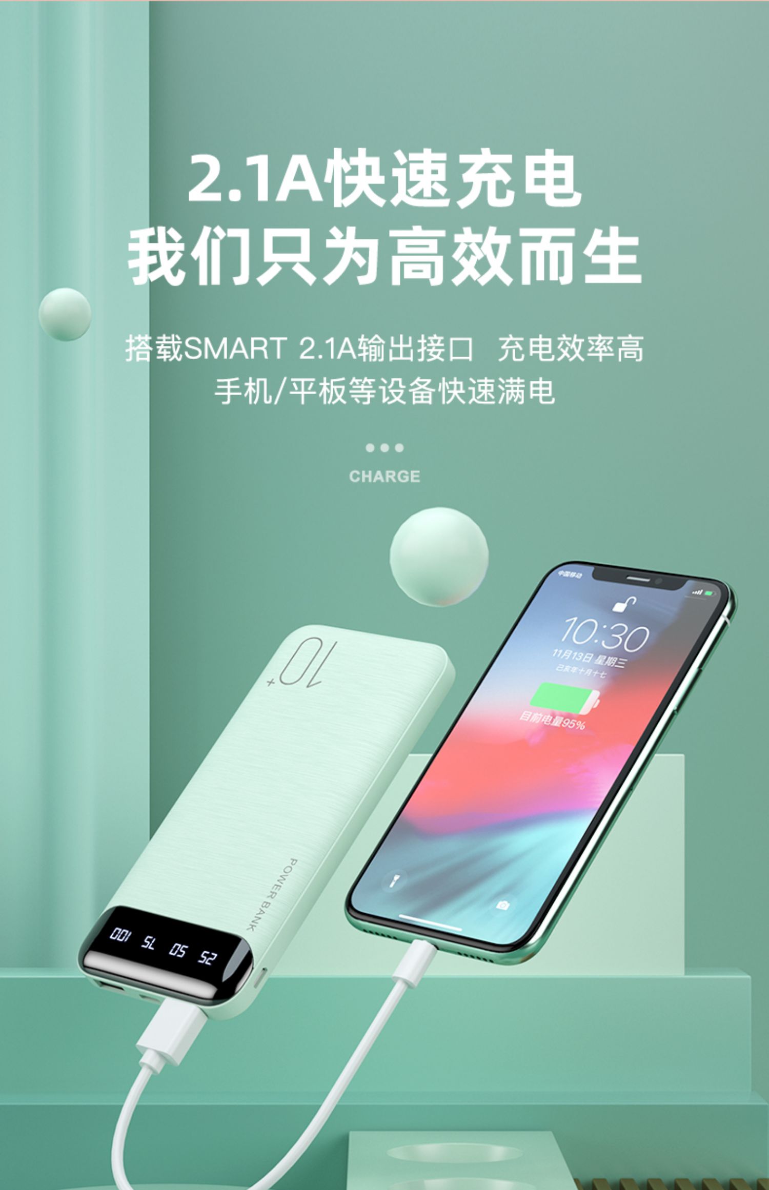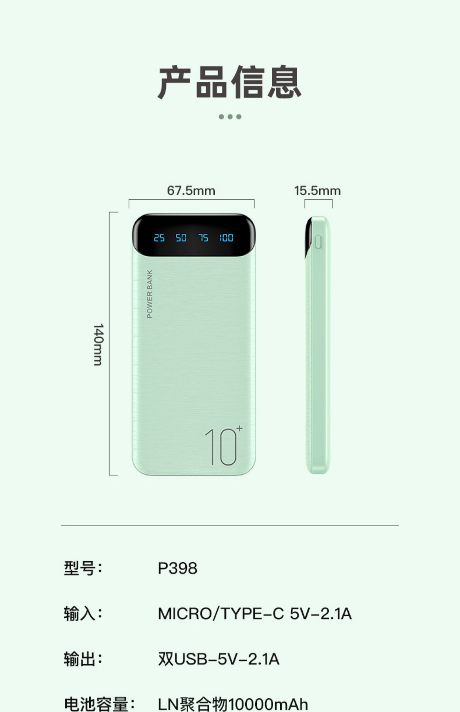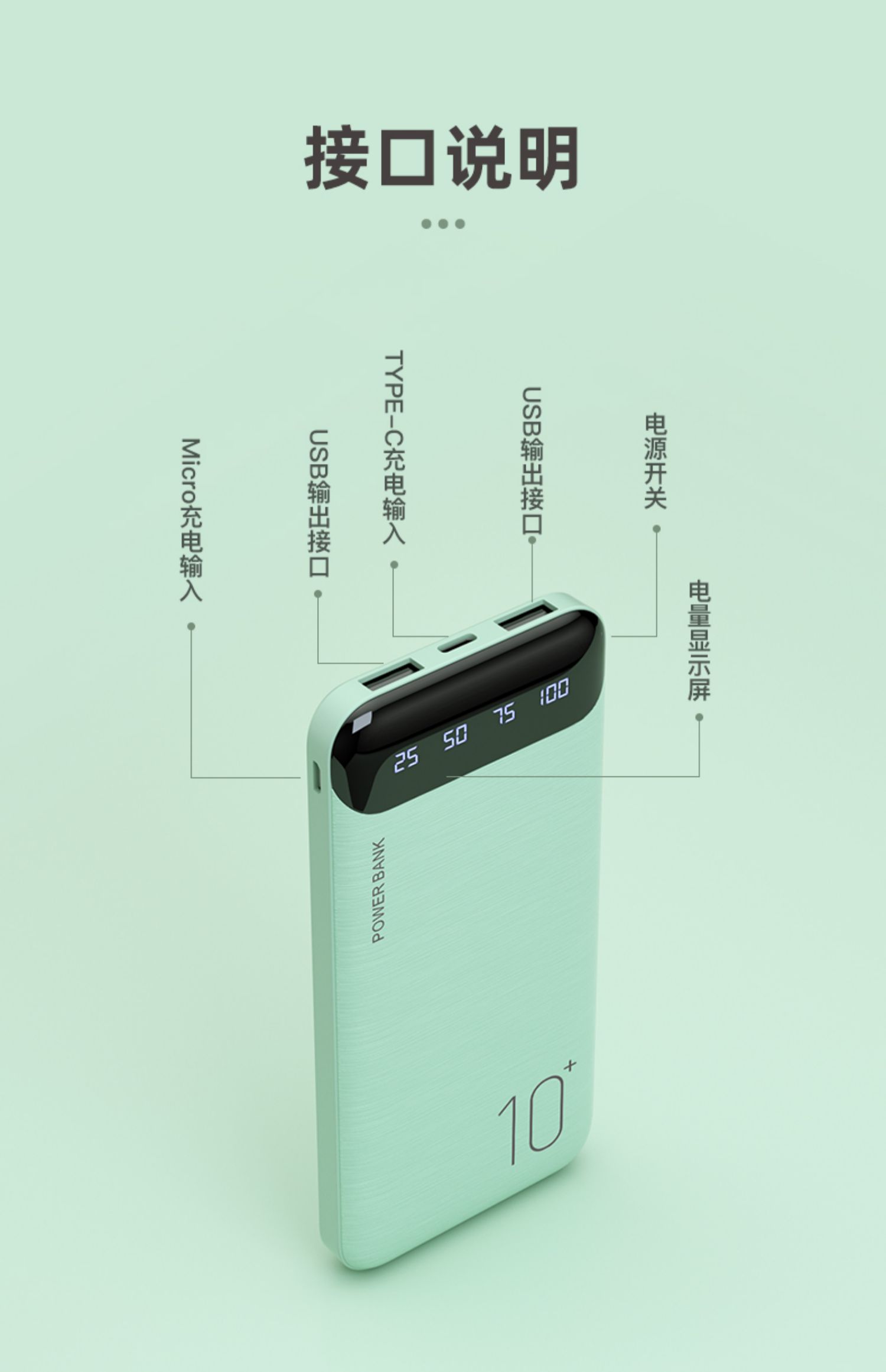 电量不吹虚的,我们实打实10000毫安!聚合物电芯品质过硬,双USB输出,小巧便携。磨砂拉丝质地,手感舒适,轻奢质地超高级!