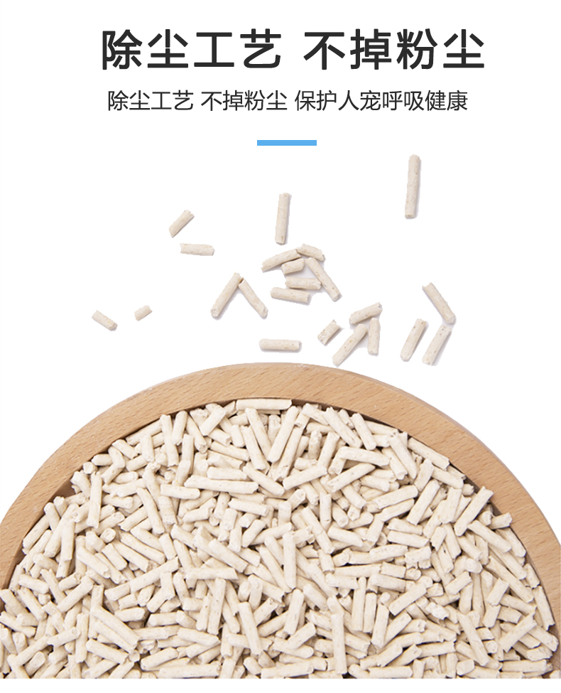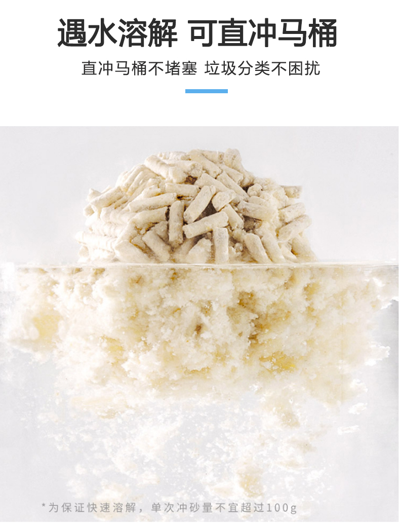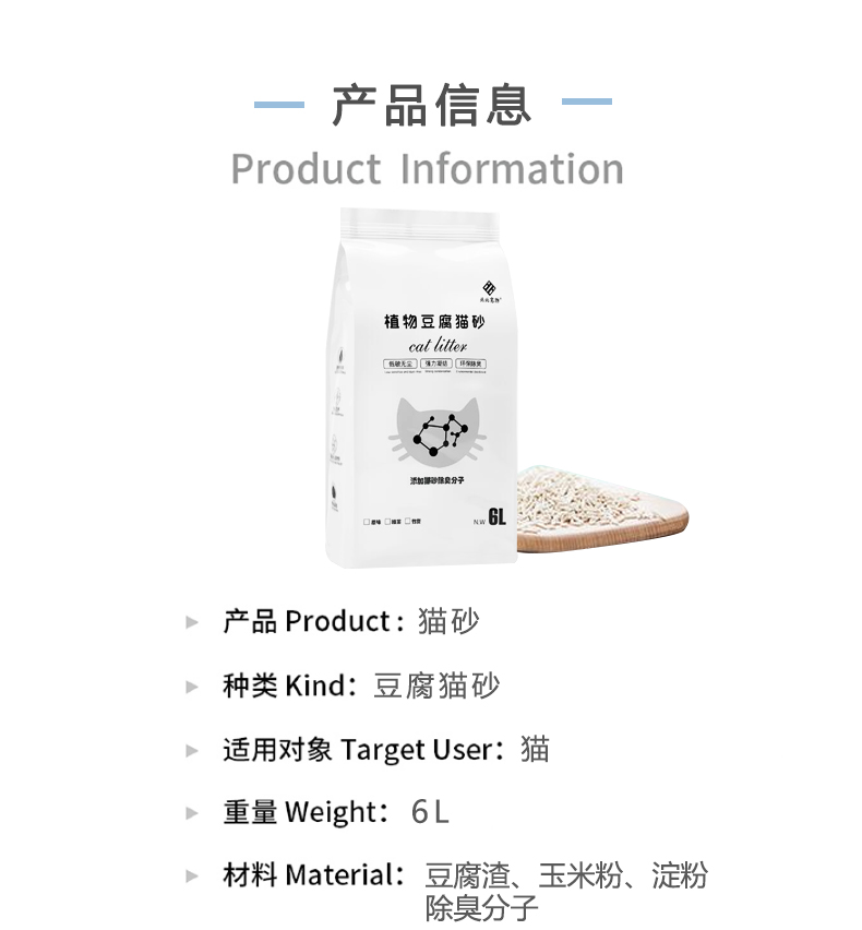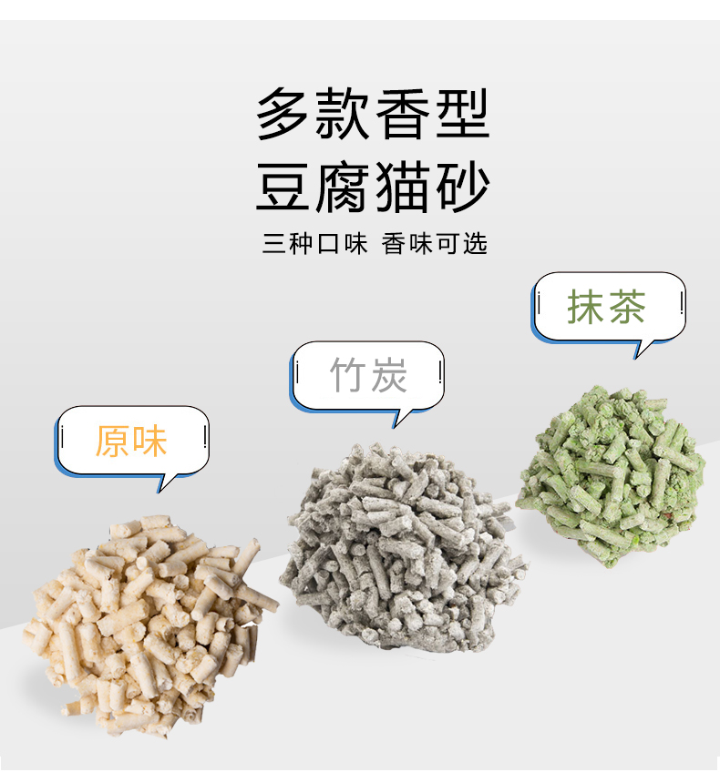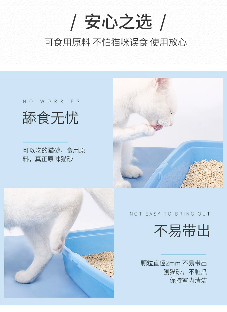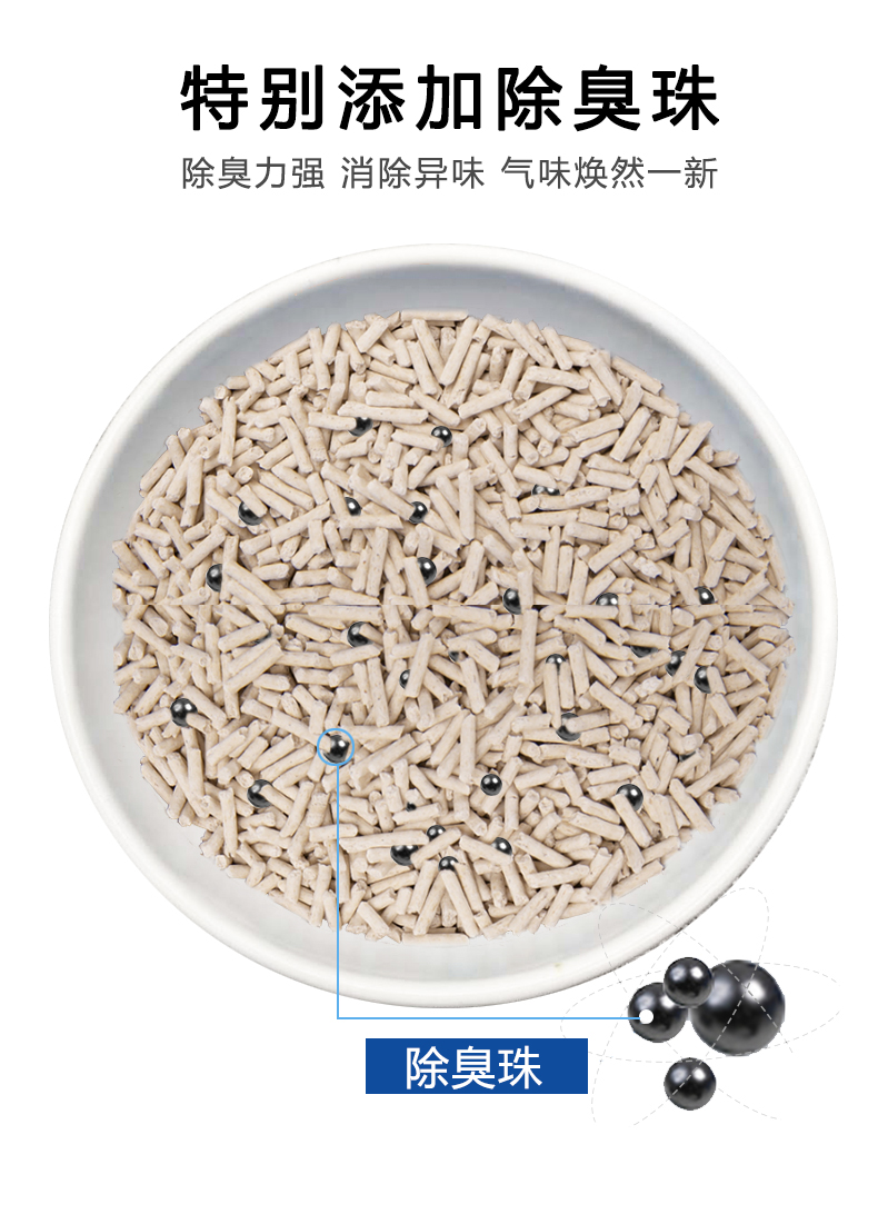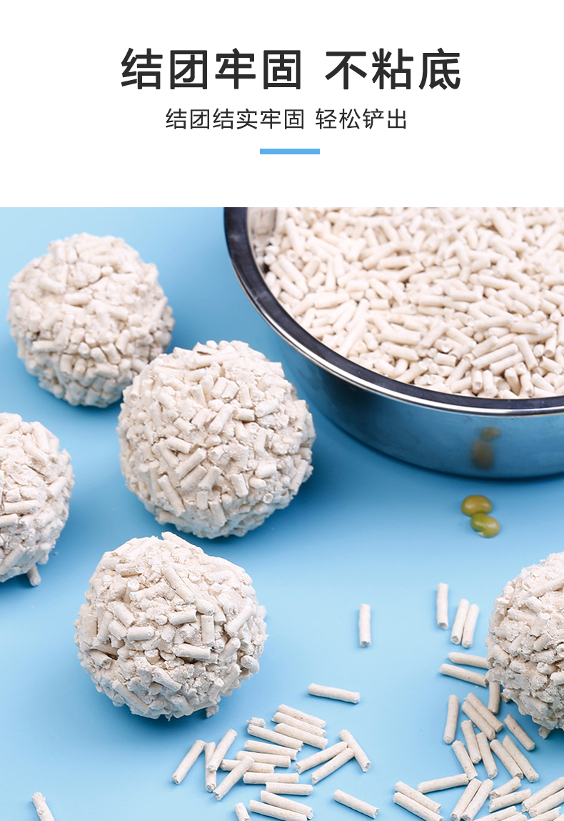 可食用级别原料,舔食无忧,特别添加除臭珠,消除异味,气味焕然一新,结团牢固不粘底,可直冲马桶