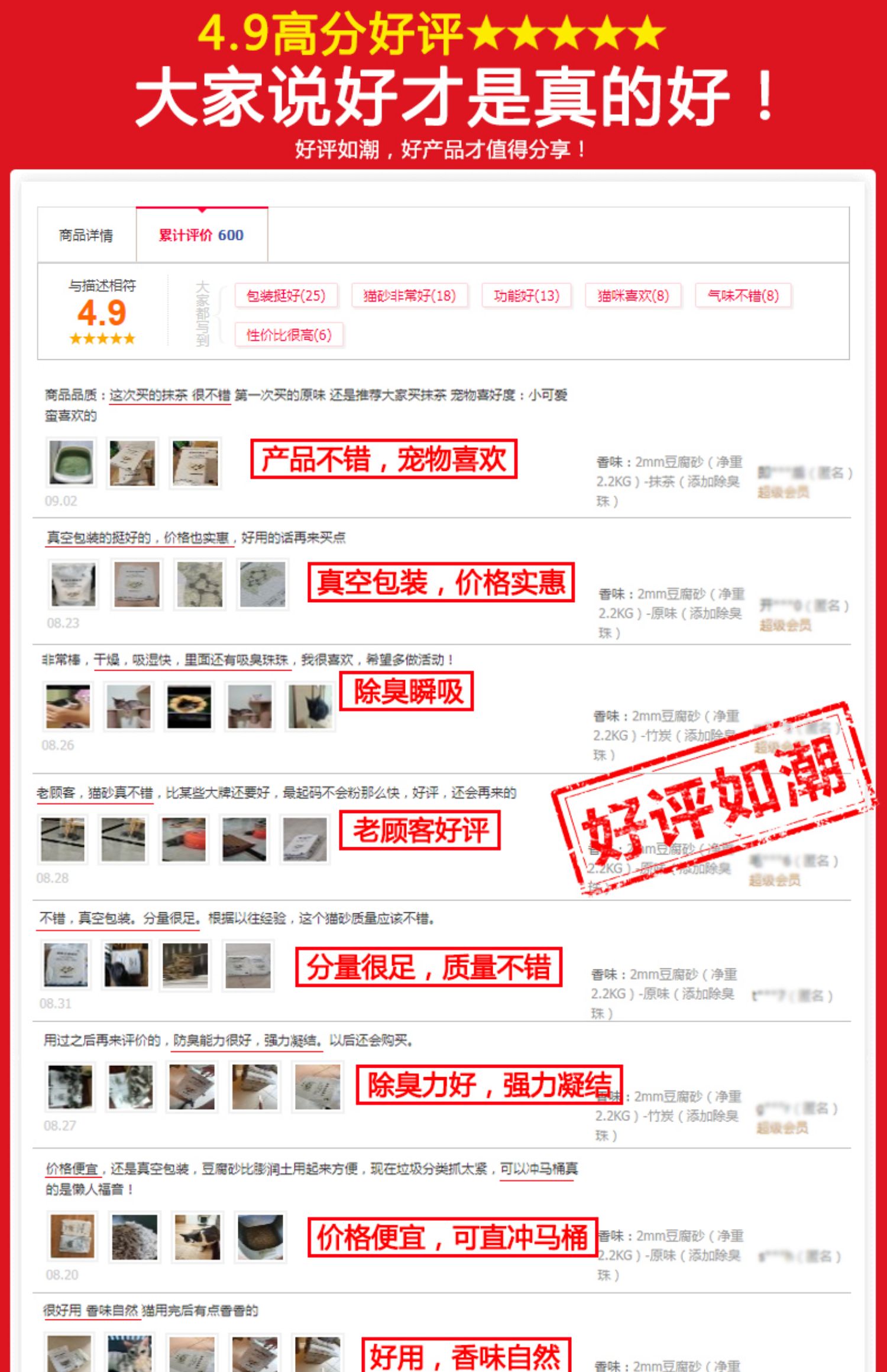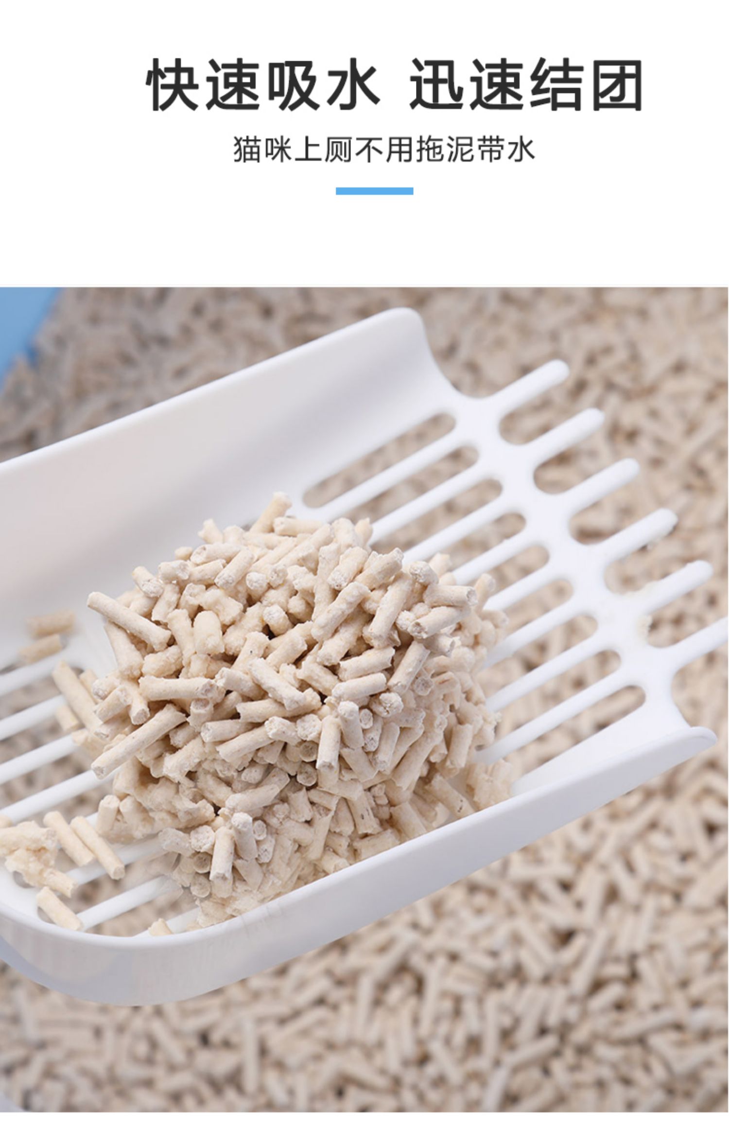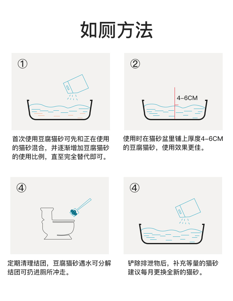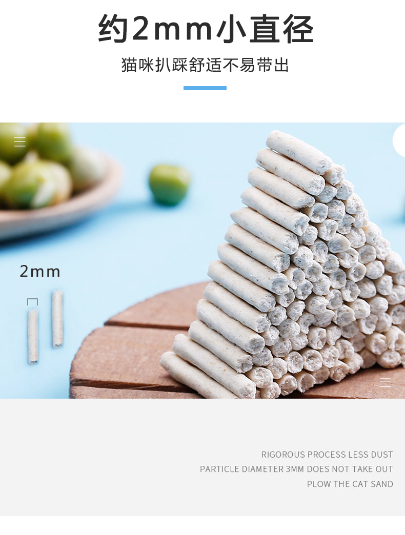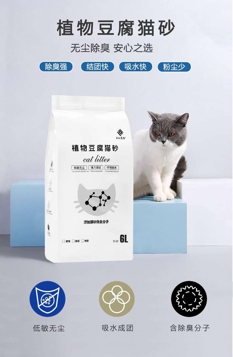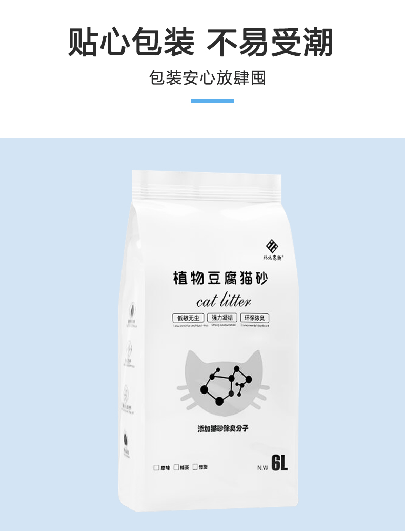 可食用级别原料,舔食无忧,特别添加除臭珠,消除异味,气味焕然一新,结团牢固不粘底,可直冲马桶