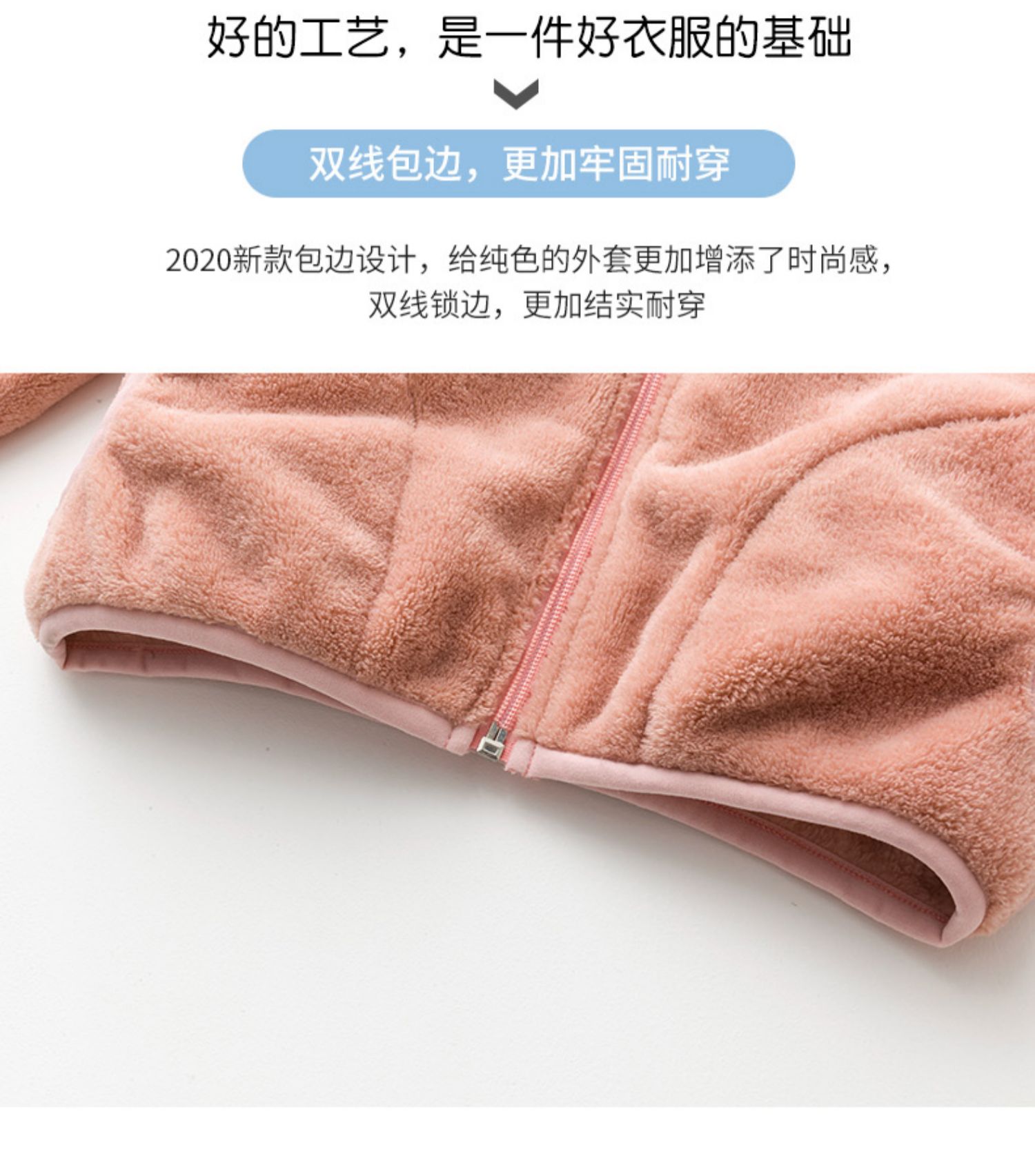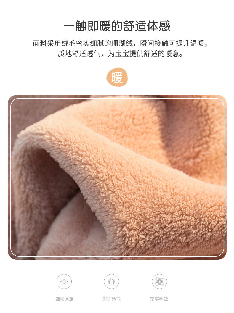 双面珊瑚绒,柔软亲肤,小立领设计,加绒加厚,防风保暖,不掉绒不掉色,给宝宝冬日里温暖的呵护!