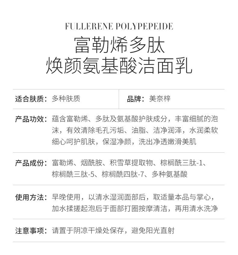 【美奈梓】蕴含富勒烯,多肽及氨基酸护肤成分,早晚使用,适合多种肤质,有效清除毛孔污垢,油脂,保湿净颜,洗出净透嫩滑美肌!!!