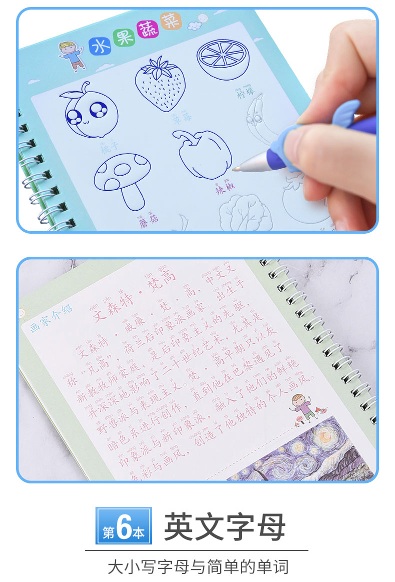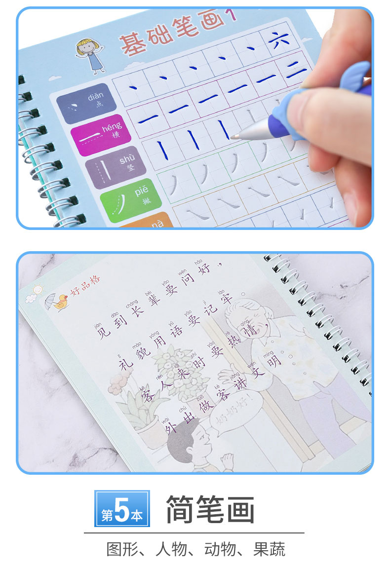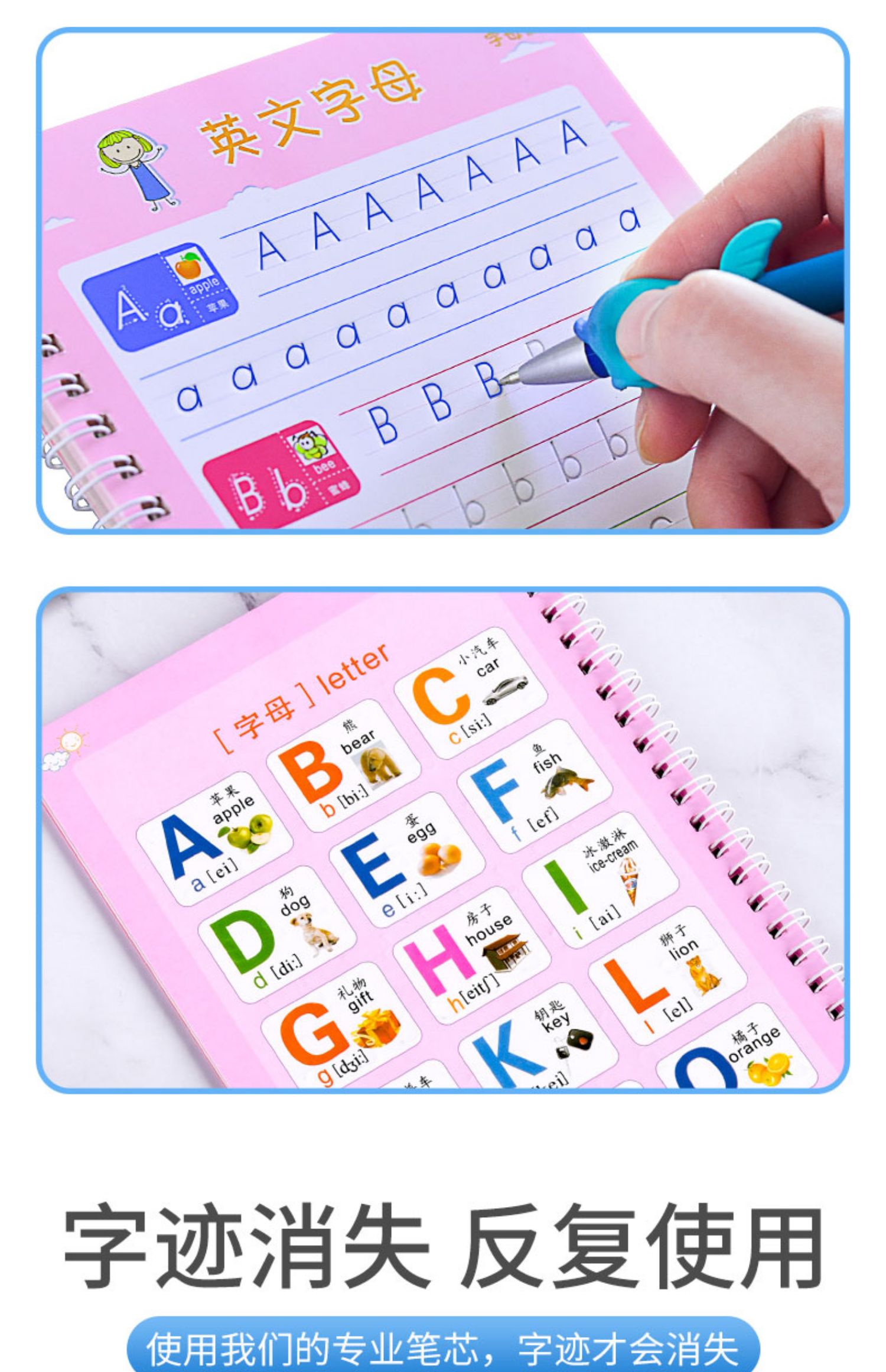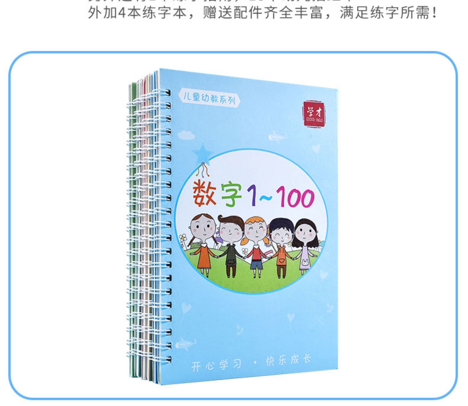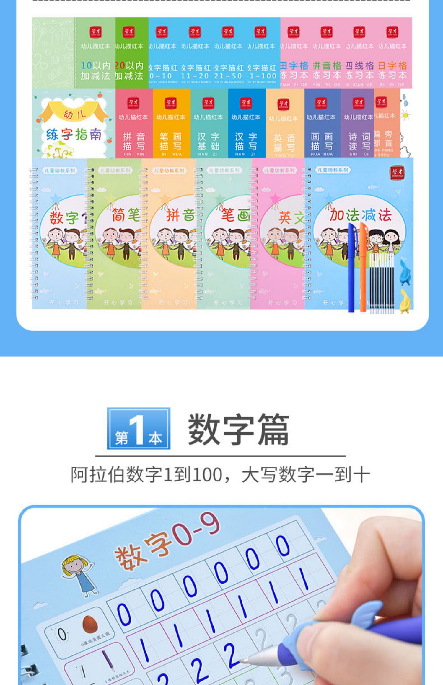 【字帖,握笔器,笔】全套学前字帖,字帖大小、内容正适合学前宝宝使用,印刷清晰,纸张厚实,练字帖的凹槽设计,专用笔芯出水流畅,30分钟字迹消失,可反复使用。