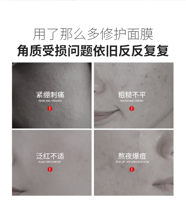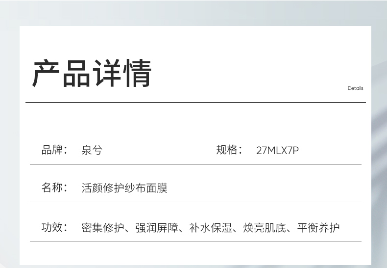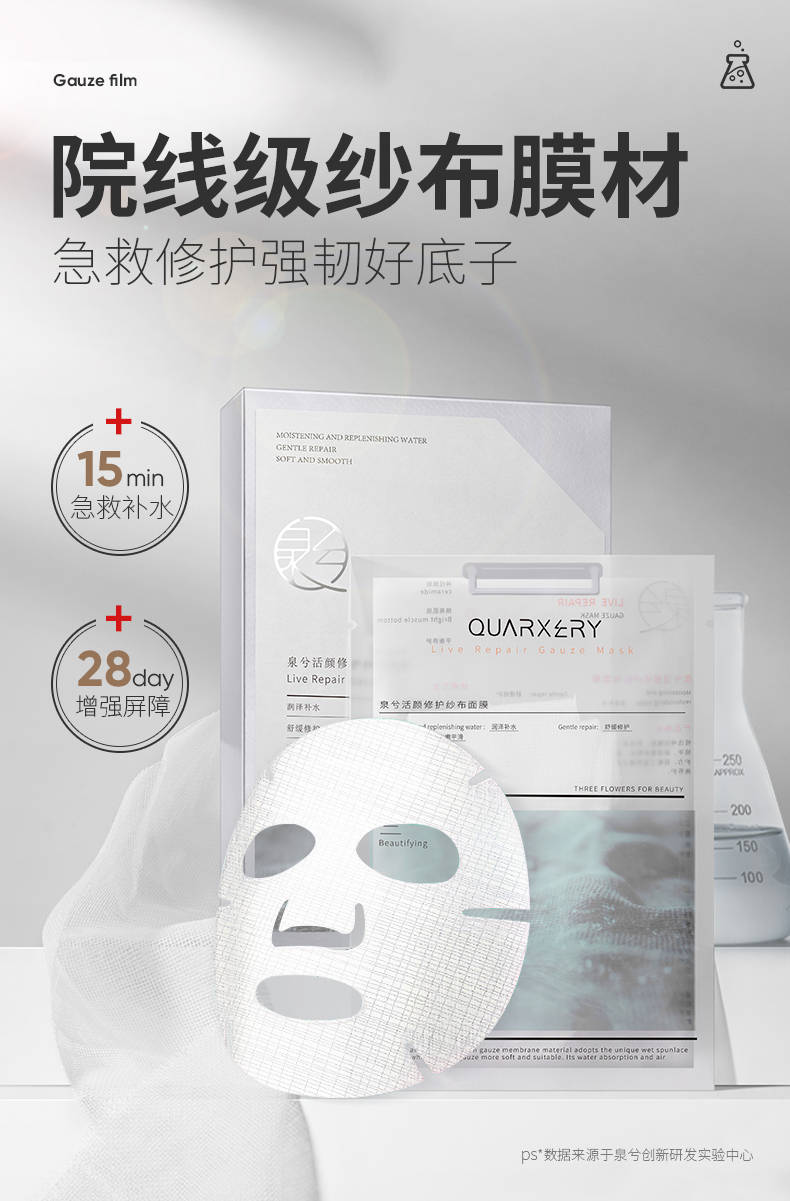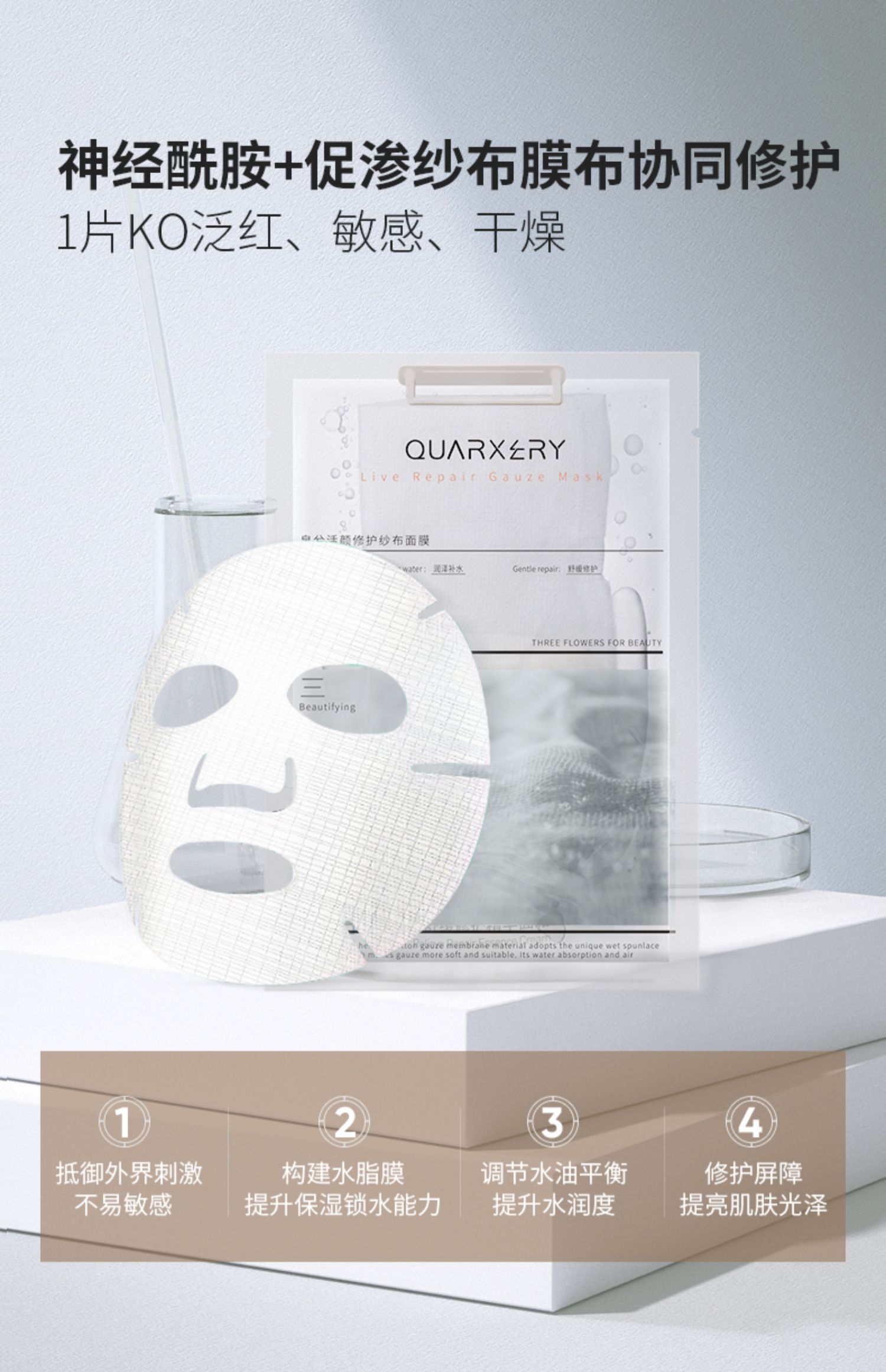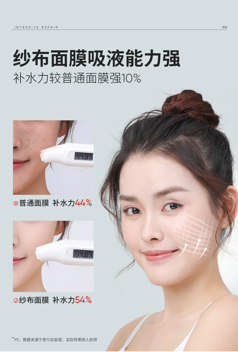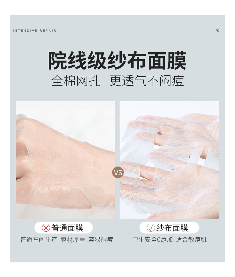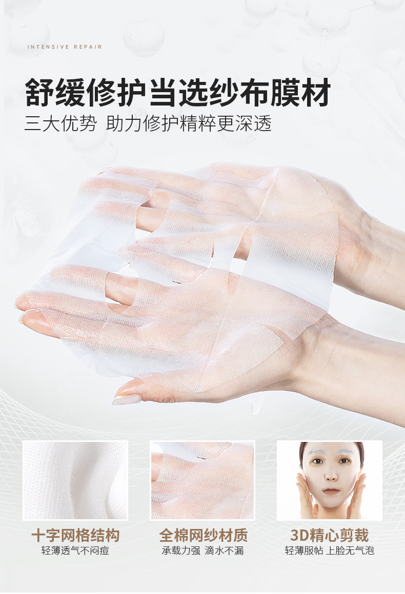 绵柔纱布膜材,绵柔亲肤透气服帖,吸纳更多精华,祛痘舒缓,复配新型祛痘剂,温和祛痘,舒缓肌肤不适感,防痘淡印,预防痘痘,多效修护肌肤屏障。