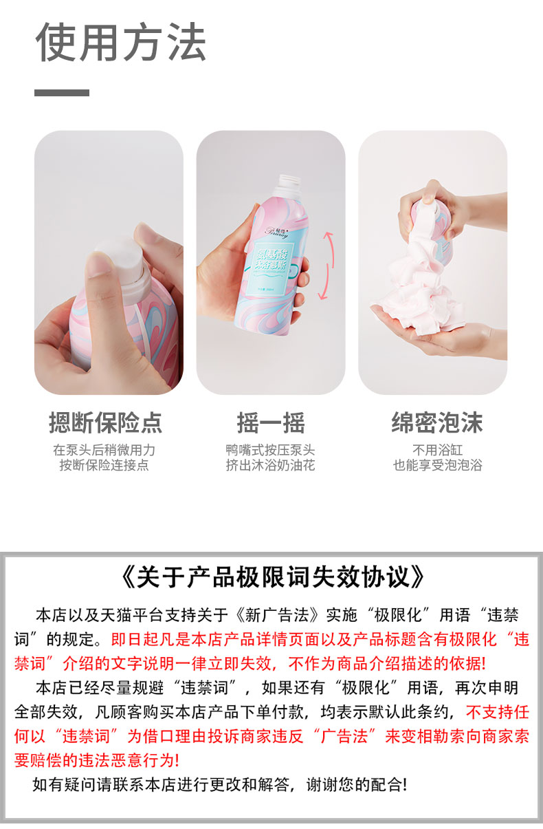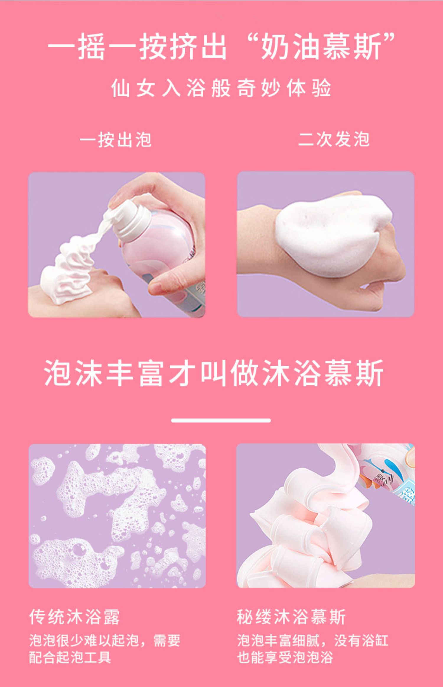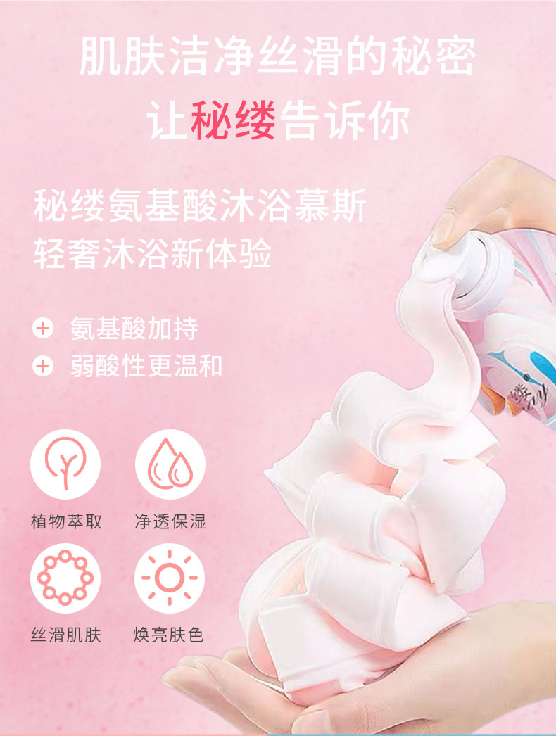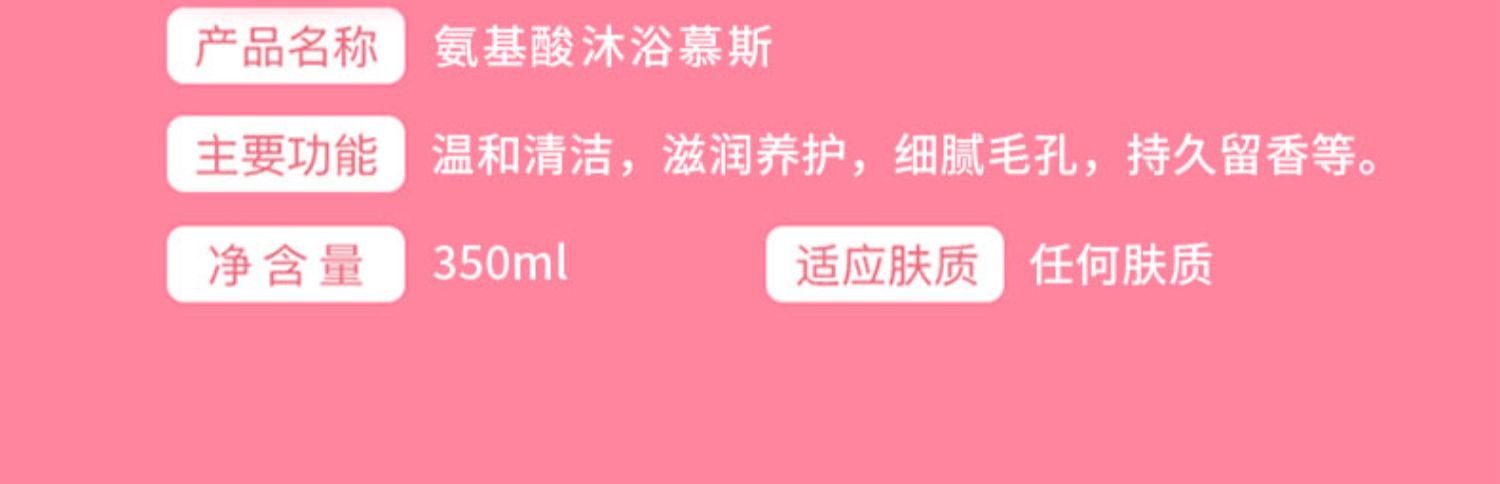 氨基酸慕斯泡泡沐浴露,48小时留香氨基酸保湿柔情沐浴露,泡沫丰盈绵密,不用浴缸也能享受泡泡浴,温和好冲洗滋润不假滑。多重植物提取精华,洗护合一,让皮肤保湿抗氧化,肌肤焕白透亮【赠运费险】