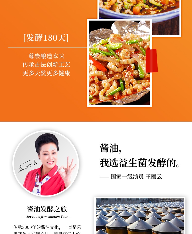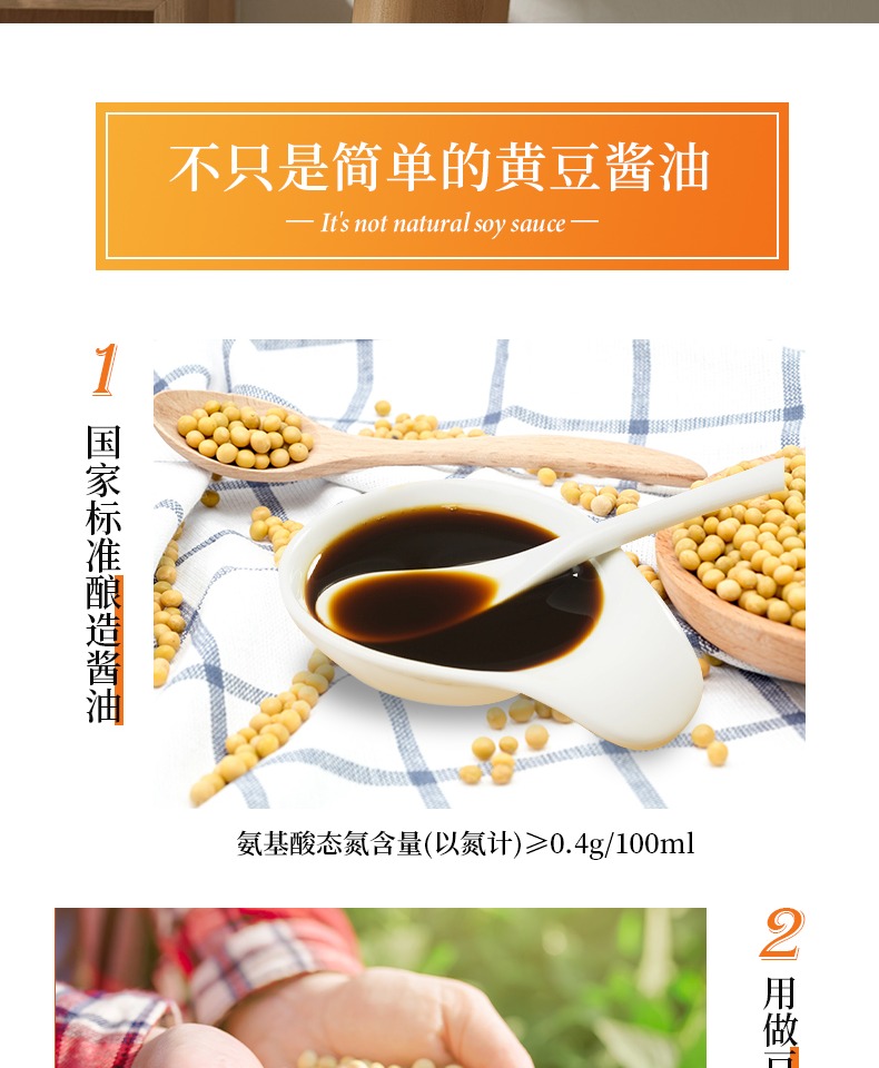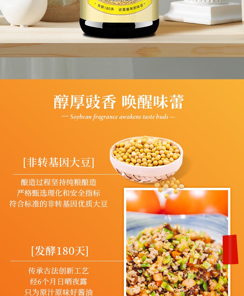 经典原香酱油,酱香味浓,色泽鲜亮,非转基因脱脂大豆酿造,醇厚鲜香,回味无穷,炒菜/凉拌/煲汤来一勺,美味立即加分!~