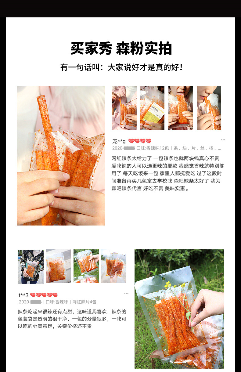 【推荐理由】手工制作,十袋不重样!精选食材,传统工艺制成,劲道爽口,薄薄的吃起来不腻歪,吃出了小时候的味道,超级赞!超划算!!来自辣条发源地,地地道道地正宗辣条!!