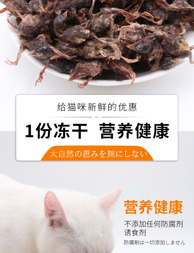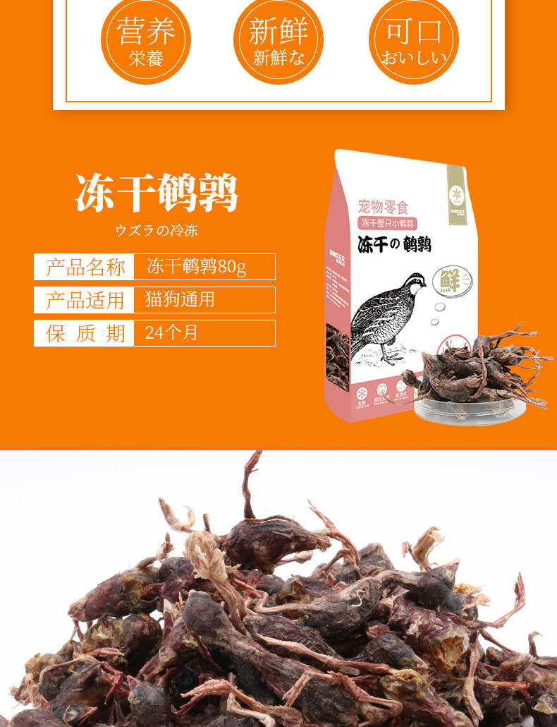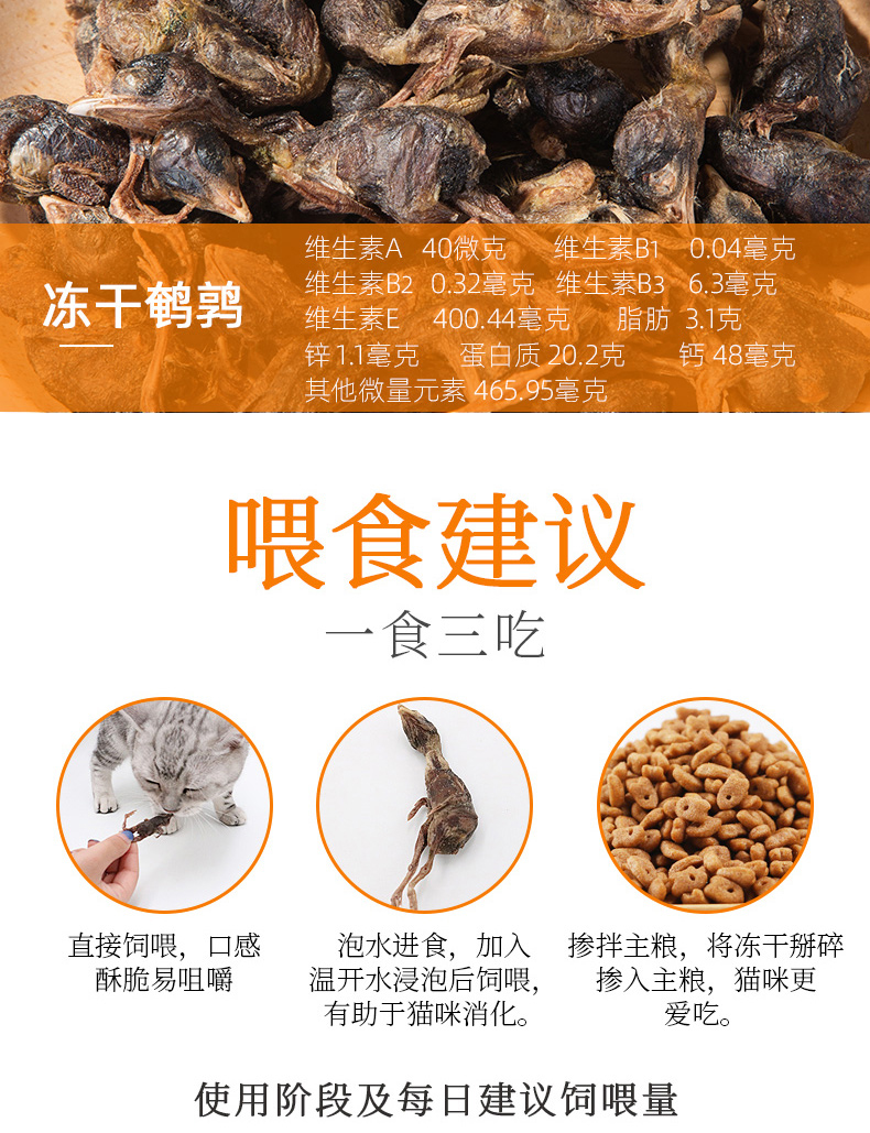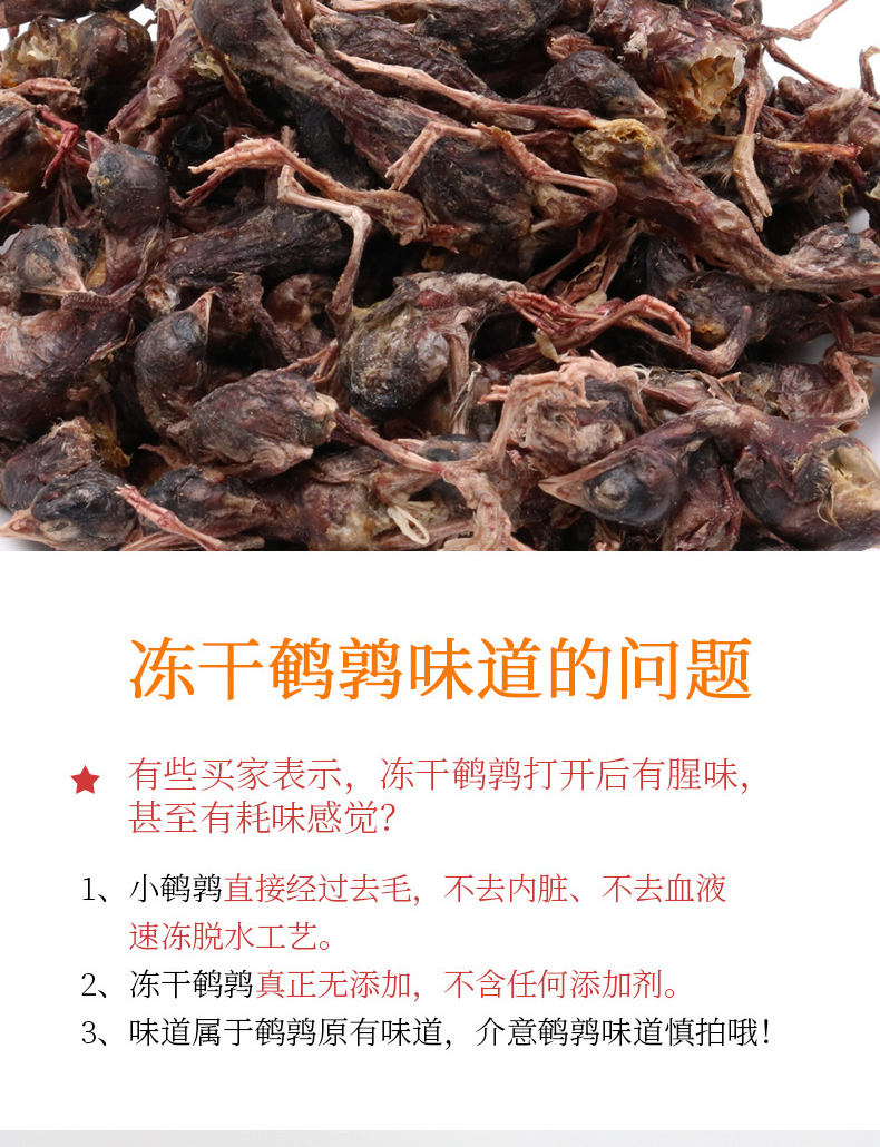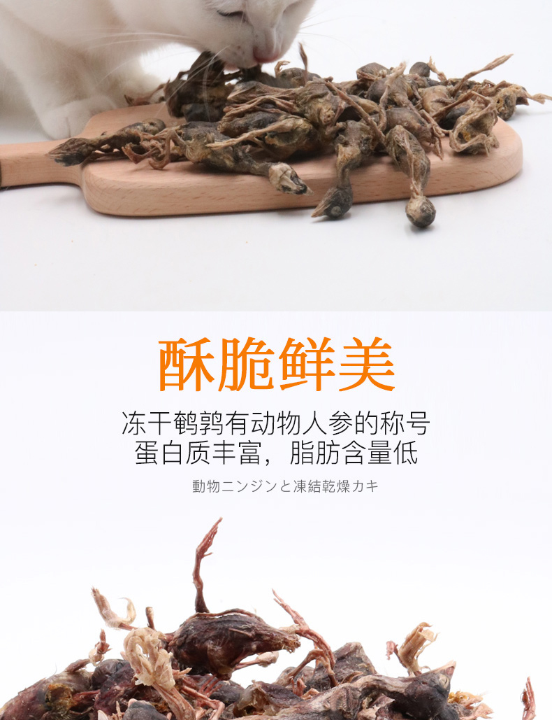 干鹌鹑猫狗猫粮零食,没有添加剂,优质原材料,食物新鲜,内质鲜美,细腻,高蛋白,包装有封条,看起来就很精致,多种口味选择,抓紧抢购!!