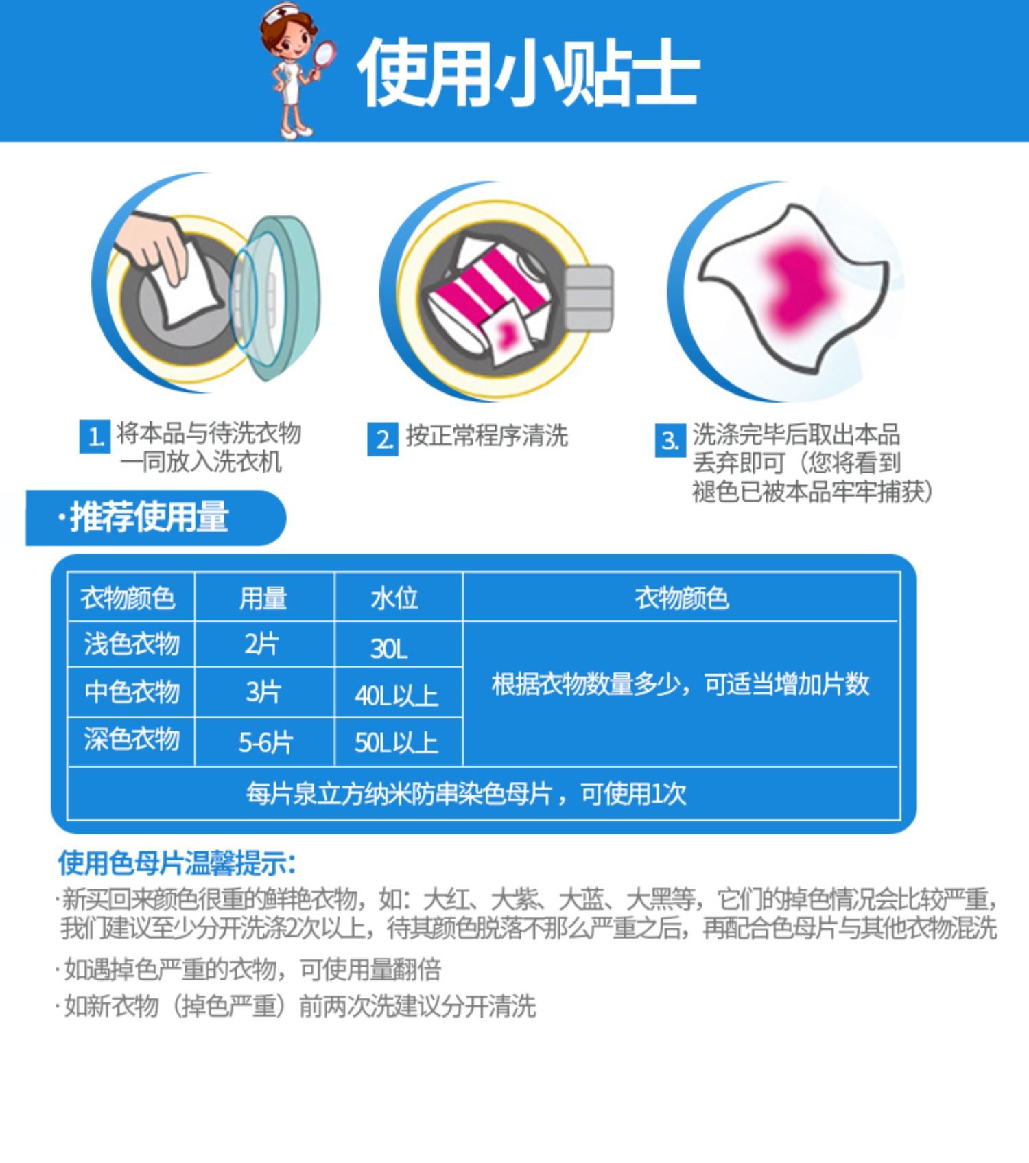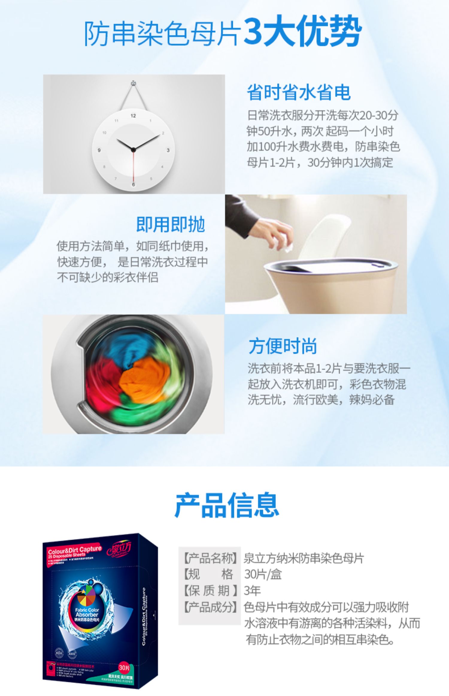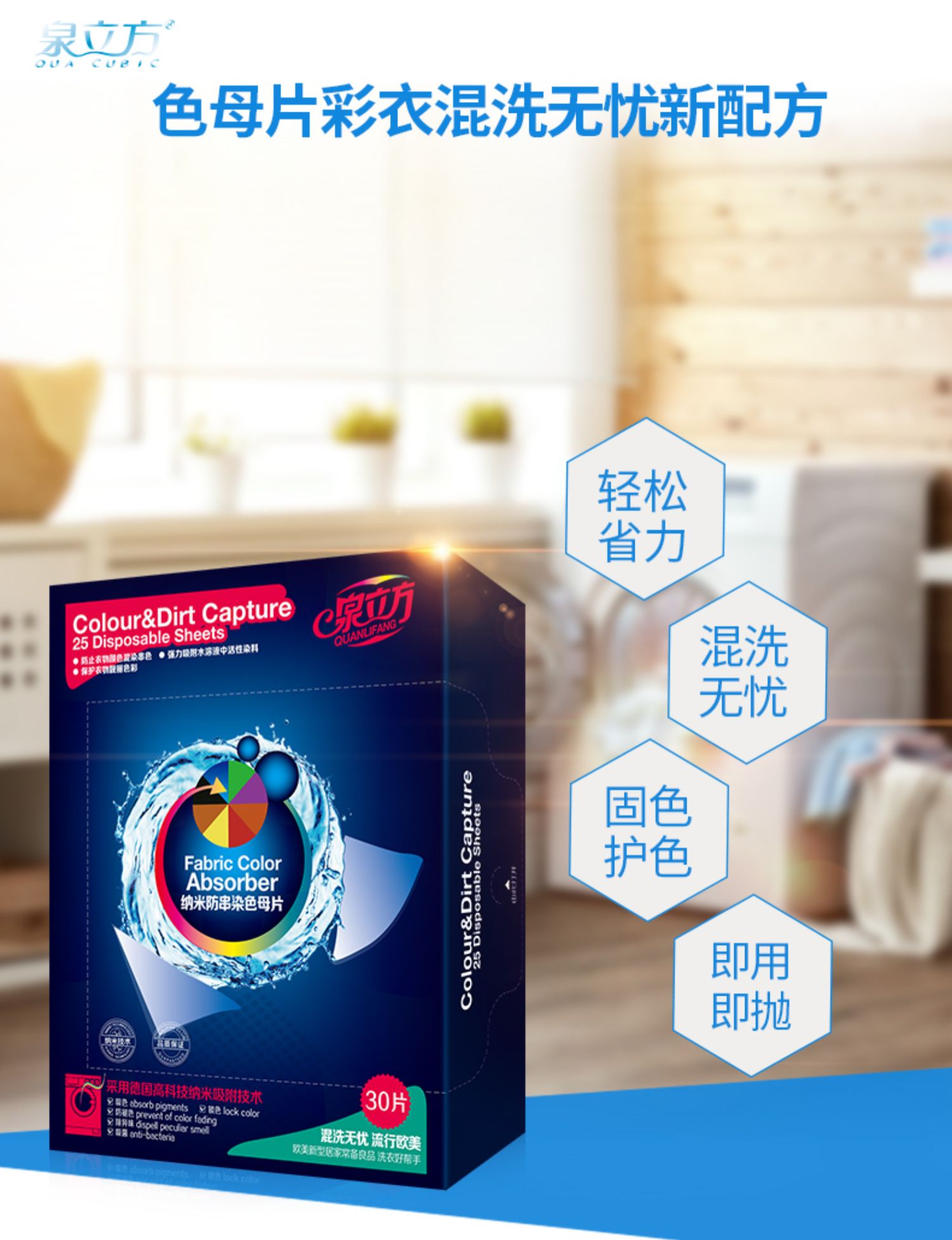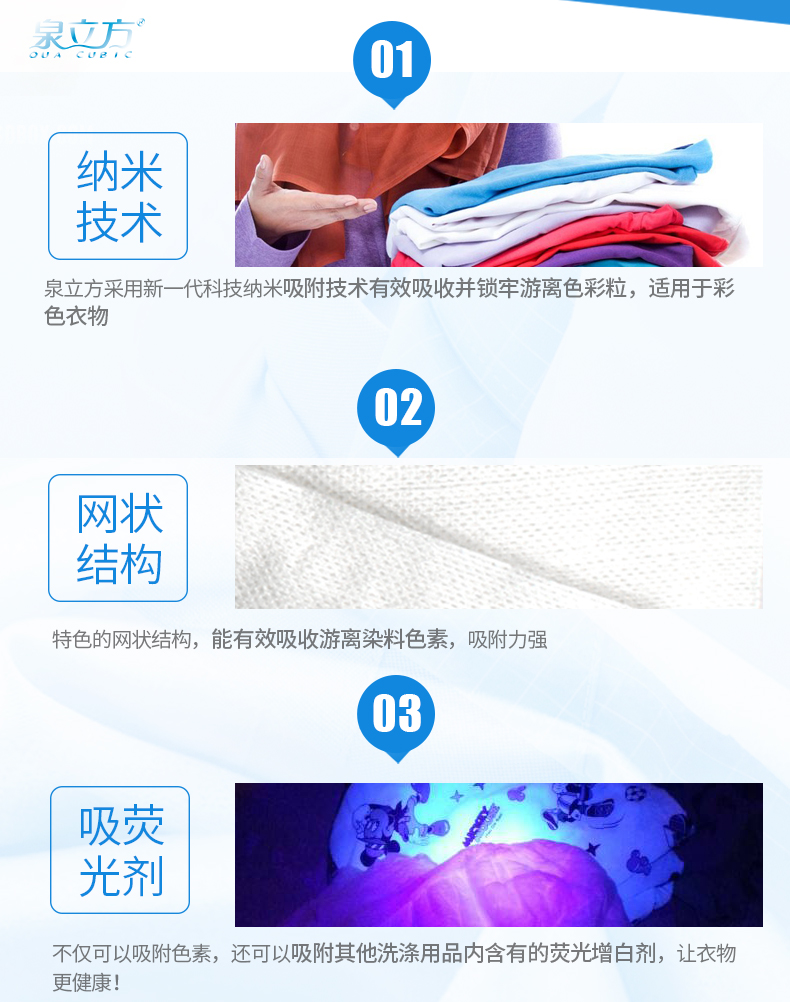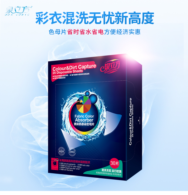 【官方正品!满60元减8元;满100元减15元!】泉立方纳米防串染色母片,德国纳米吸附技术,放进去色母片,不会出现串色、染色情况,还会吸附掉衣服上面的细菌和重金属,节省时间、节省水和电!【赠运费险】