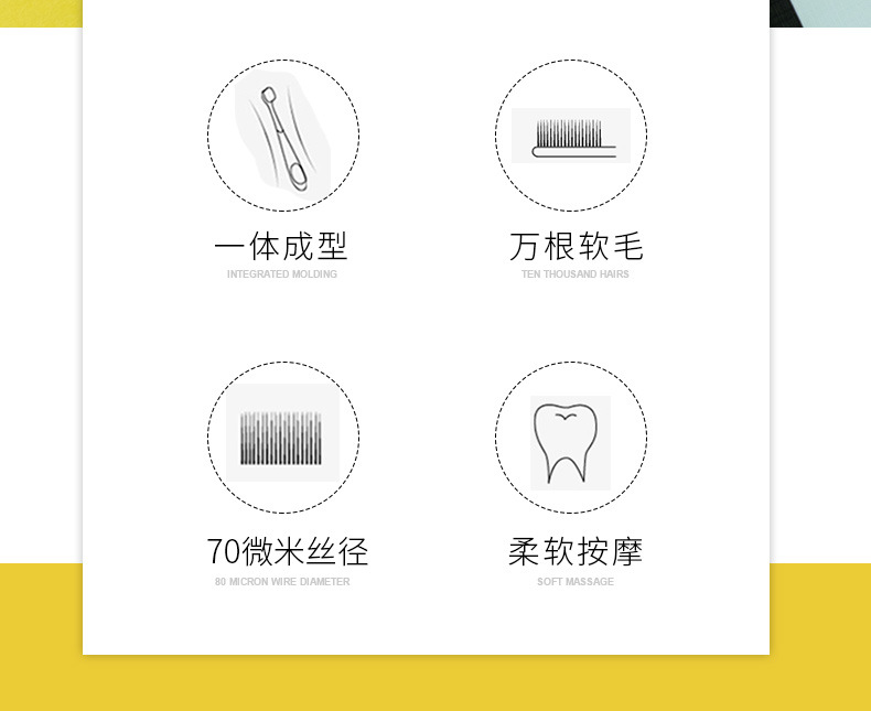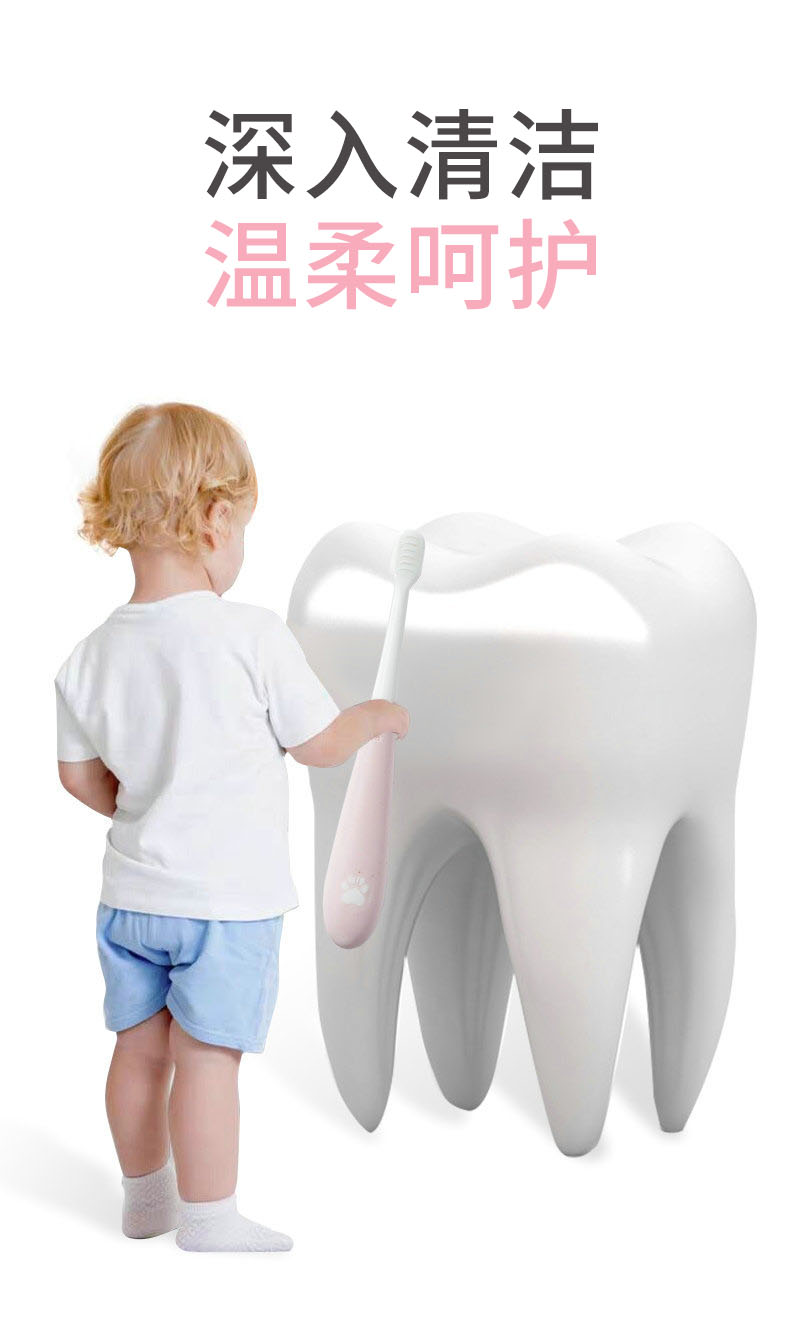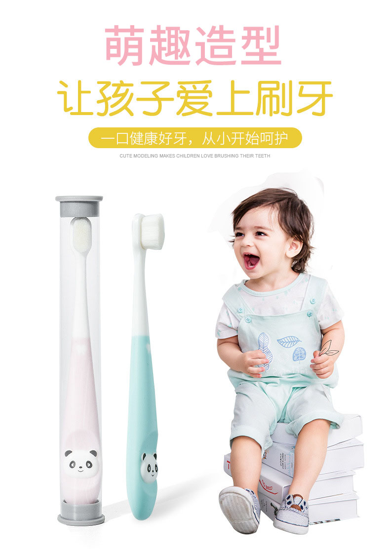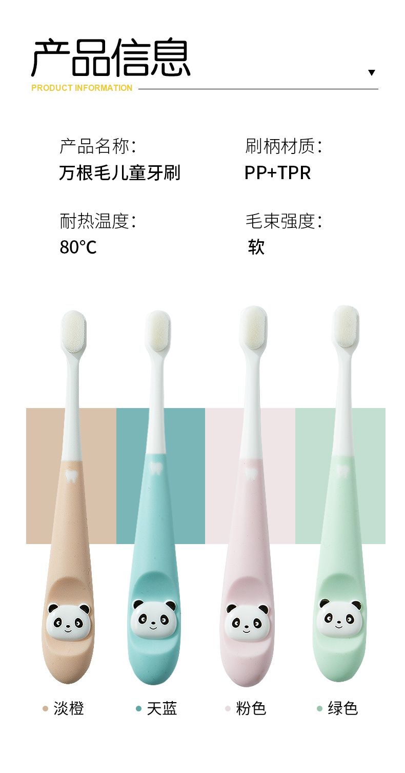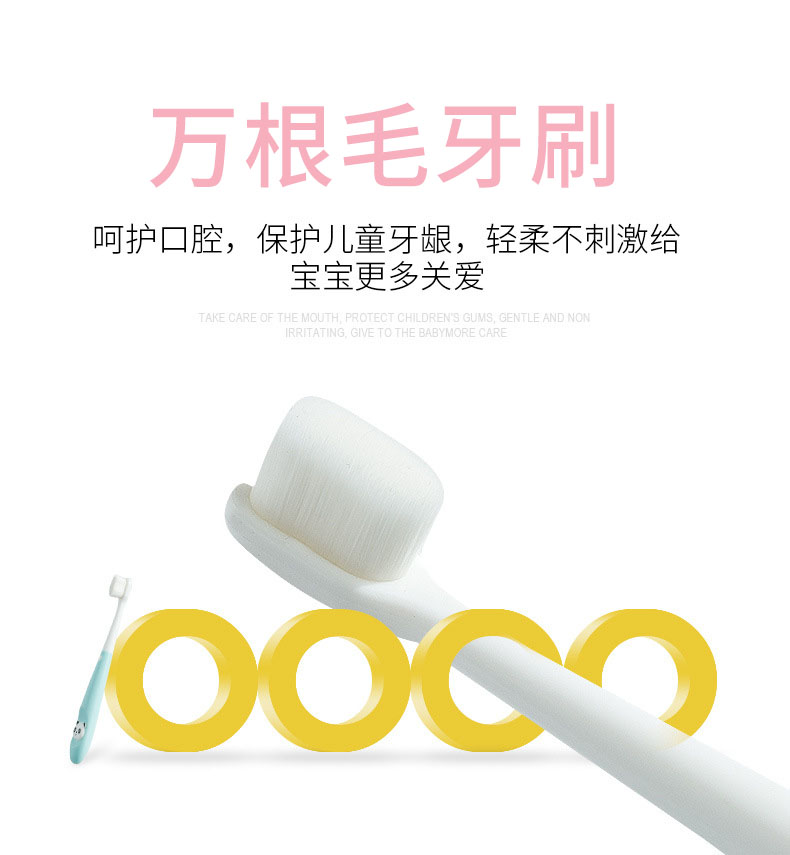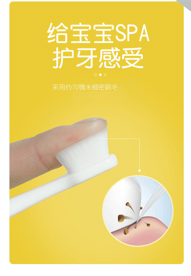万根70微细刷毛!一体成型,万根软毛,柔软按摩,可爱卡通造型,易深入牙齿内部,刷牙像按摩,温和加倍洁净,0刺激!软毛刷还很有弹性,不掉毛,不含荧光剂,呵护宝宝稚嫩牙齿。
