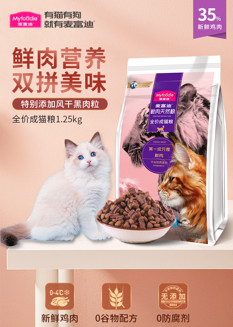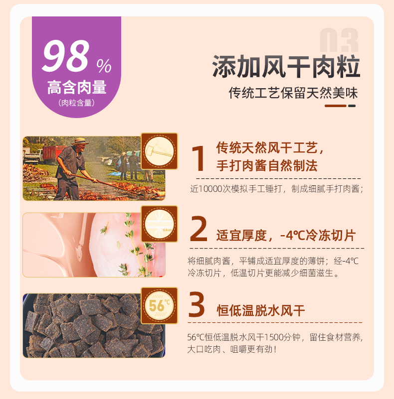 添加真鲜肉百分之35,粗蛋白≥百分之30;添加风干肉粒、含肉量百分之98;0谷物,0防腐剂,呵护肠胃保护关键,维持体态吃出健康!宠物用品