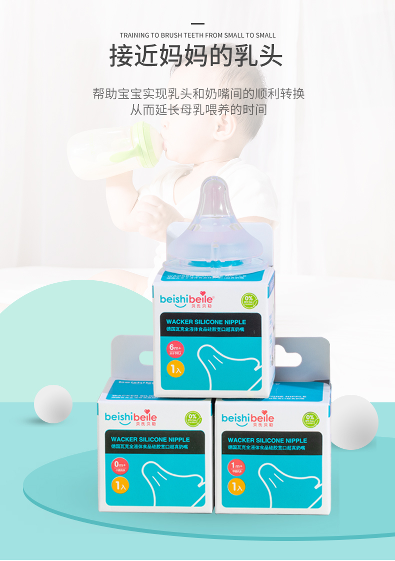 【贝氏贝勒旗舰店】德国进口硅胶材质,品质保证!为了宝宝健康!奶嘴一个月就要更换一次!不含双酚A,无异味!进口硅胶材质,不含双酚A,安全无毒。仿真嘴母乳实感,防胀气,入口软软的,宝宝吸吮很轻松。