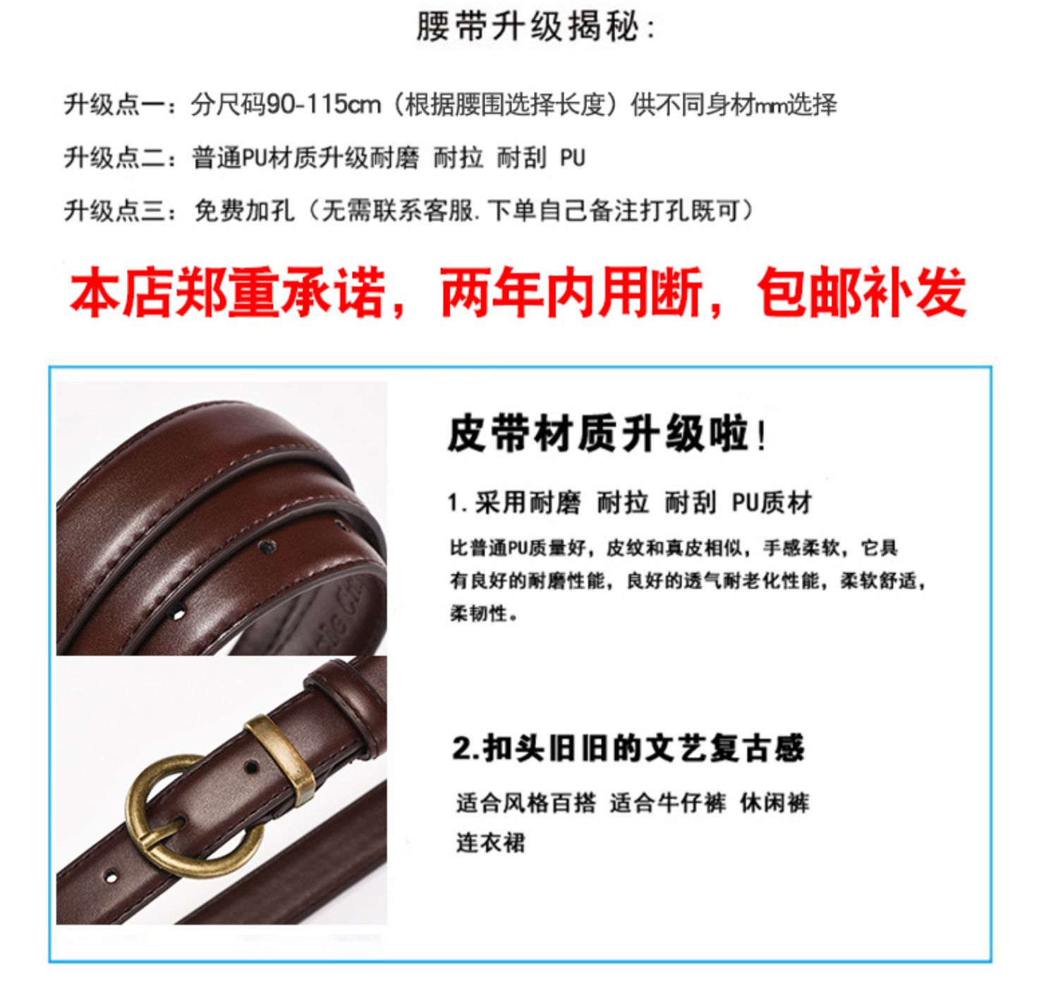 精选优质PU皮质,柔软耐用,抗腐蚀性好,实心合金扣头,不脱线,用着放心~!