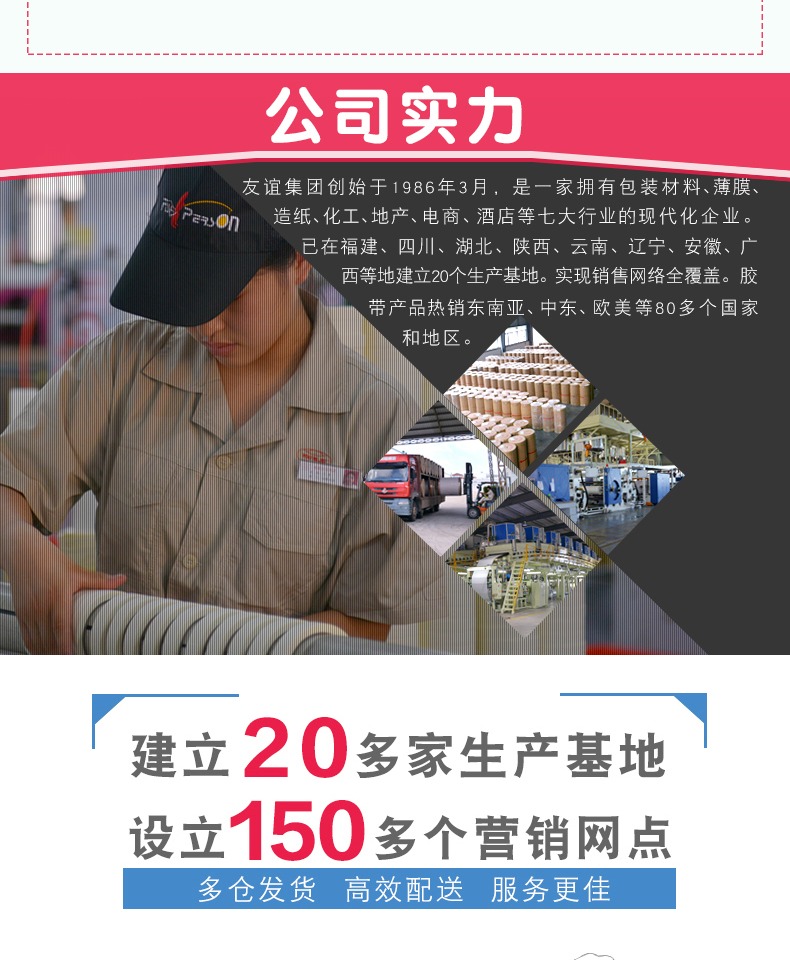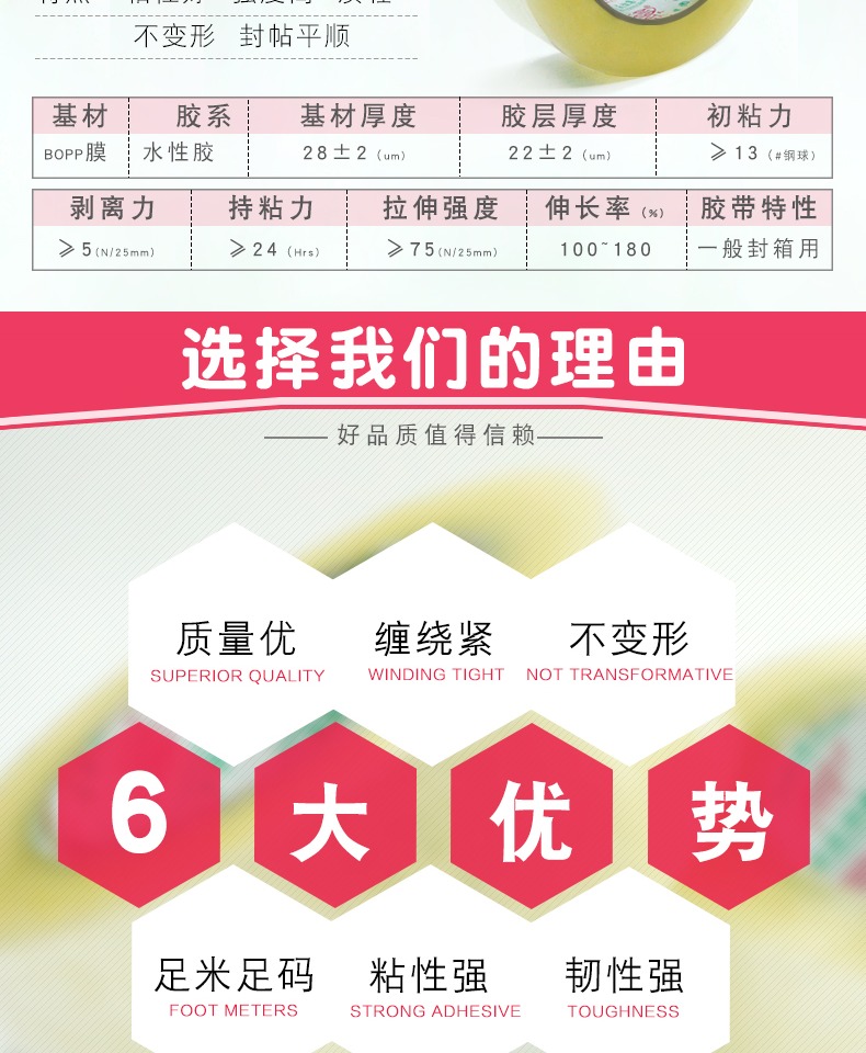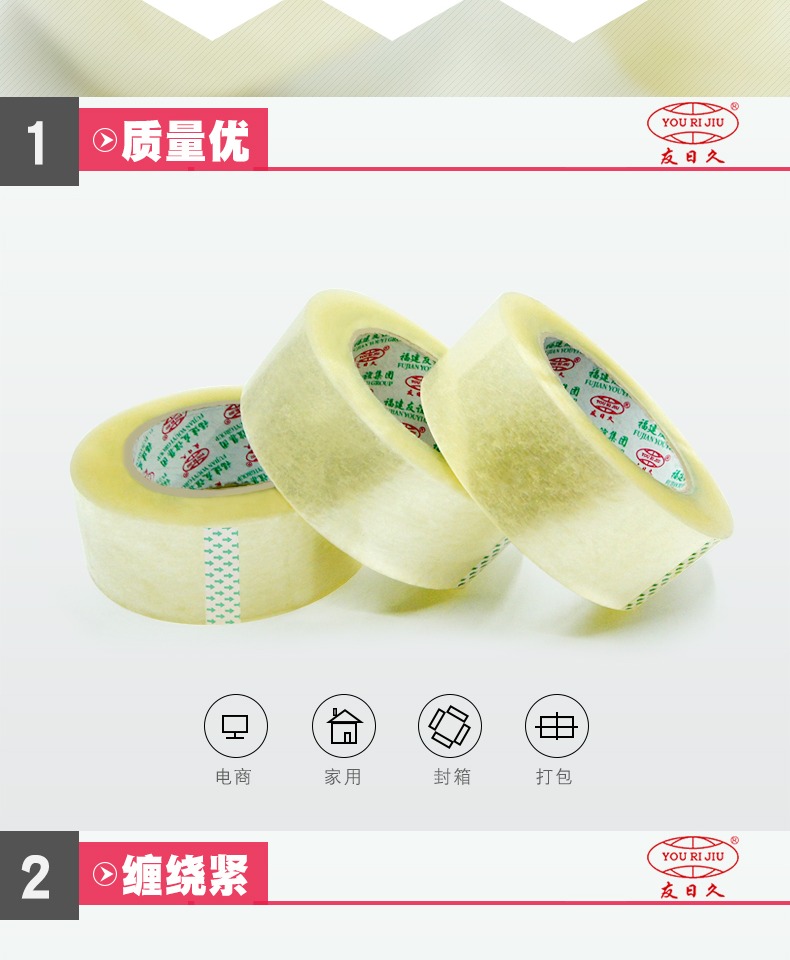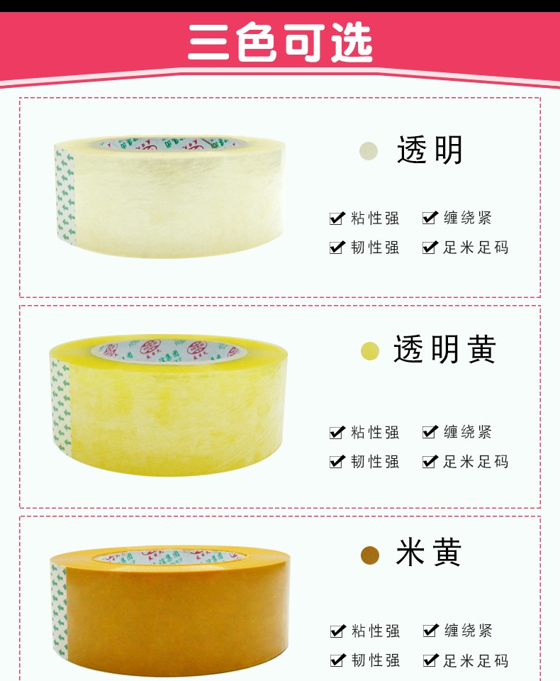专业打包家用,透明胶带大卷,宽封口胶带,采用优质进口压敏胶水,粘性强,不脱胶,封箱结实杜绝破箱,不易缠胶抗拉耐磨耐高温,质量值得信赖
