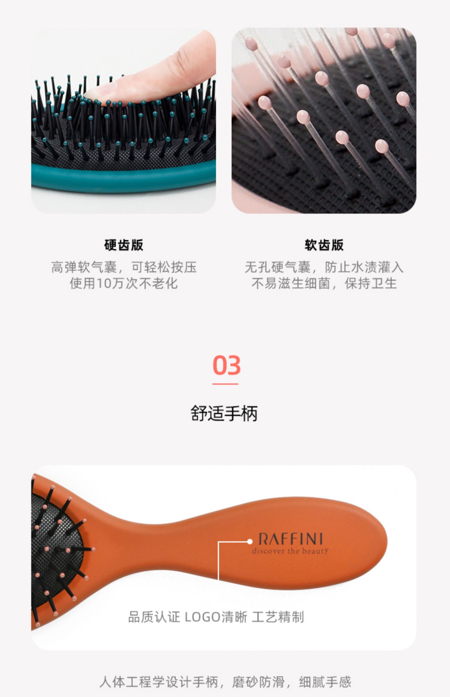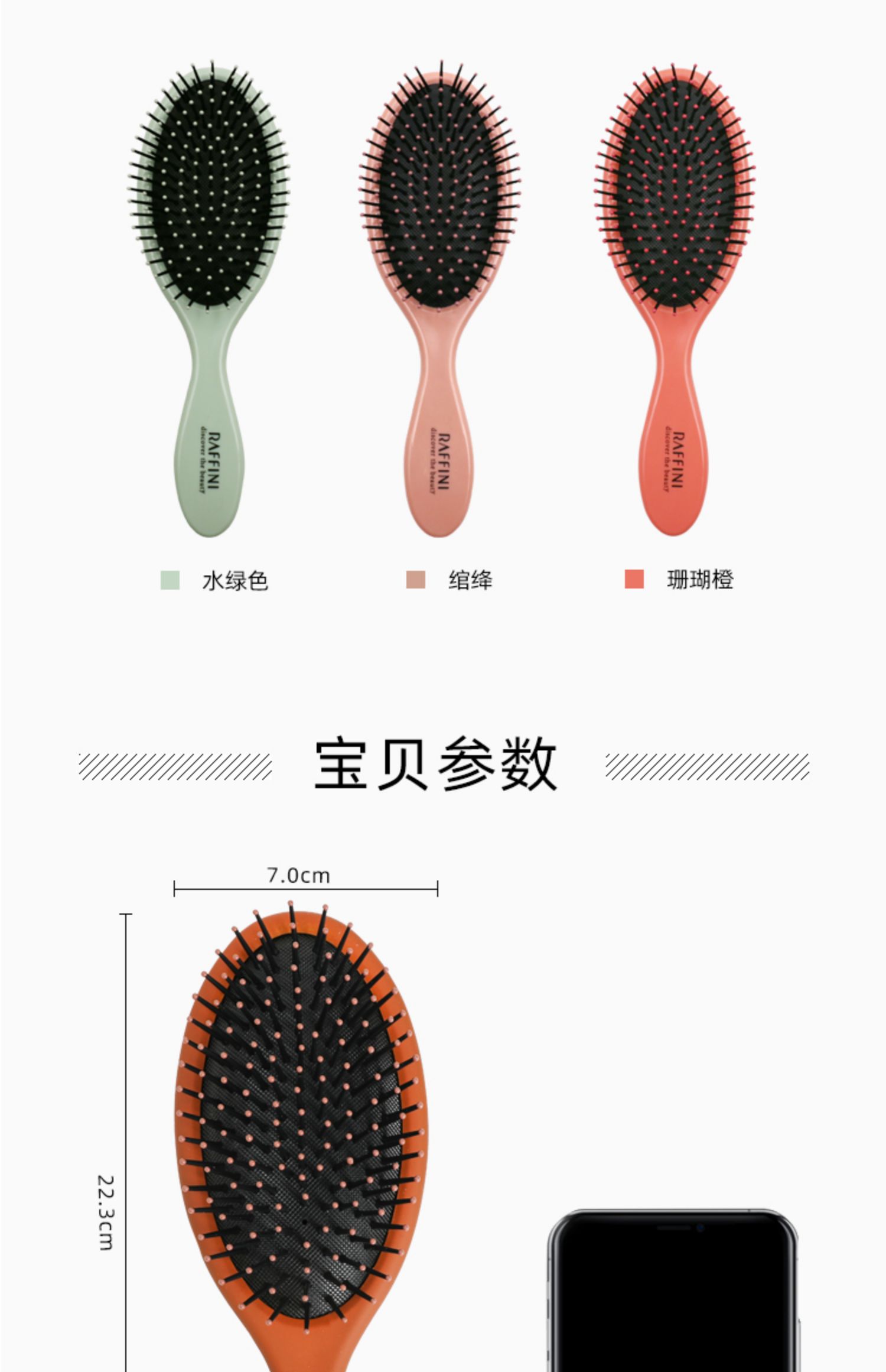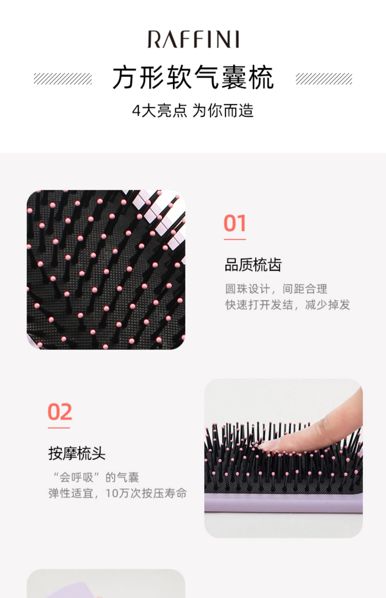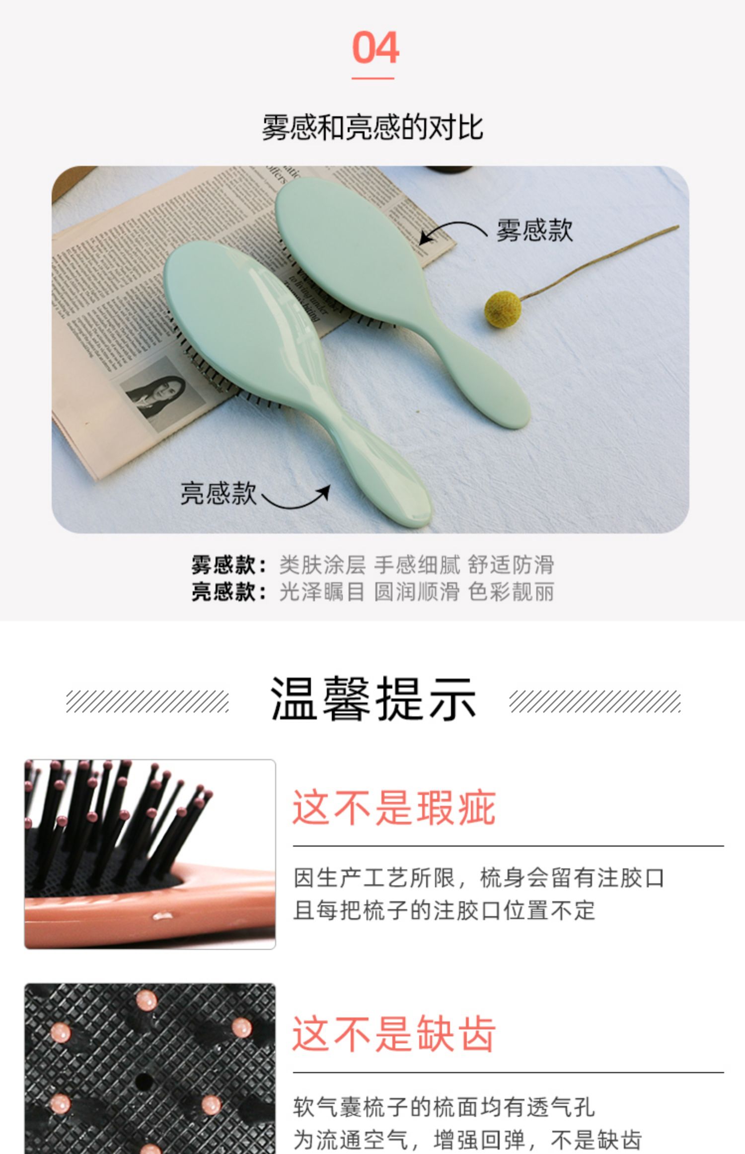 按摩气垫梳,弹性好,软硬适中,更好的接触头皮,达到按摩效果,拒绝拉扯,保护头皮,防止静电,防止脱发,包装精美,送人有面!做有品质的梳子,赶紧抢购吧!【破损包退,赠运费险】