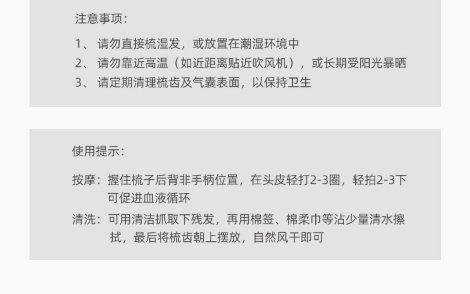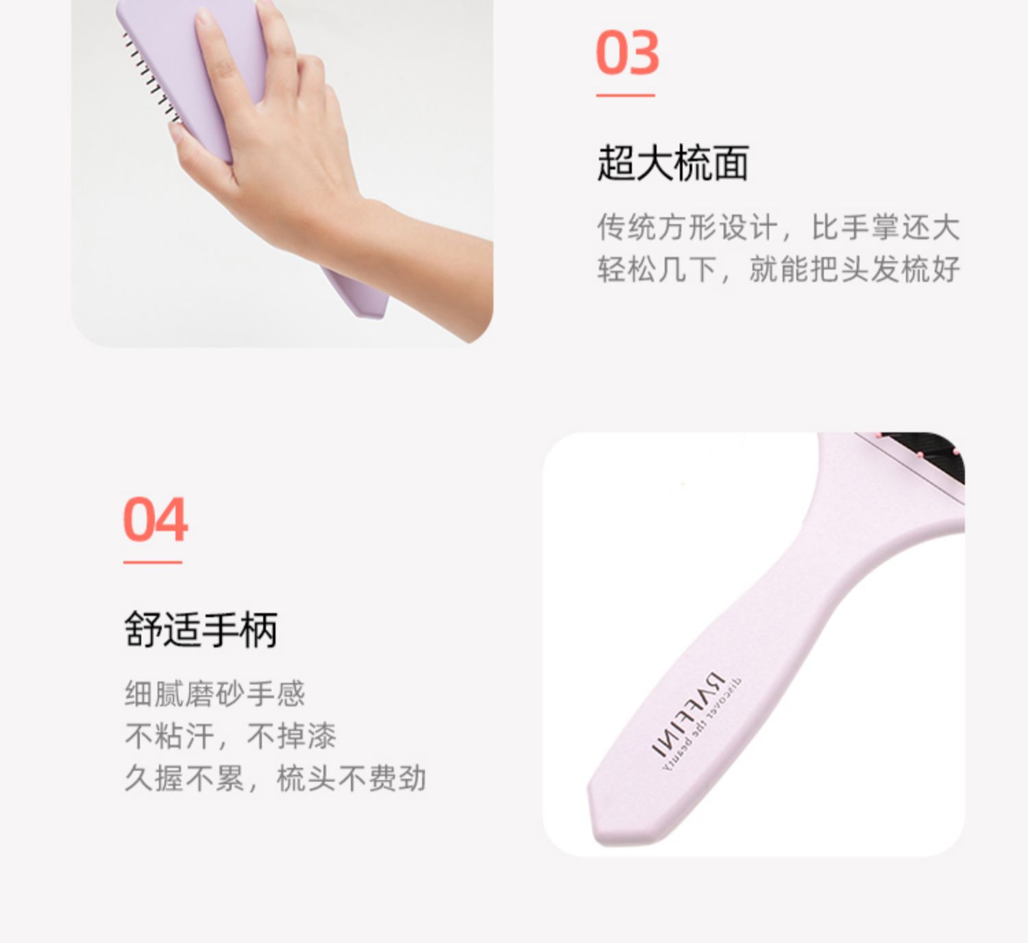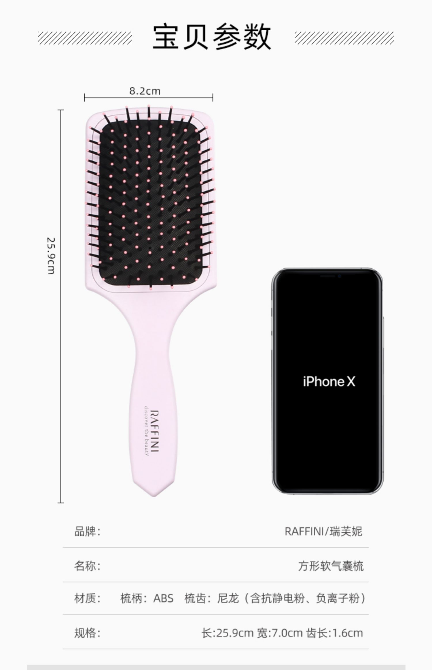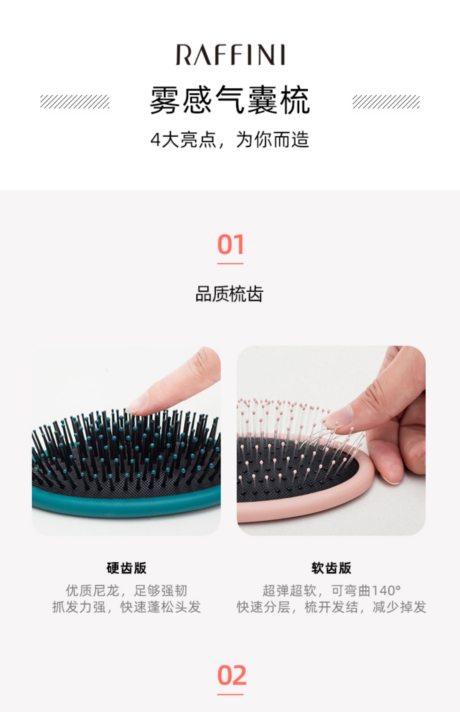 按摩气垫梳,弹性好,软硬适中,更好的接触头皮,达到按摩效果,拒绝拉扯,保护头皮,防止静电,防止脱发,包装精美,送人有面!做有品质的梳子,赶紧抢购吧!【破损包退,赠运费险】