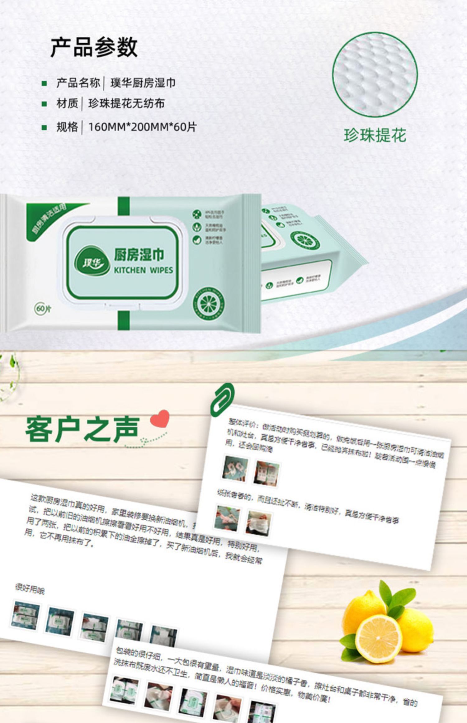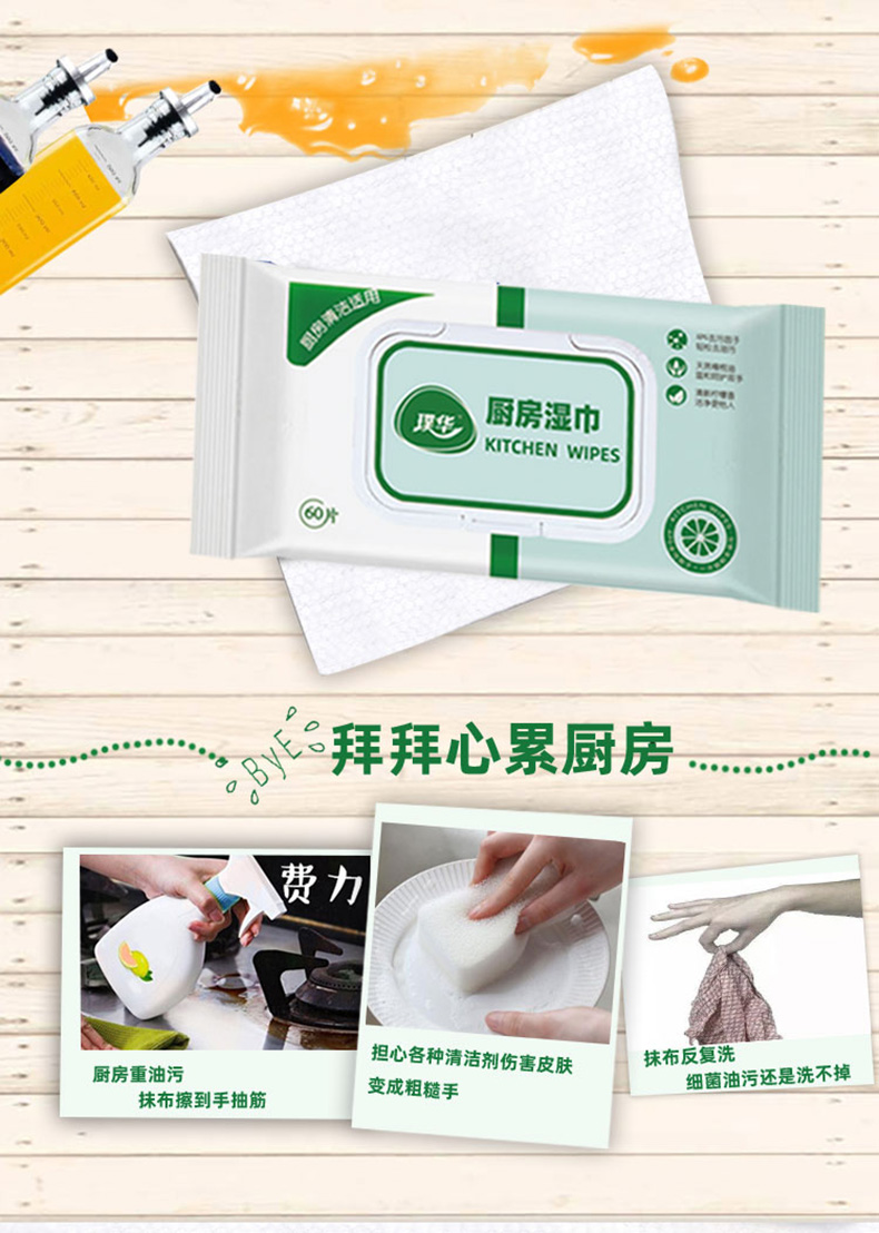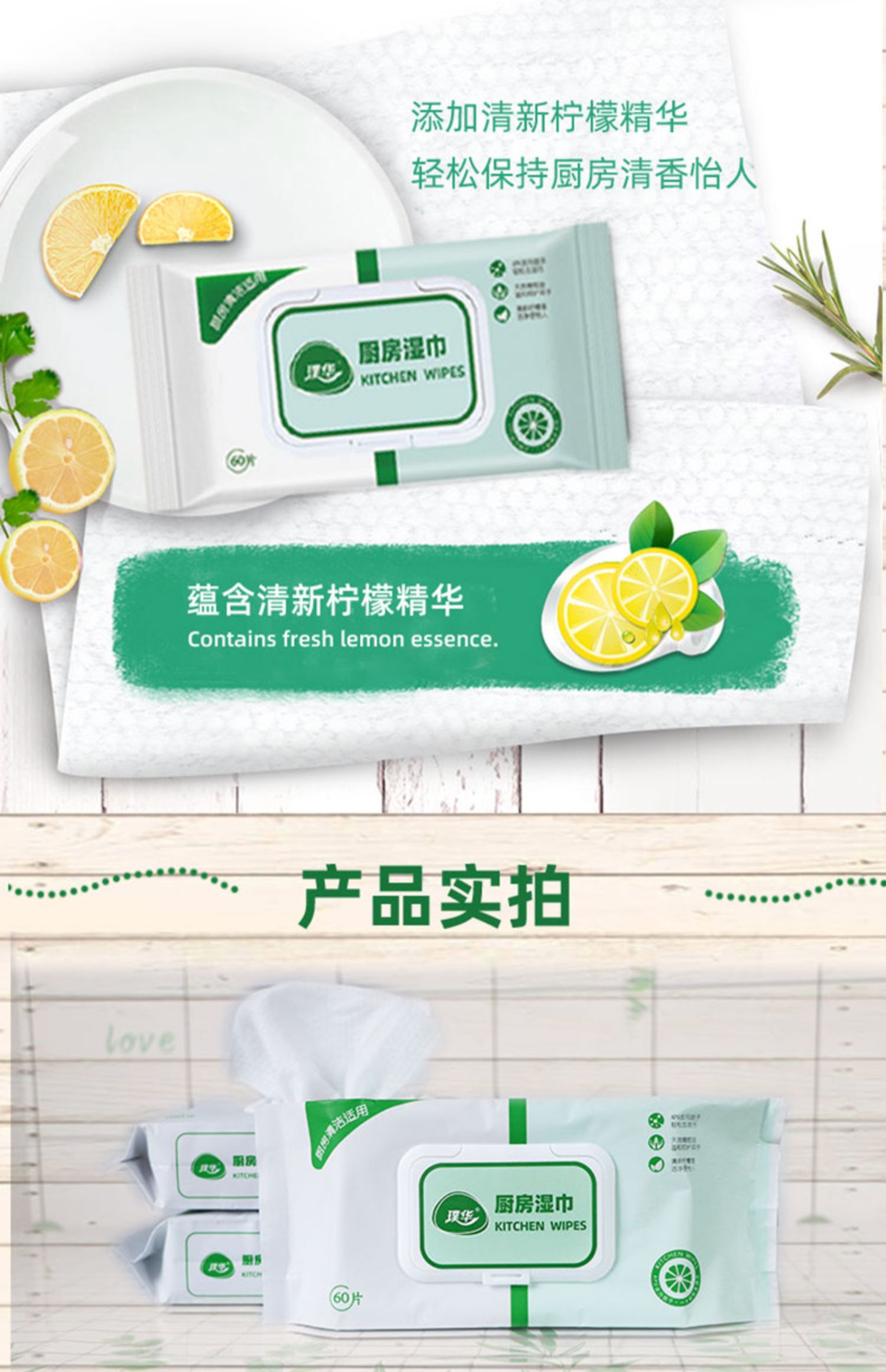 厨房湿巾60抽大包,含柠檬香氛,清洁配方中加入APG去油污因子,能快速分散和化解油污,去污不留痕,洁净好轻松!擦拭厨房油烟机,日常清洁桌椅,家庭必备!
