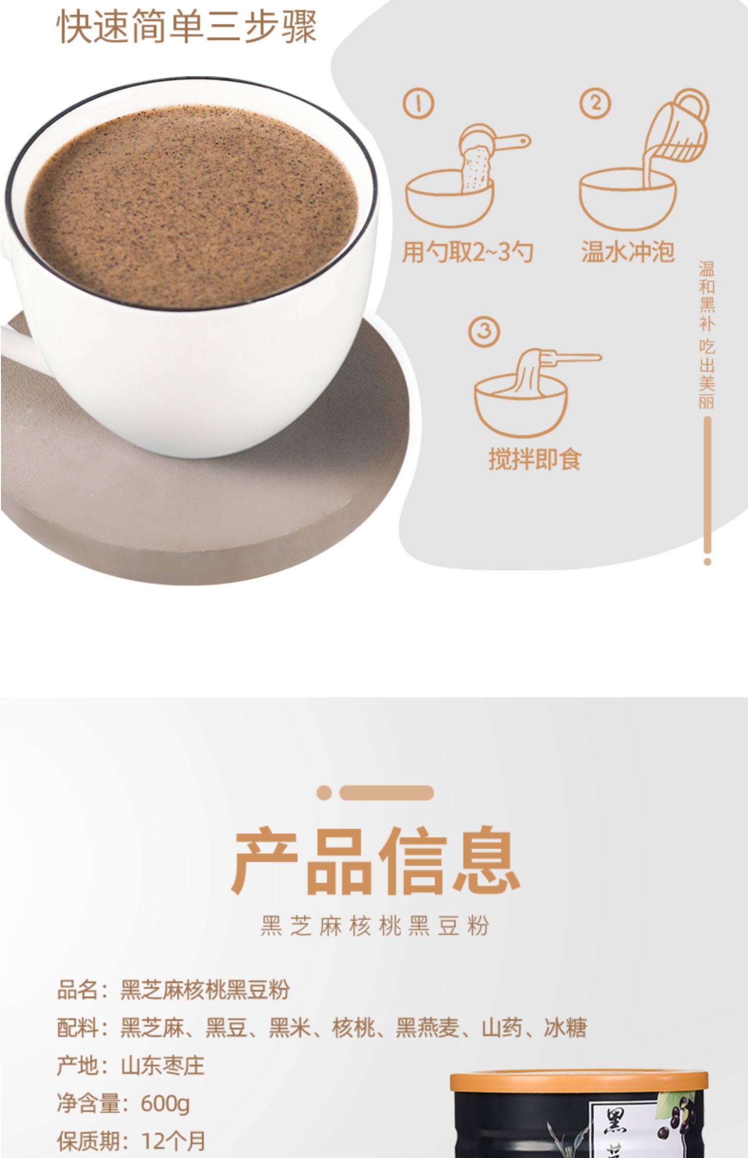 进口好食材,五重黑营养,配方超强升级,用黑色力量,给你崭新希望!男女老少均可食用,早餐代餐,以黑养黑,黑发补肾,健康营养。