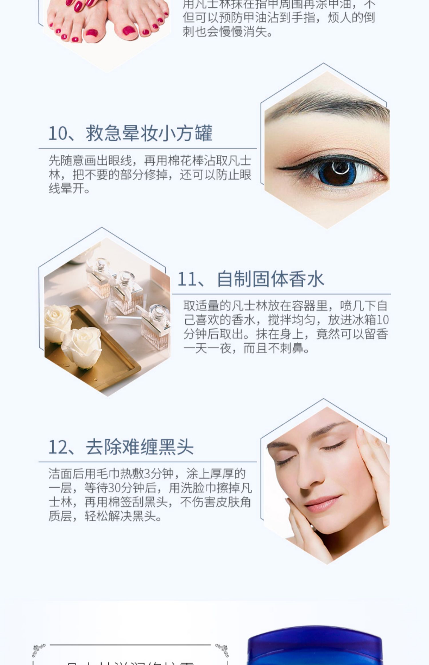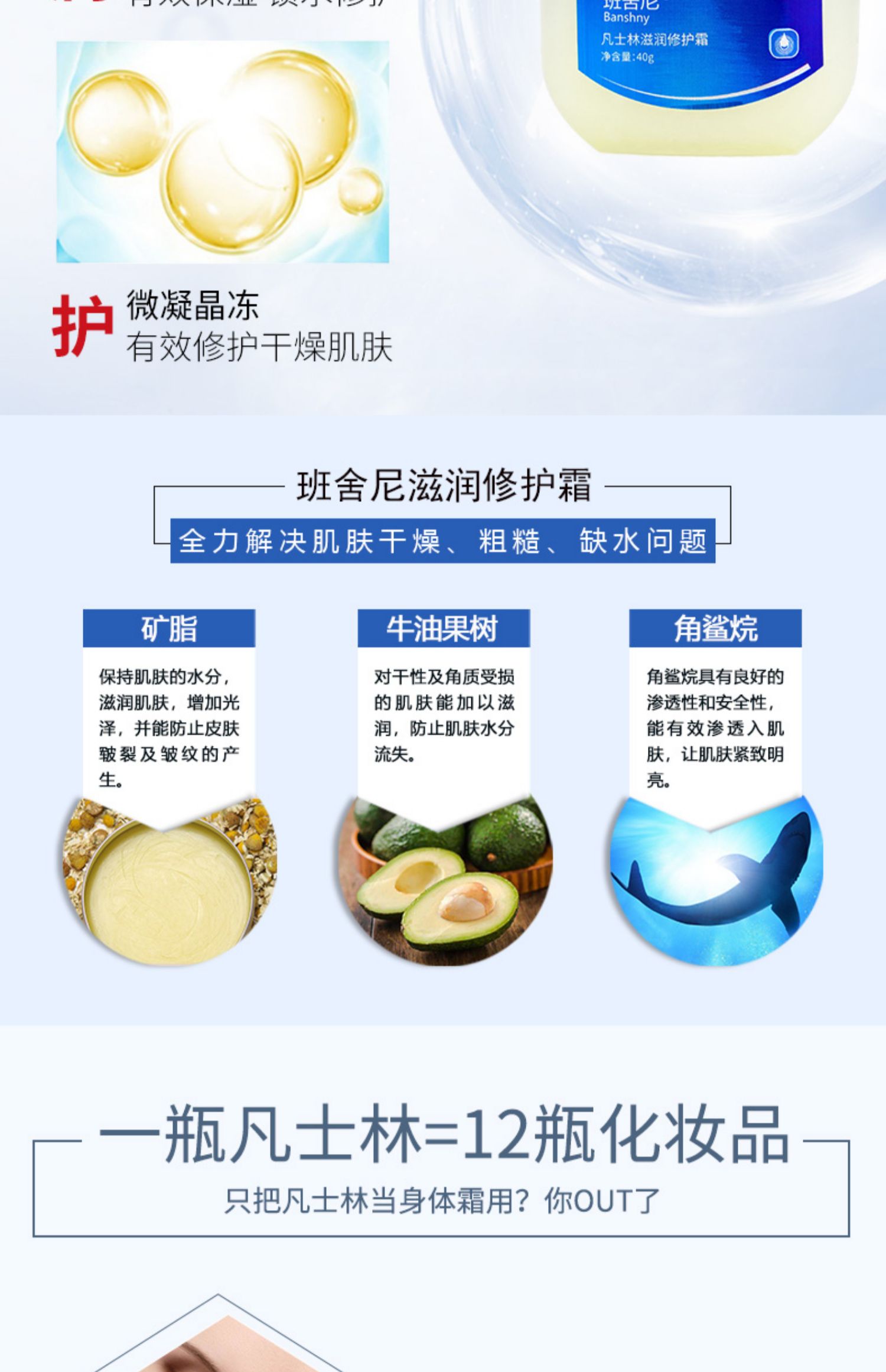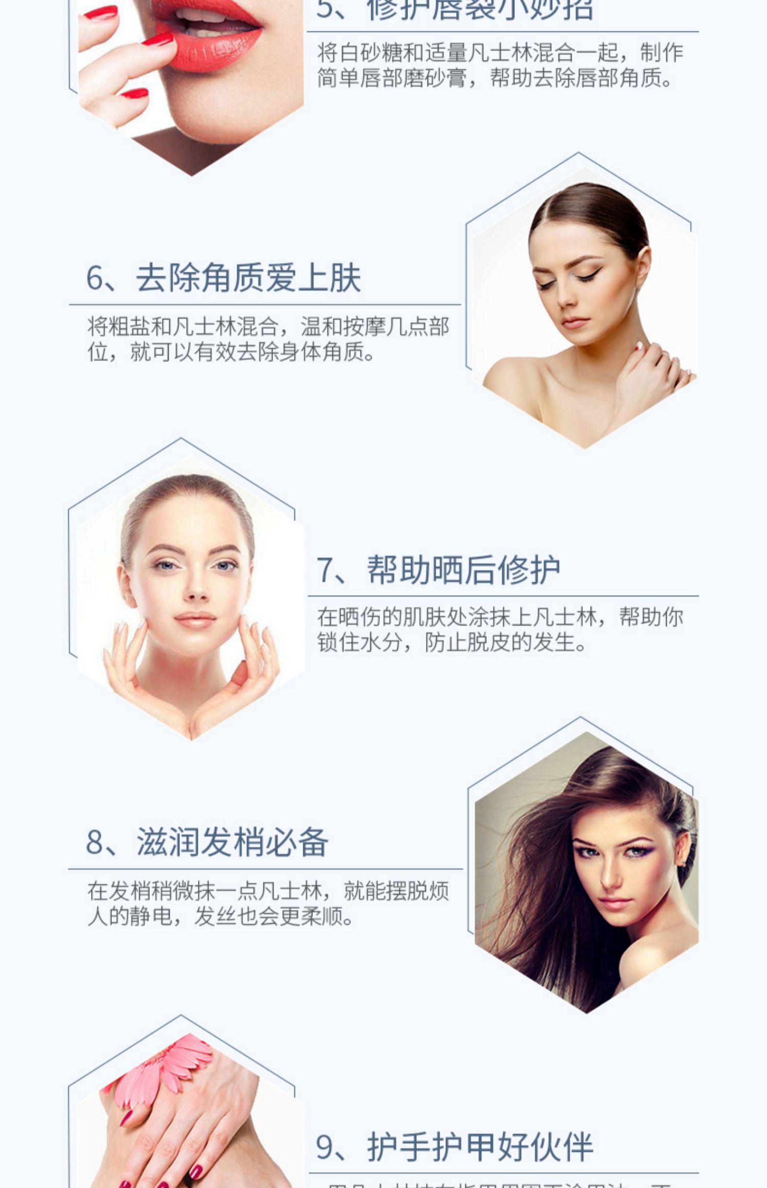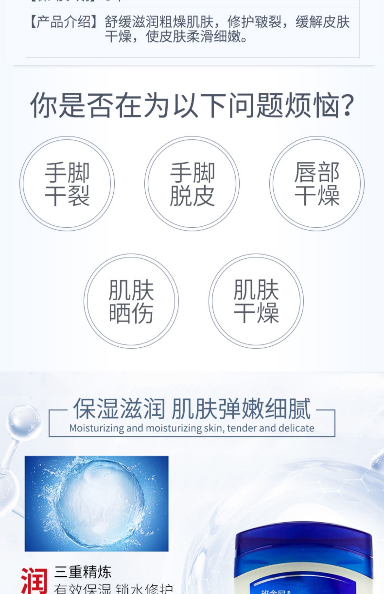 【凡士林官方正品】清爽质地,适合油性及混油性肌肤,不粘腻易吸收,用于修护因外部刺激造成的手足皲裂、倒刺、脱皮干燥等皮肤问题,改善肌肤干燥,长效滋润保湿。送分装瓶加唇刷,赶紧下单吧!!!