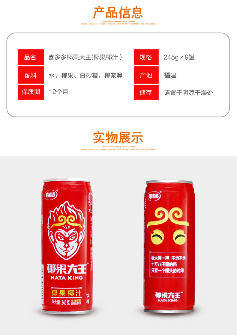 【喜多多椰果大王245g*9罐】喜多多的每一块椰果都选自东南亚原产地热带椰果,采用冰点鲜榨技术,经过168小时的自然发酵,更大颗粒,清润Q弹,椰汁嚼着喝,吃上一口回味无穷,为你的工作生活加点甜~