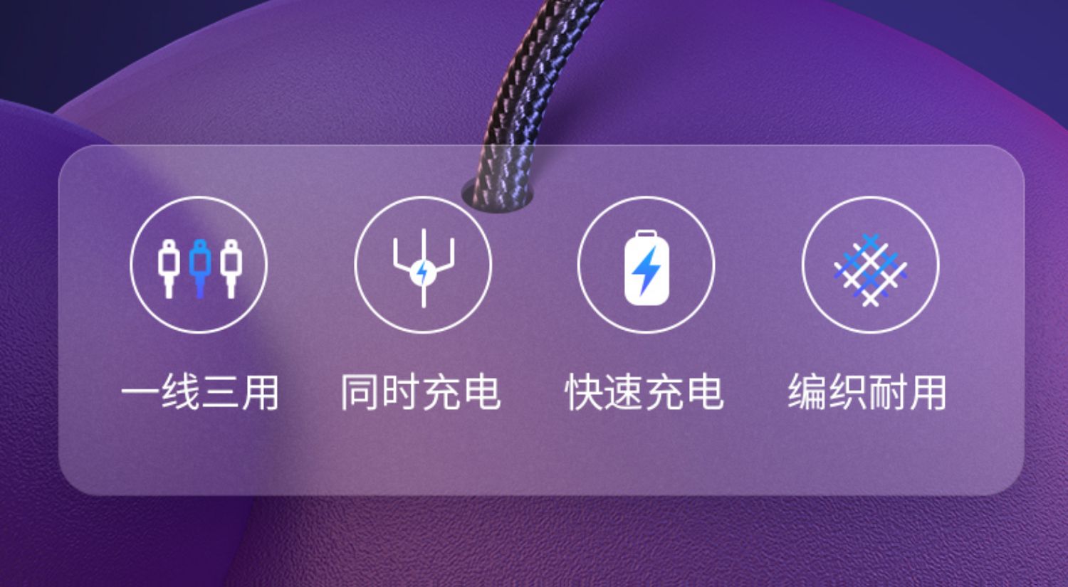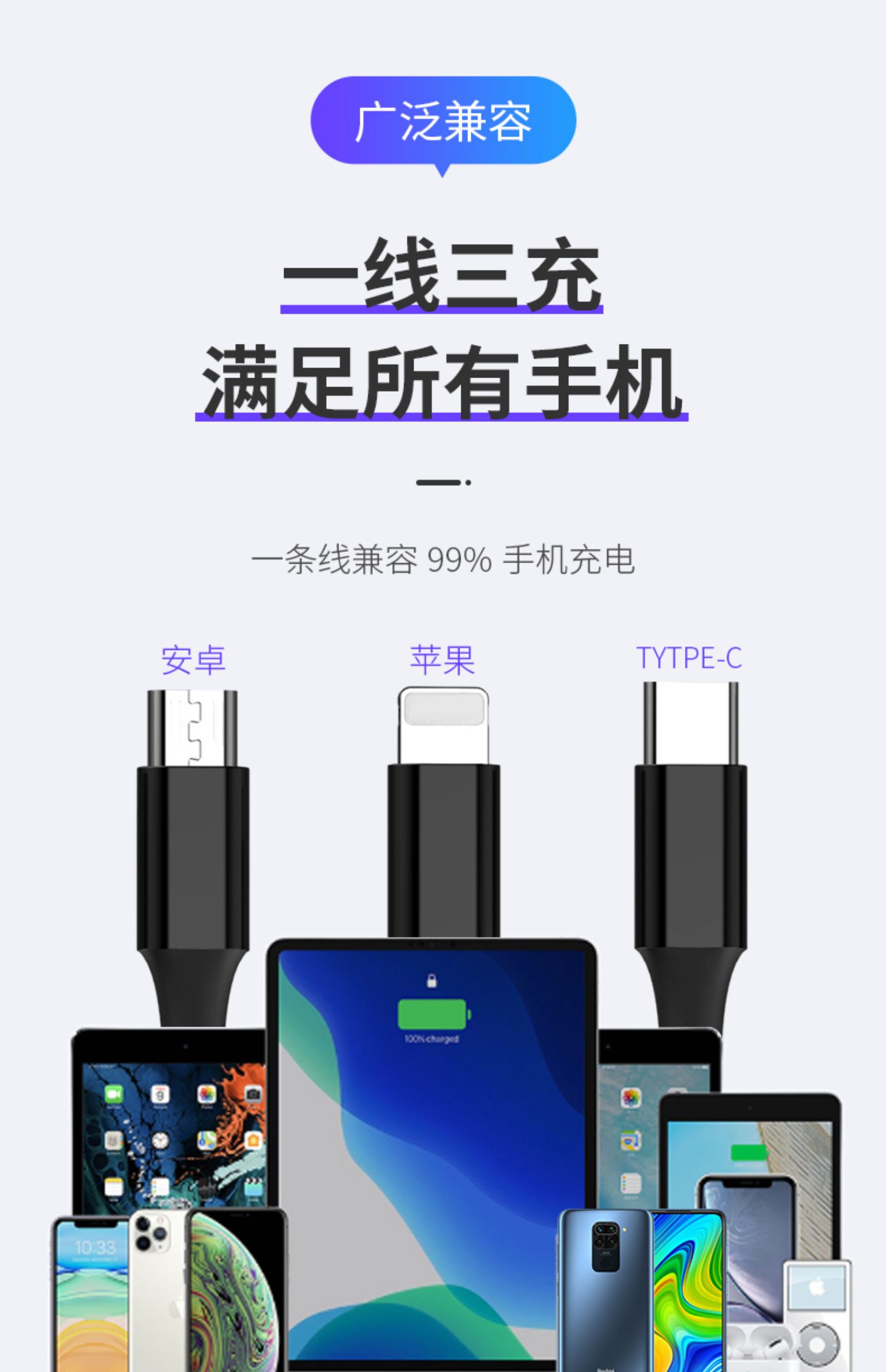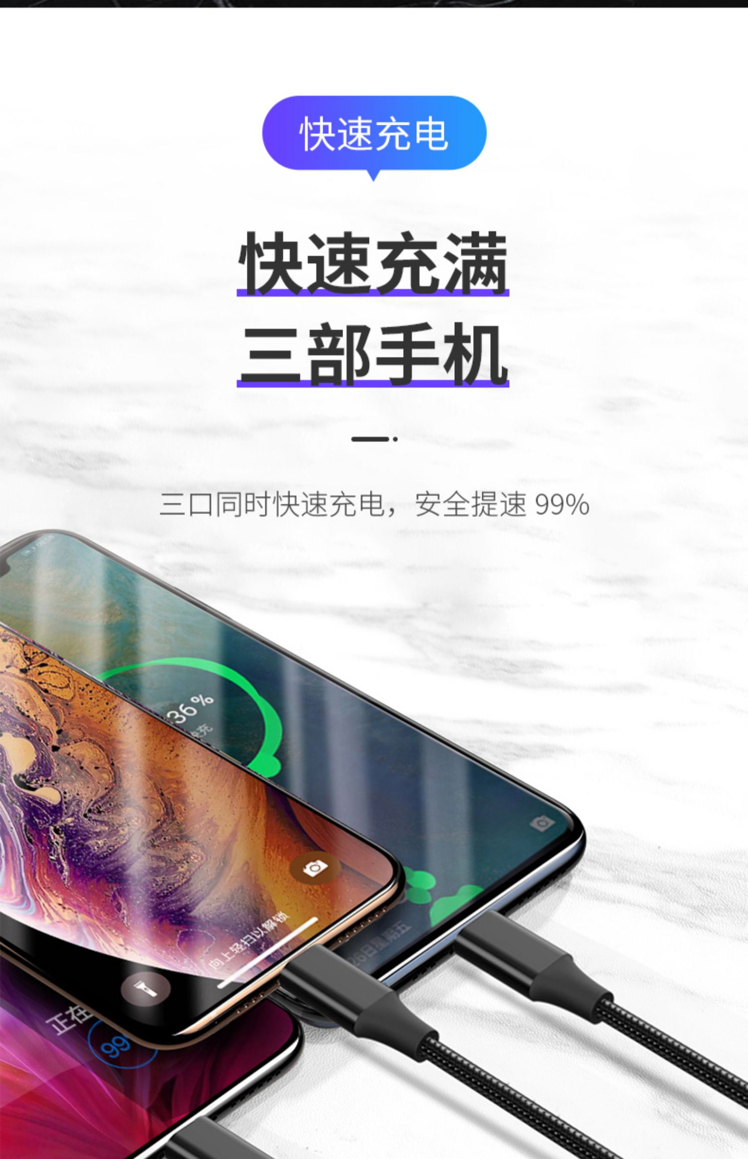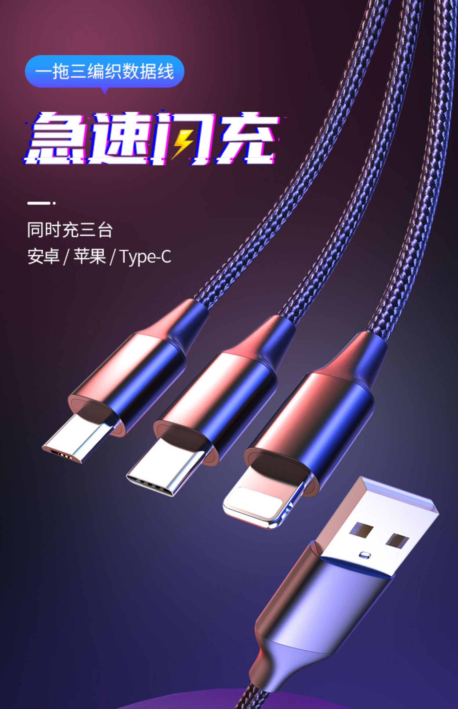 三合一快充闪充数据线,标准出厂测试,防止爆线更耐用,安全超高保障!强韧尼龙线身,抗拉耐扯,苹果/安卓/type-c广泛兼容,智能防过充,再也不用担心通宵充电啦,抢到就是赚到!【赠退换运费险】