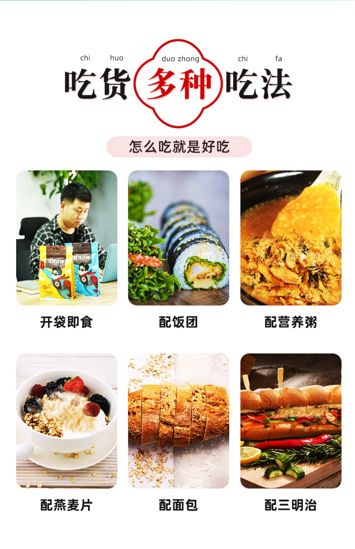 【自带封口】新鲜肉质,传统烘焙制成,日期新鲜,无色素无添加,香酥不腻,烘焙专用,开袋即食,用来做寿司、炒饭、三明治,搭配粥饭,麦片,都敲好吃,老少皆宜,吃货们冲鸭!