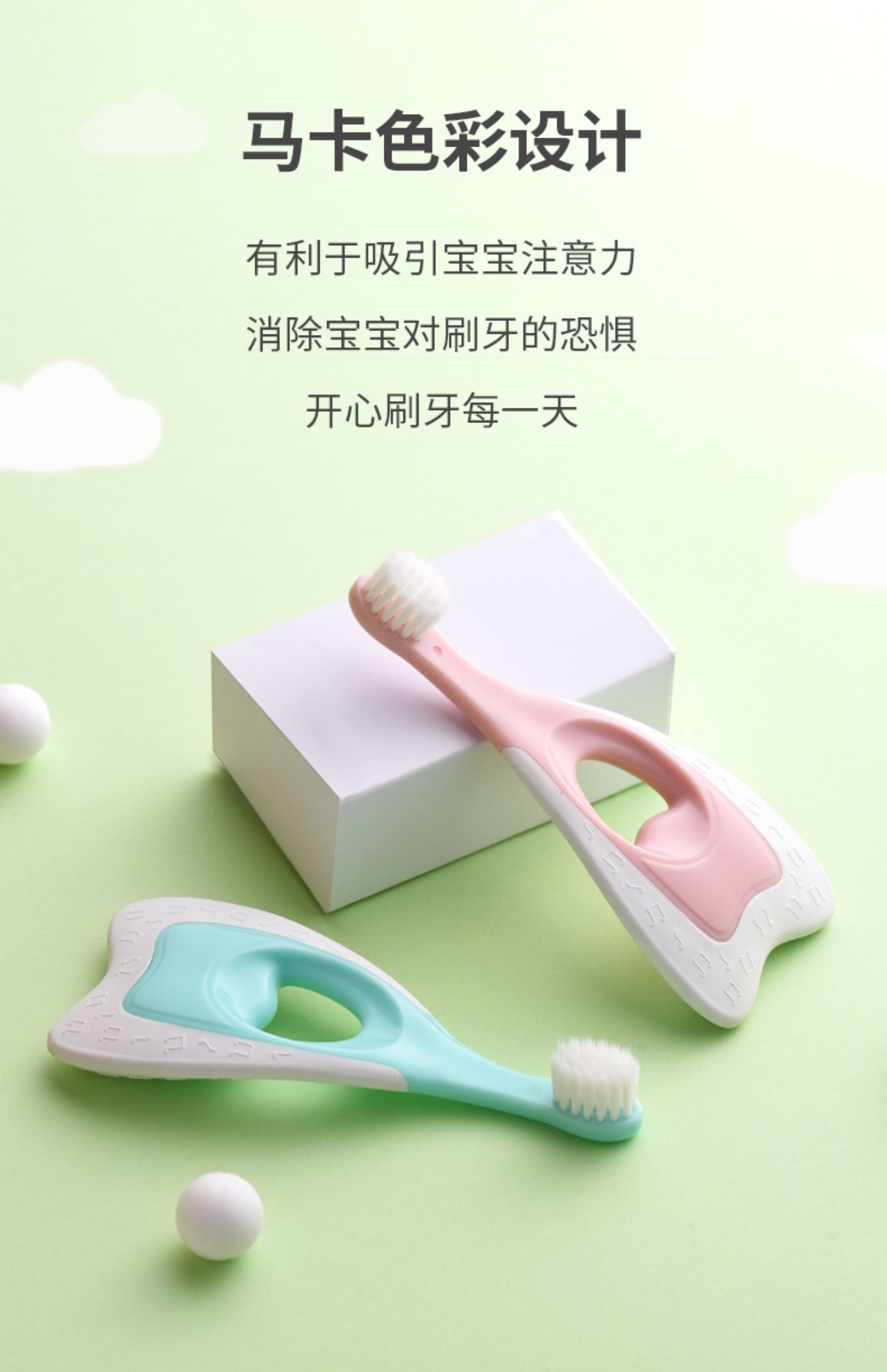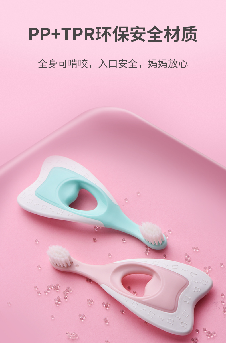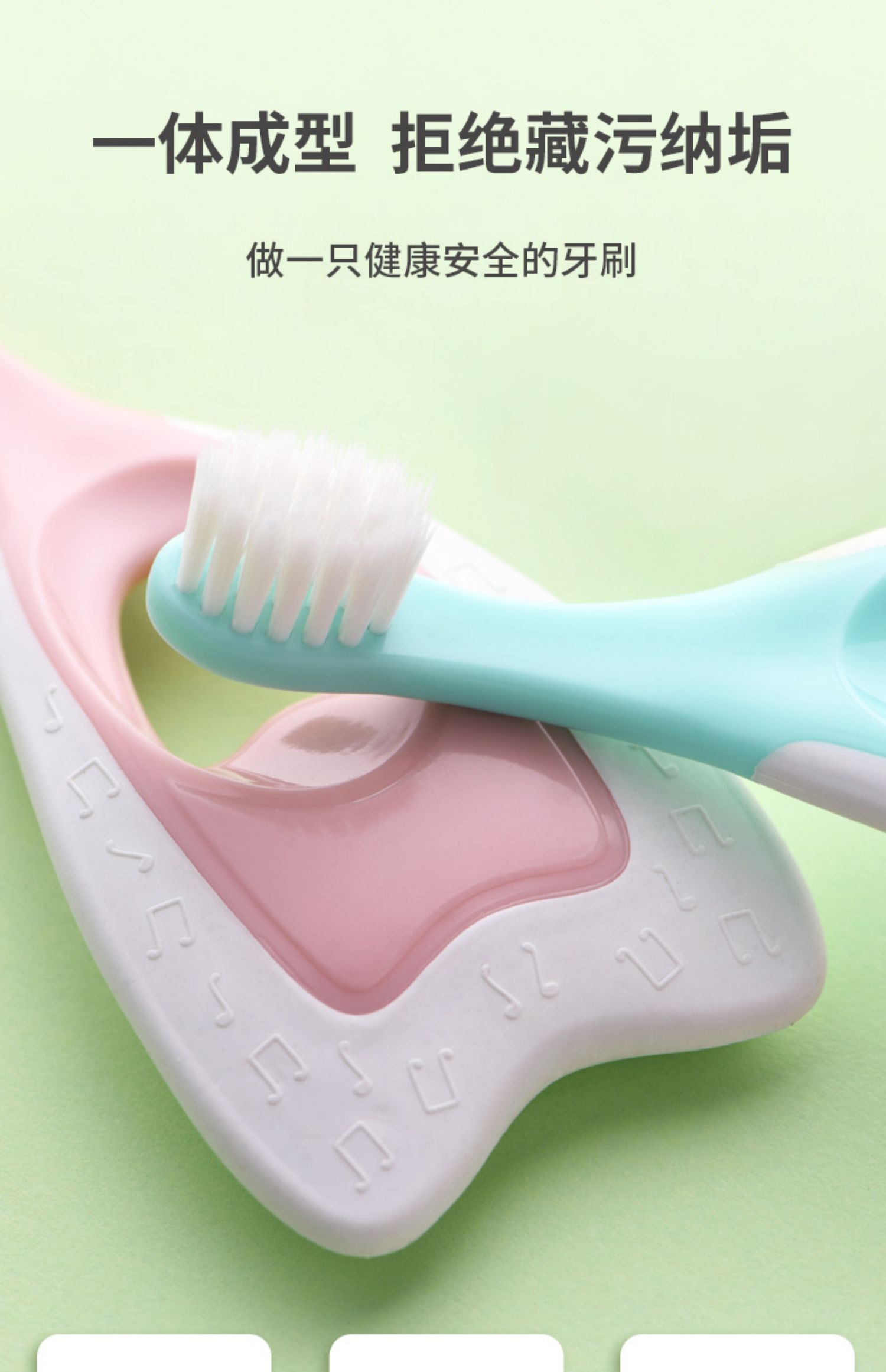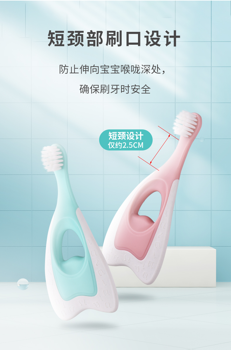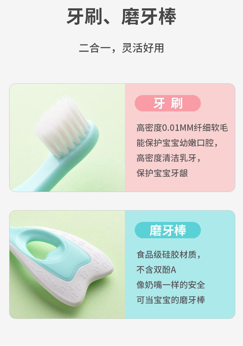 【专为宝宝设计】进口安全品质,抗菌小巧软刷丝,护龈抑菌,呵护宝宝口腔健康,防滑加大手柄,方便宝宝抓握,短颈加宽设计不会伤到宝宝喉咙,牙胶还能有效缓解宝宝出牙不适