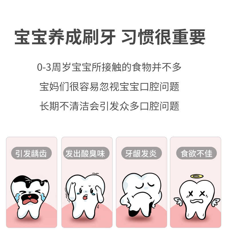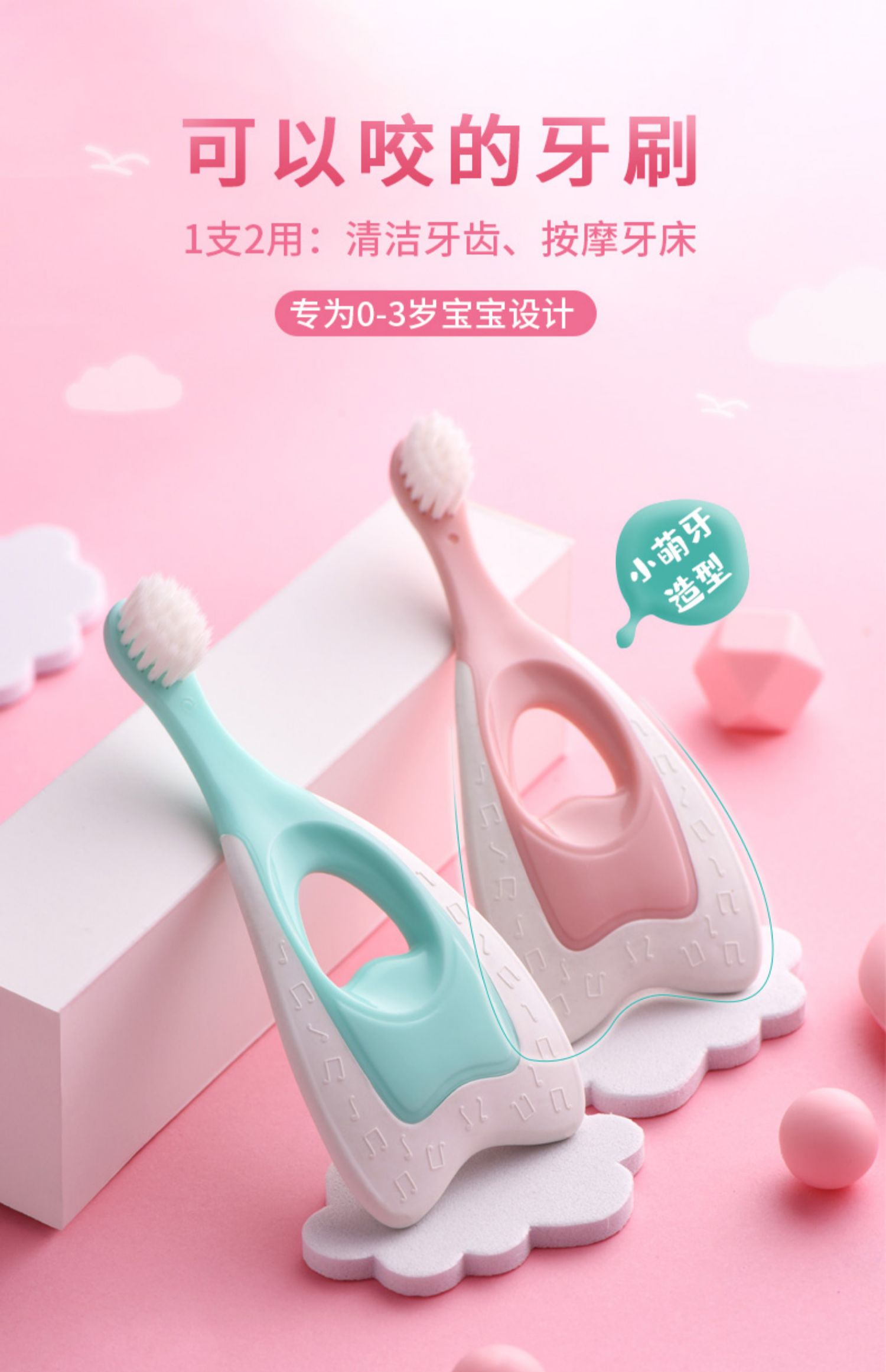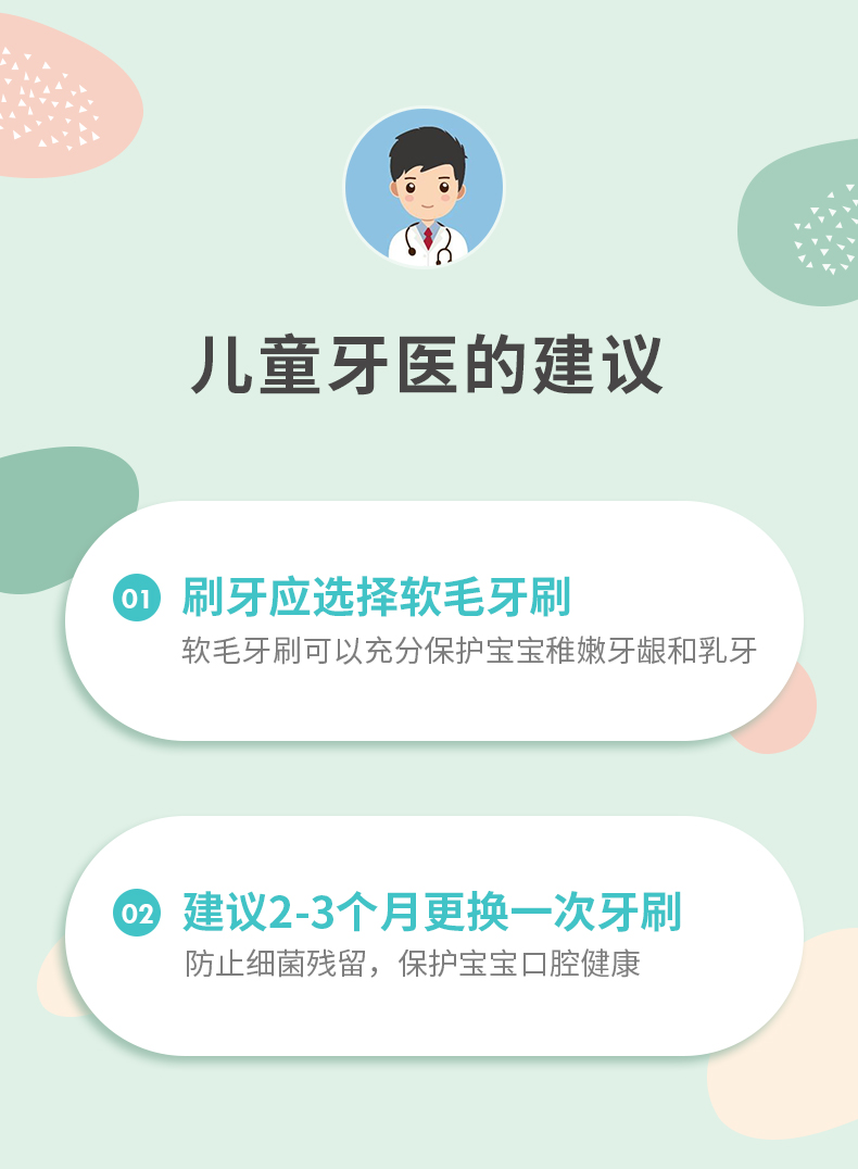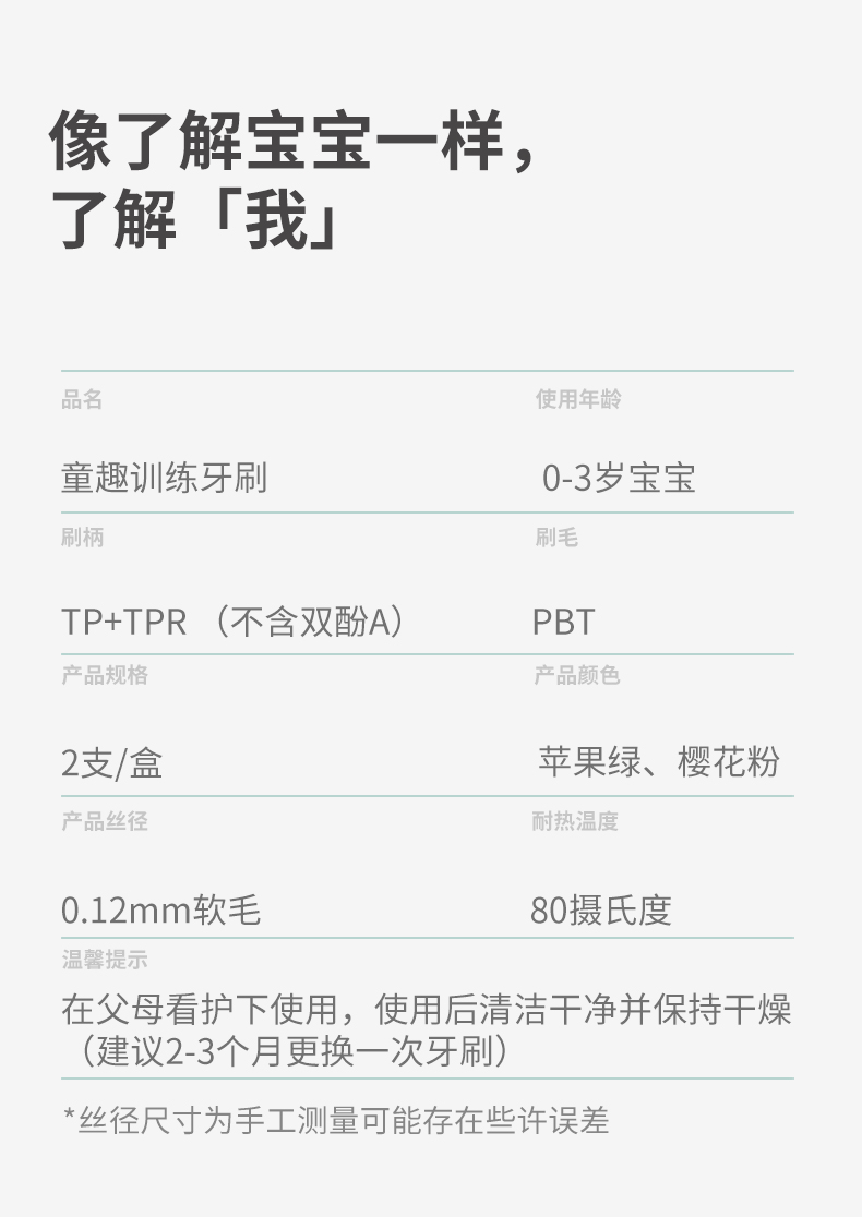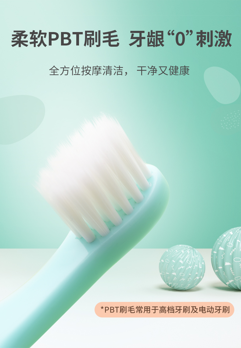 【专为宝宝设计】进口安全品质,抗菌小巧软刷丝,护龈抑菌,呵护宝宝口腔健康,防滑加大手柄,方便宝宝抓握,短颈加宽设计不会伤到宝宝喉咙,牙胶还能有效缓解宝宝出牙不适