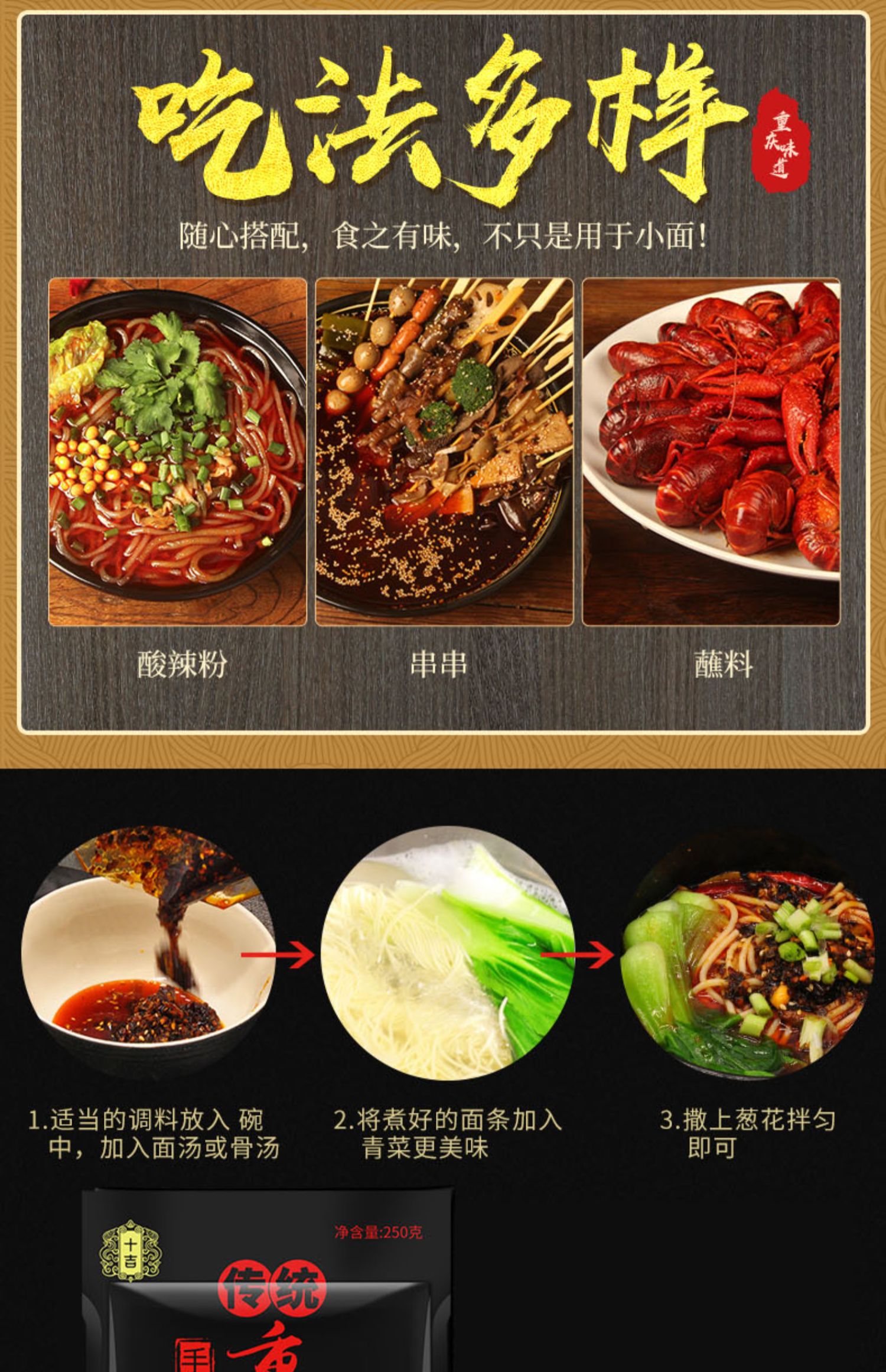 十吉重庆小面来啦!原味鲜香,香辣带劲,食用方便,调味好帮手,带你回味经典美味~引爆您的味蕾~适用于小面、拌面,各种美食的搭配!吃到过瘾~