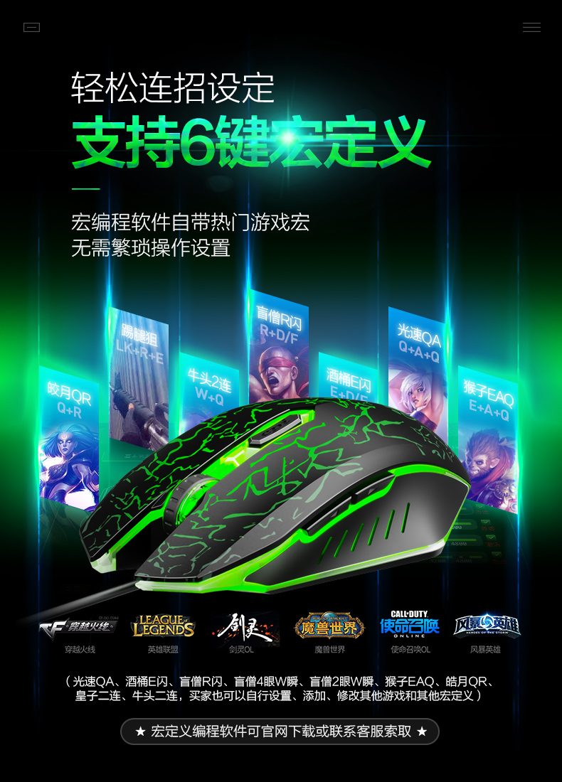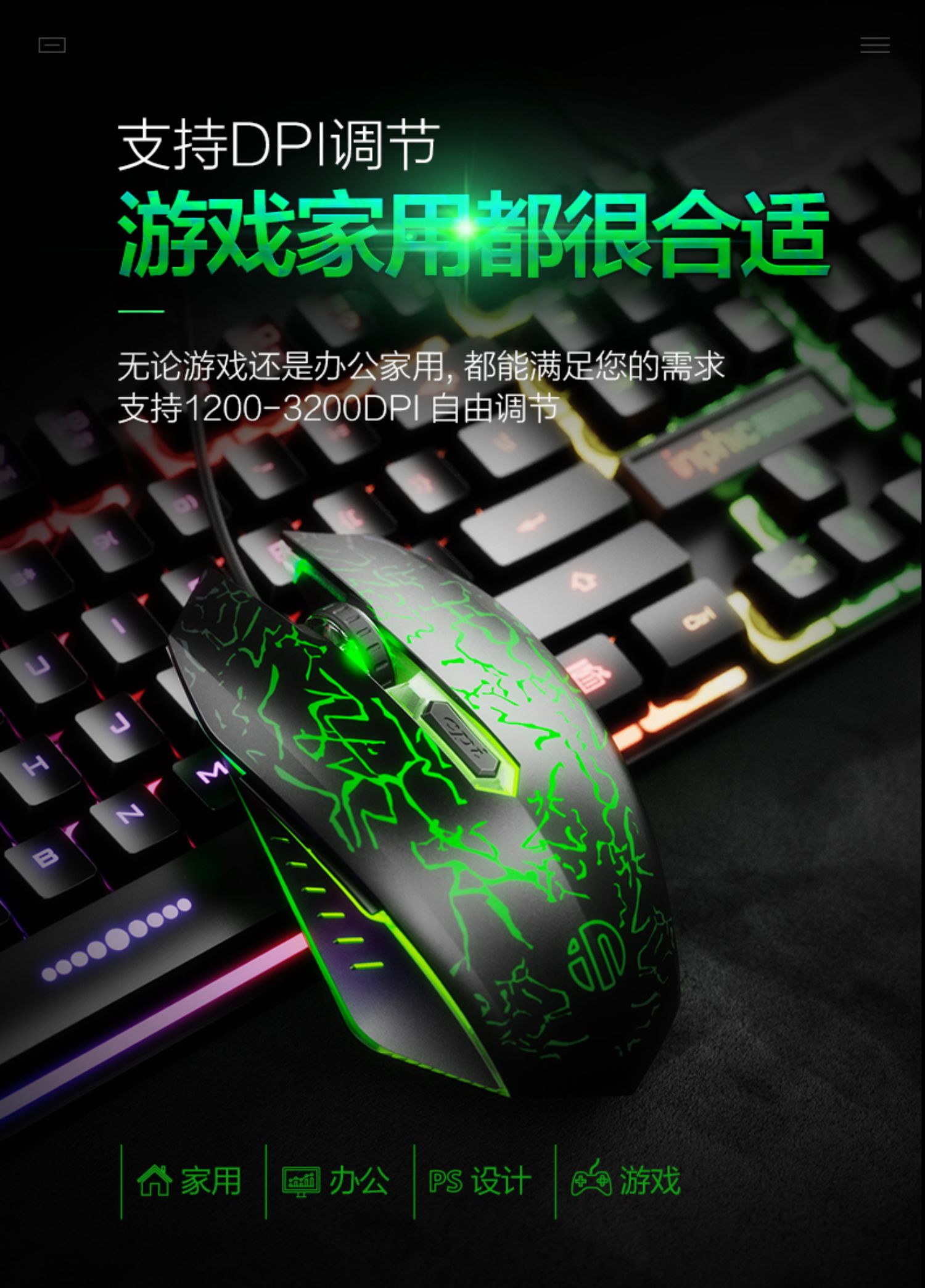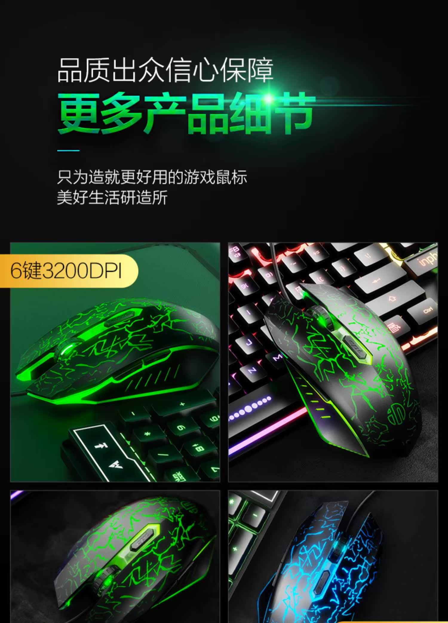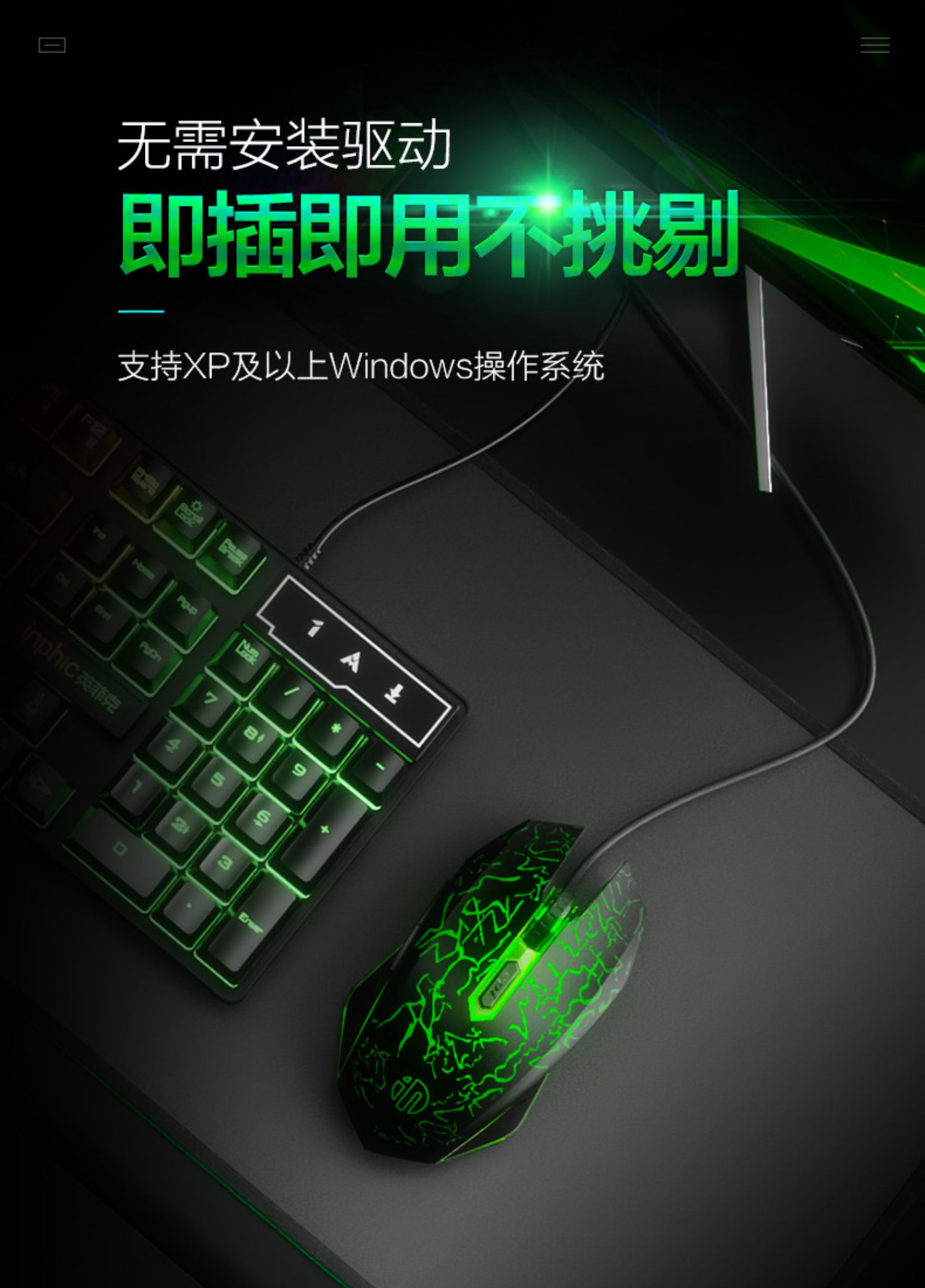 英菲克大牌!纯正机械手感,多彩呼吸炫光,电竞级微动开关,操作更顺畅,专业级游戏光学引擎,操作更稳定!人体工学设计。握感更舒适,游戏玩家的挚爱~