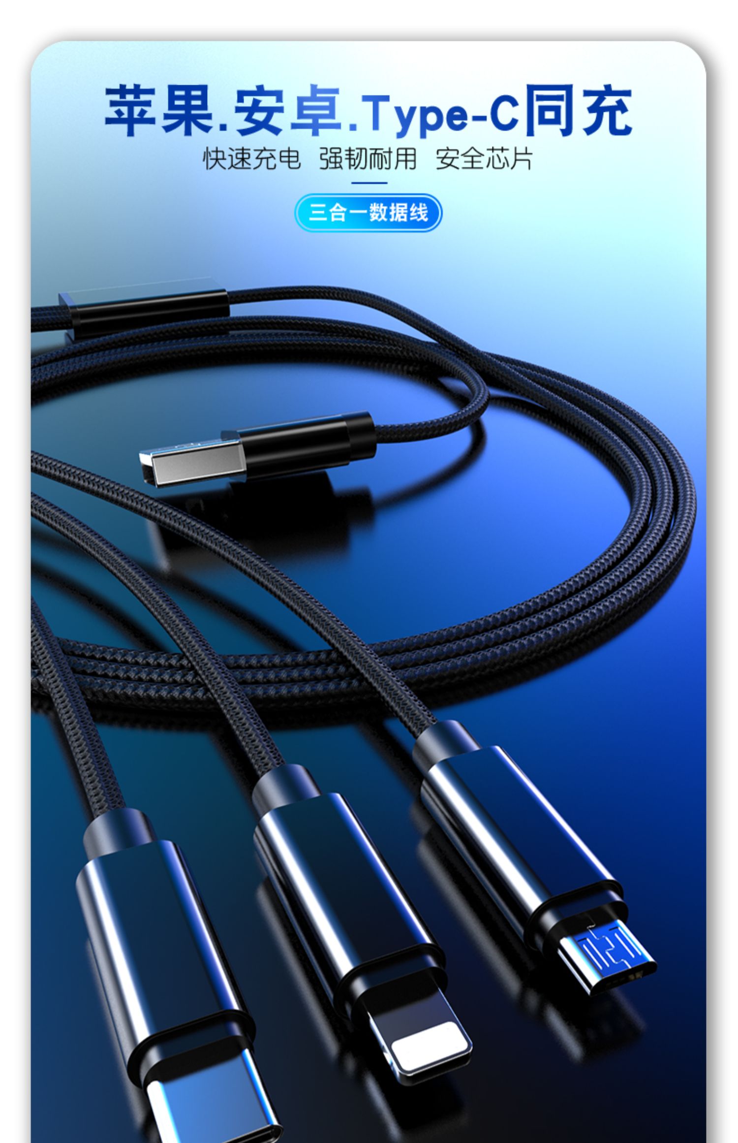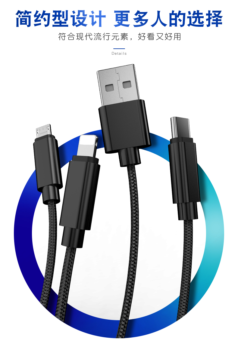苹果,安卓,typec三合一同充数据线~符合现代流行元素,好看又好用~新型智能芯片,延缓手机电池老化,安全防过充~支持绝大多数型号手机,平板等设备!