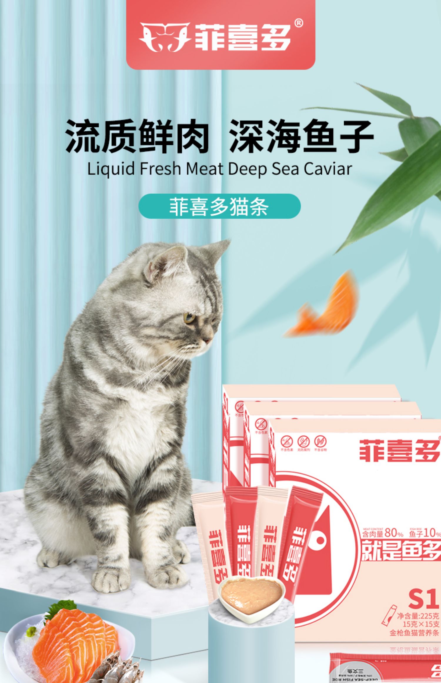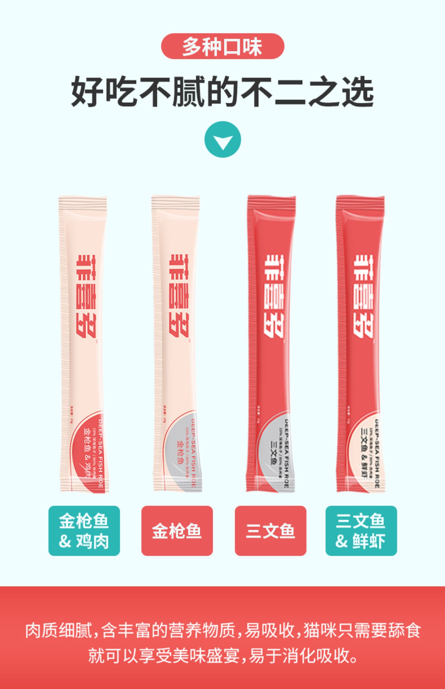 菲喜多咪独立包装零食,鲜条,营养,增肥,低脂,甄选食材,美味营养,易舔易食,口感丰富、健康强体,细腻柔滑入口即化,易于消化吸收,适宜单次喂食。