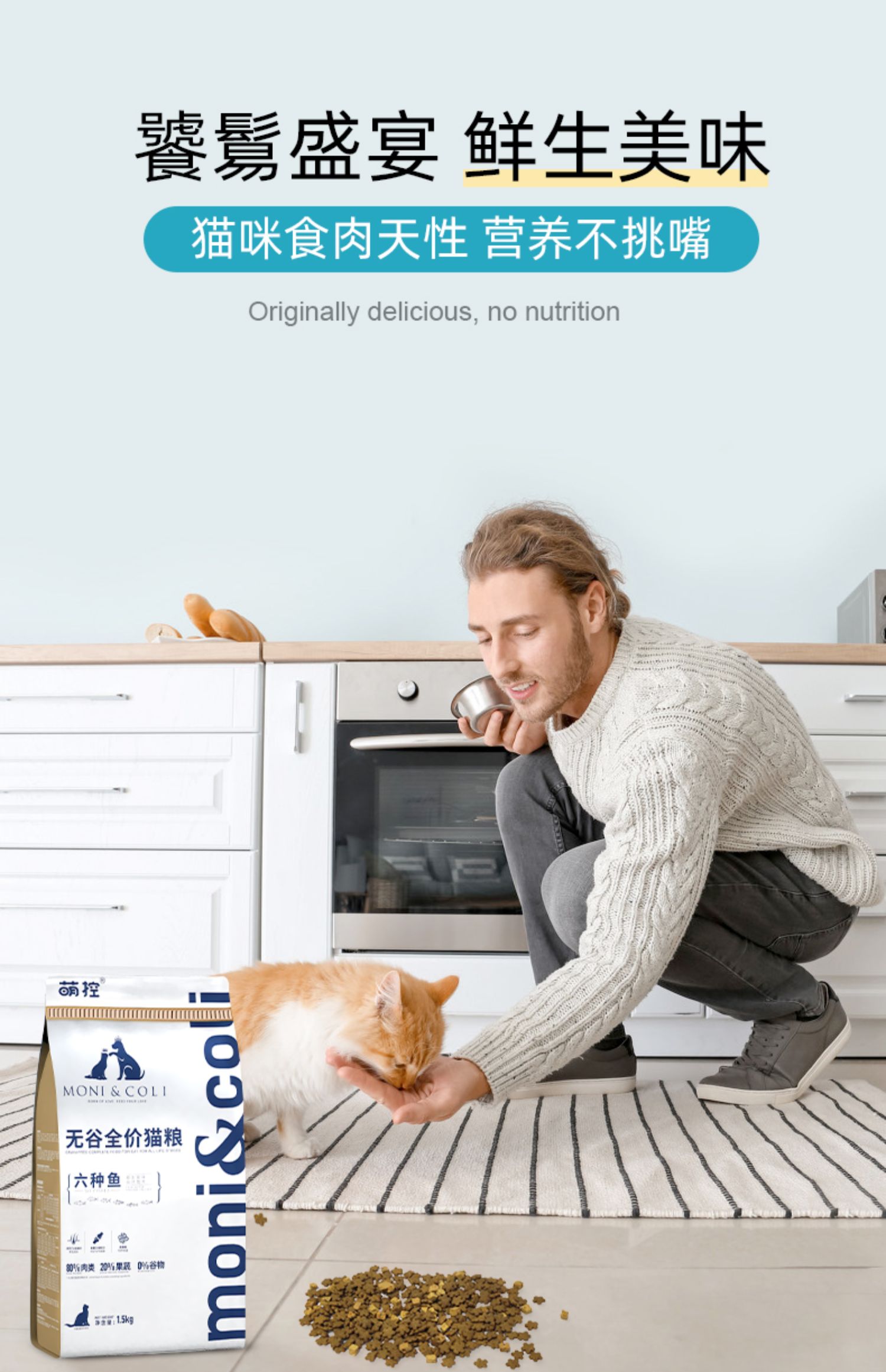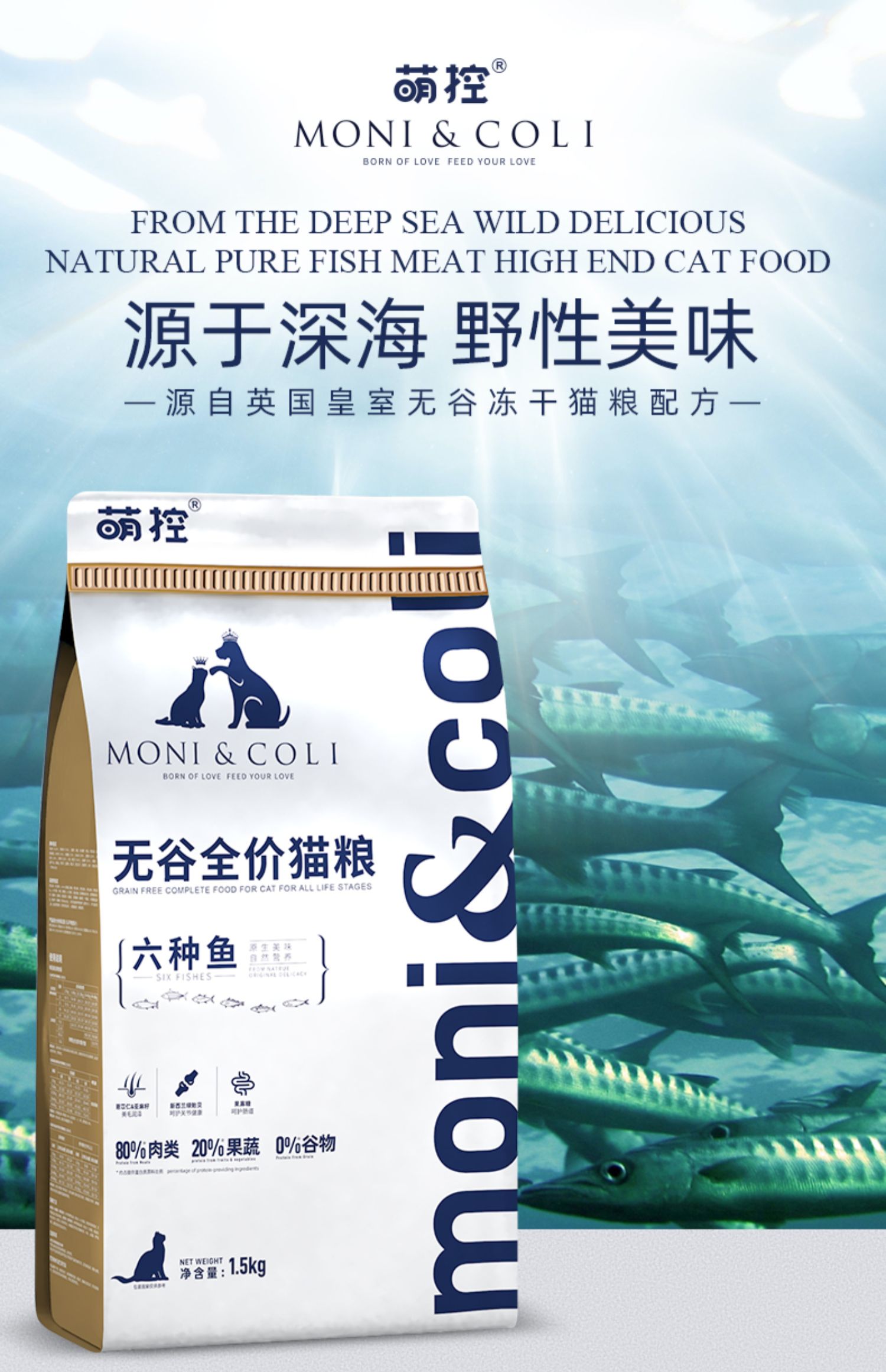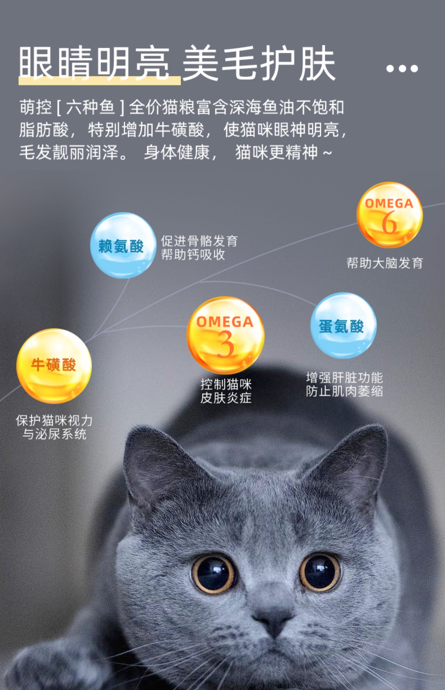 萌控【六种鱼】,全价猫粮富含深海鱼油不饱和脂肪酸,特别添加牛磺酸,使猫咪眼神明亮,毛发靓丽润泽。身体健康,猫咪更精神。【你的数十载,Ta的一辈子】,萌控。致力于呵护萌宠成长每一步。