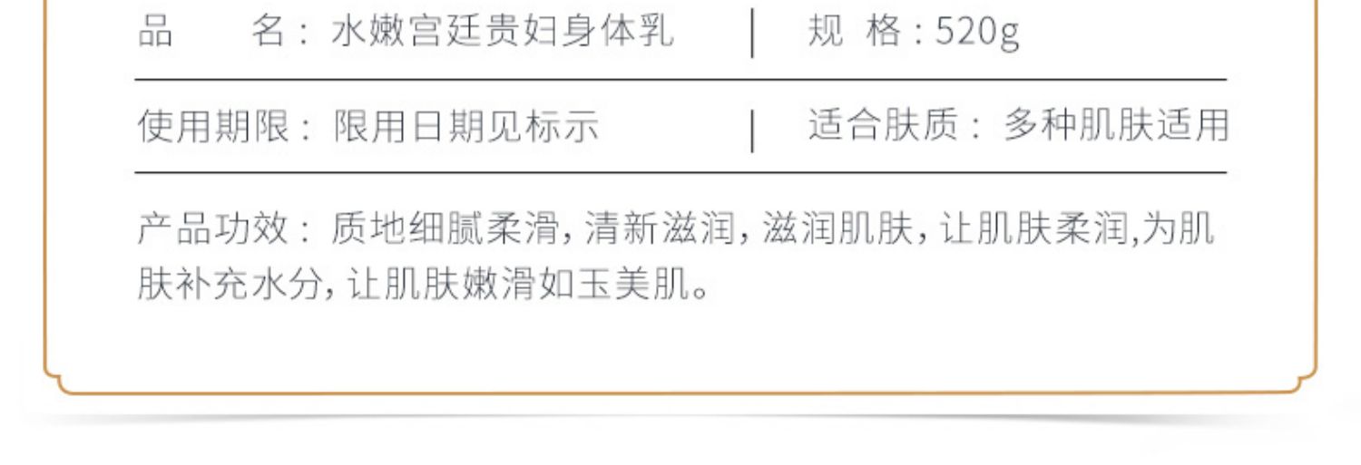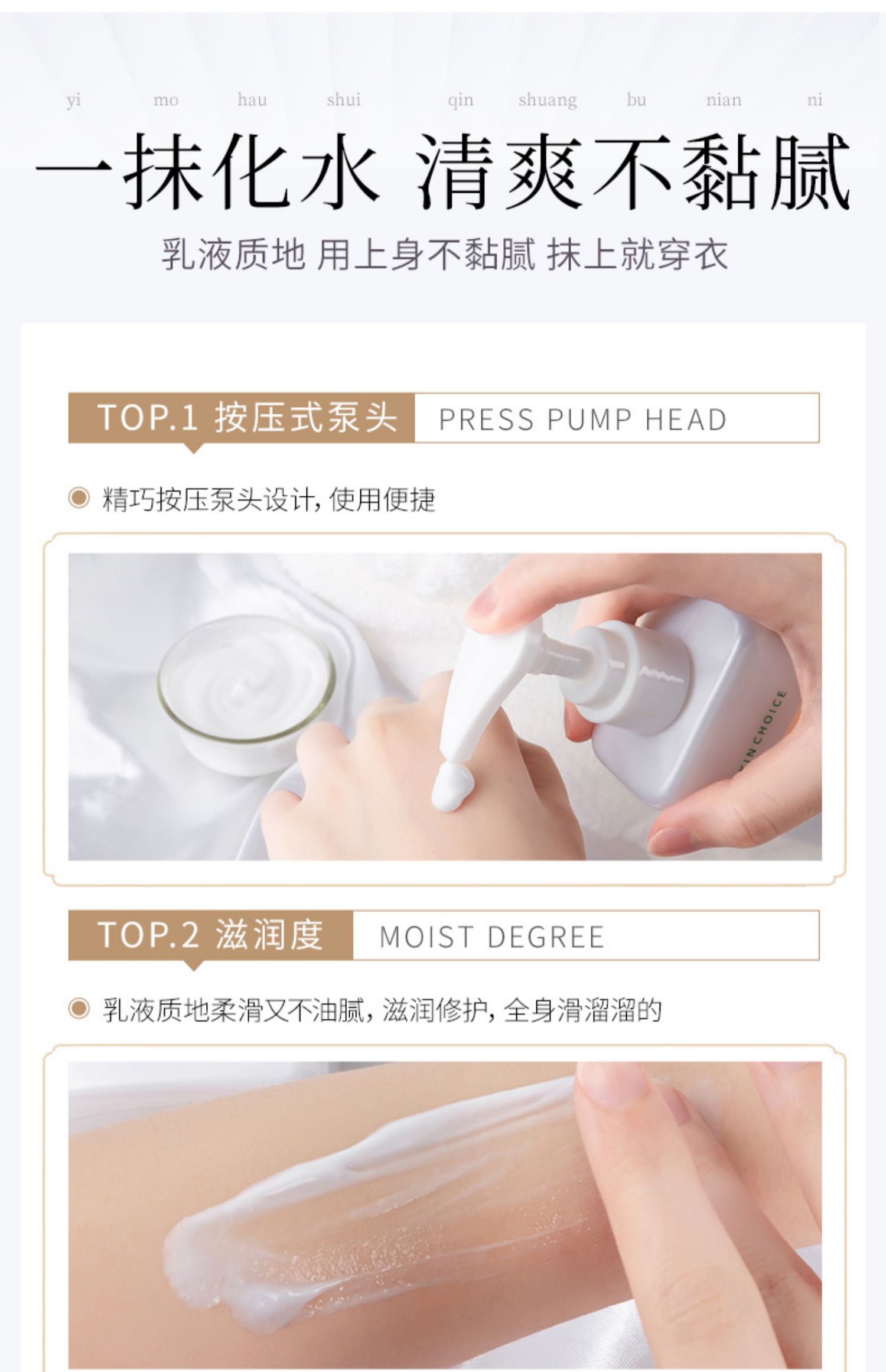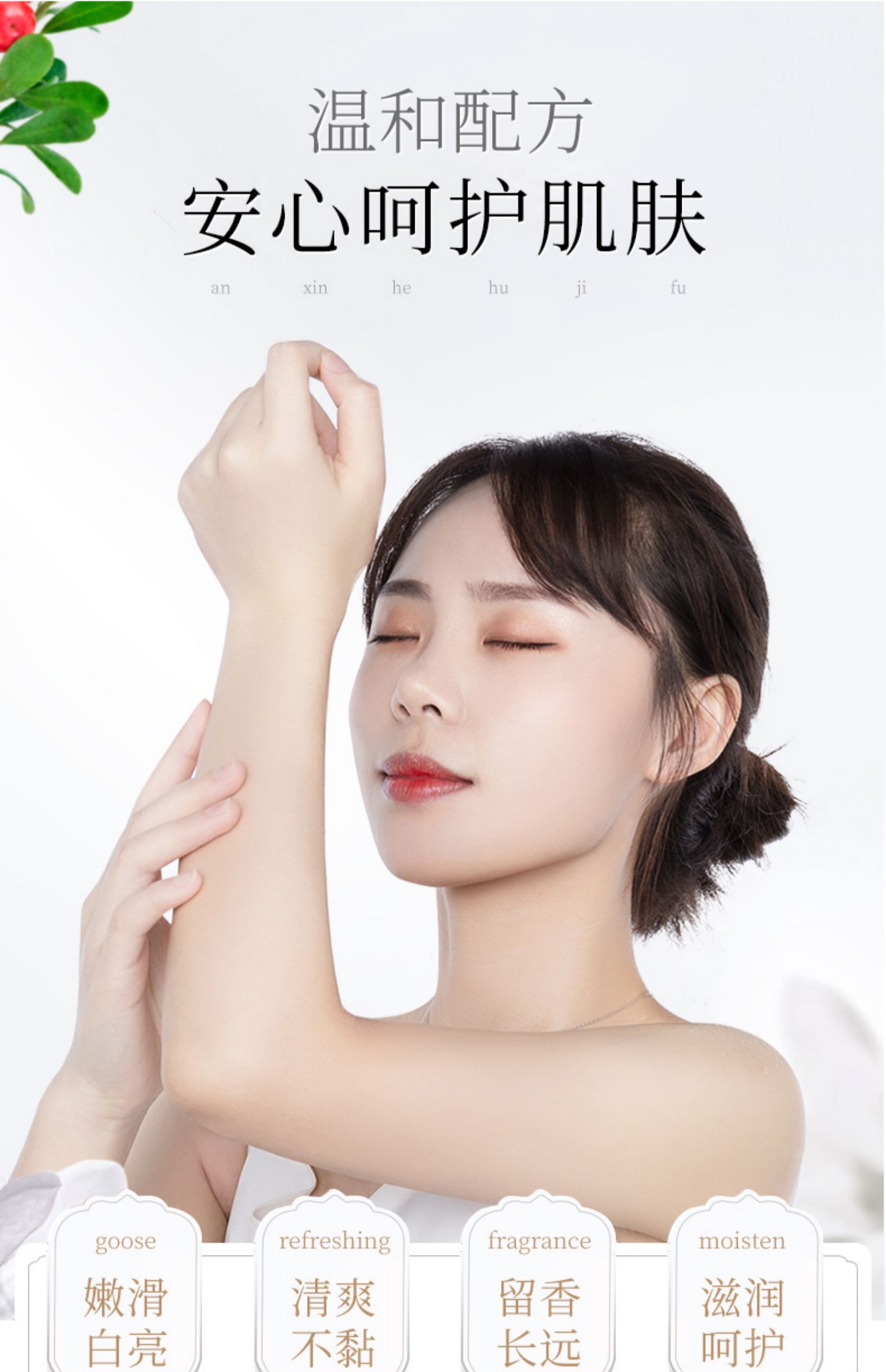 润肤补水身体乳,美白补水保湿,嫩滑皮肤,去角质去鸡皮肤都可,质地细腻柔滑,用完身体滑溜溜的,含有熊果苷、烟酰胺、人参精华等成分,温和配方,呵护身体皮肤~