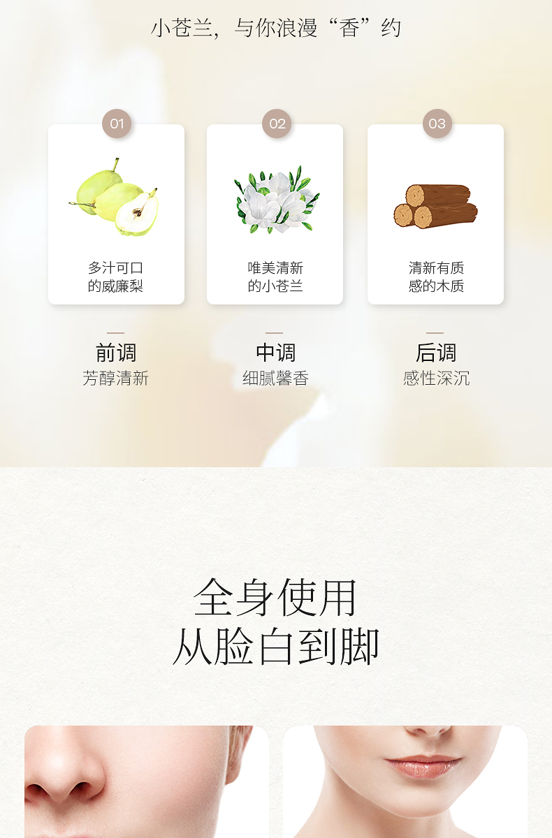 【持久留香】精选高纯度氨酰胺,有效抑制体内黑色素,改善肌肤暗黄,深入美白修复,双重焕白成分,多倍透亮,滋润保湿,提亮肤色,小苍兰花香,留香更持久,魅力超加分!