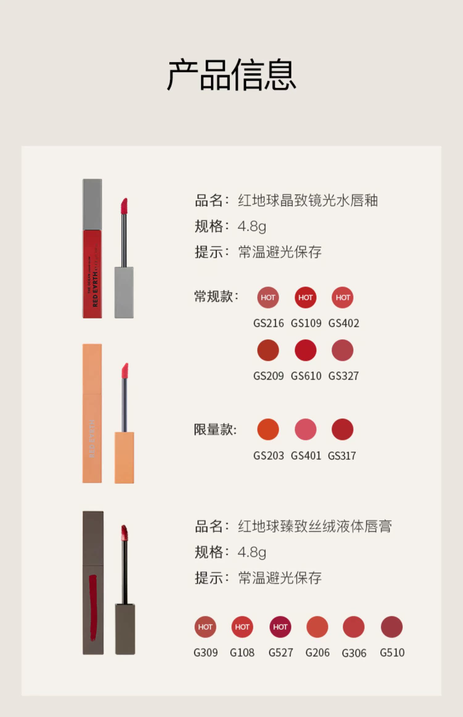 第二件9元拍两件到手78平均一只39。美到你走不动路的红地球新品水光唇釉。让你的嘴唇有一种肉嘟嘟的可爱。上嘴一股香草味,质地不粘不染唇不拔干,6个型号,可盐可甜,都超温柔