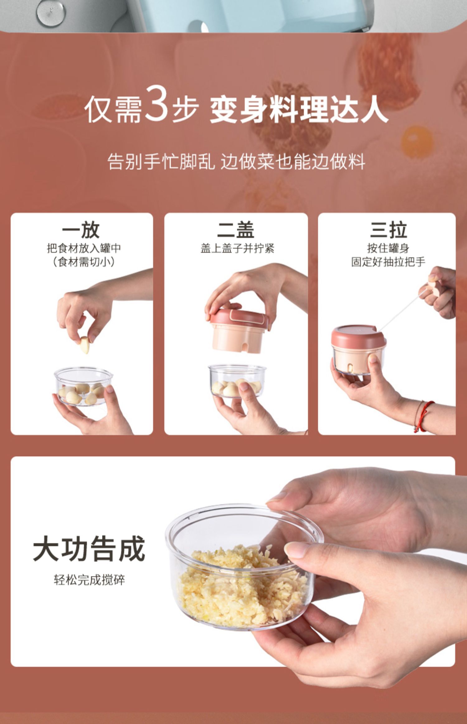 【赠运费险】新一代厨房神器,堪称厨房贤内助!一拉一拽轻松制作各种馅料、佐料等,量少也能碎,真实效果看得见!三部秒拆卸,清洗方便,原生材质不含BPA,安全无异味,放心用~