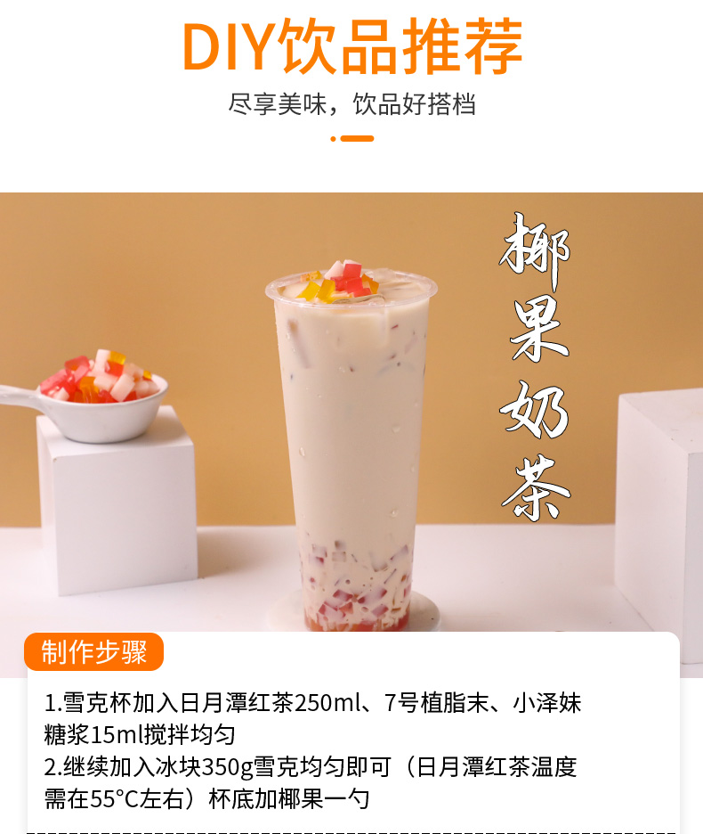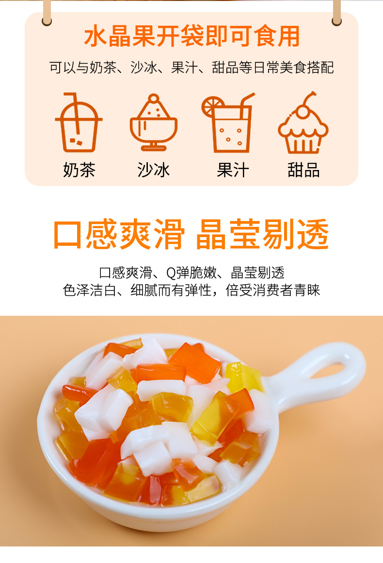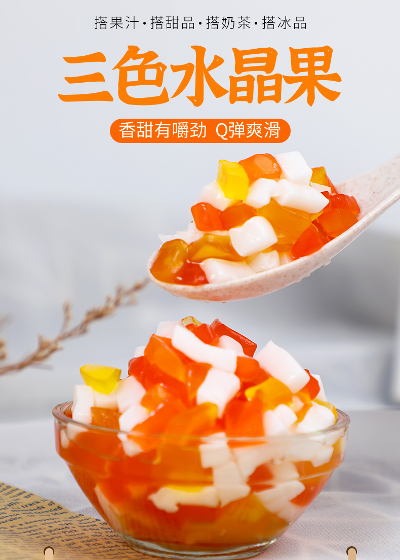彩色椰果粒奶茶店专用原材料,商用魔芋块蒟蒻三色水晶果,香甜有嚼劲,开袋即可食用,可以与奶茶,冰沙,果汁,等日常甜品搭配,尽享美味。