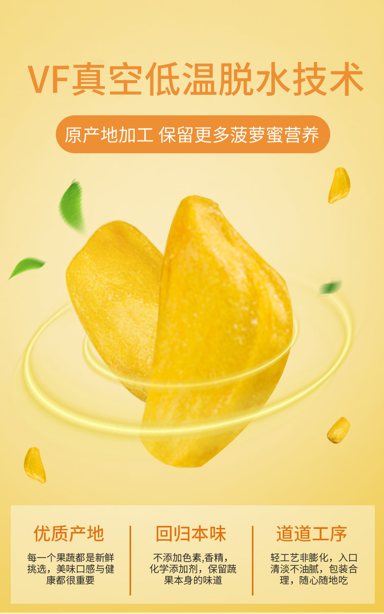 原色原香,保留营养,清甜儿不腻,酥脆爽口,优选果肉金黄肉质饱满的鲜菠萝蜜,真空低温脱水技术,不甜腻不生涩。