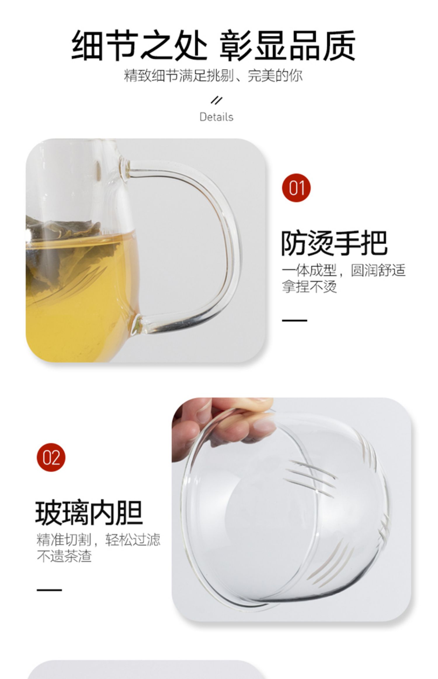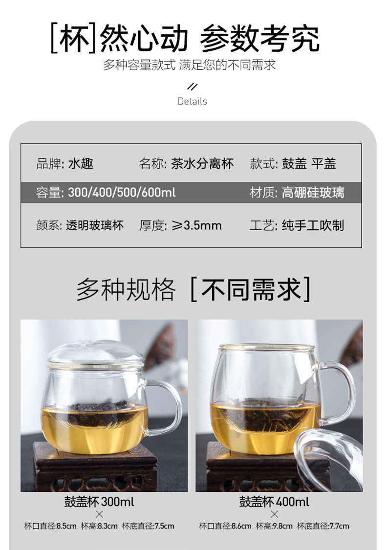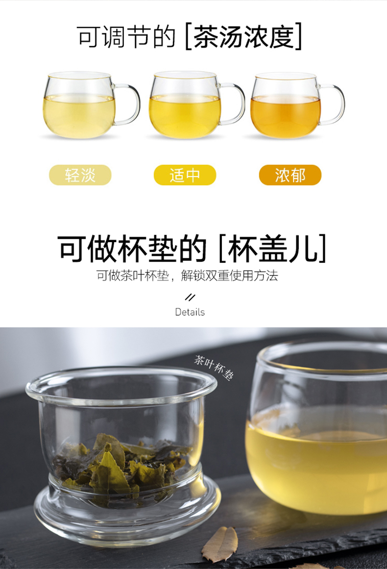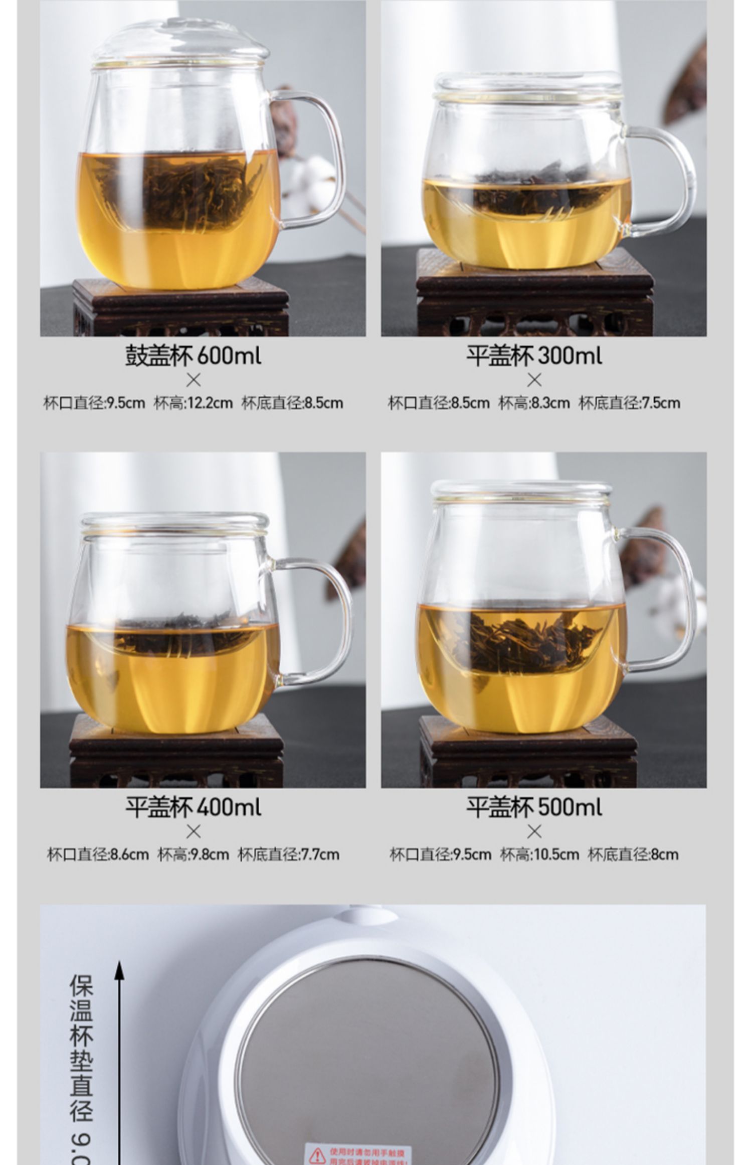 【送杯垫和杯刷】高硼硅玻璃三件杯,可明火加热,升级加厚防爆,高评分,回头客挚爱,圆润杯,玻璃茶盖+玻璃内胆+玻璃杯身三件套。【赠运费险】